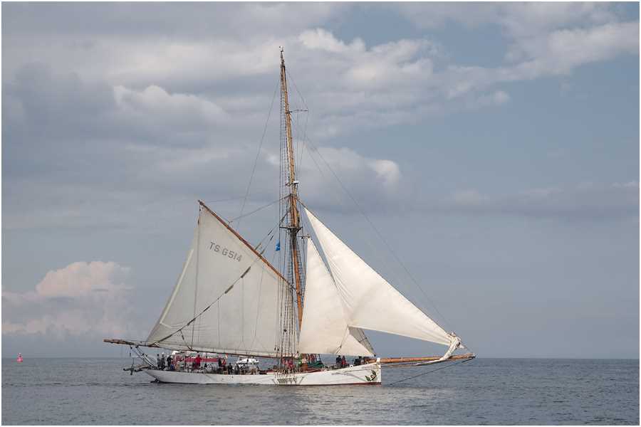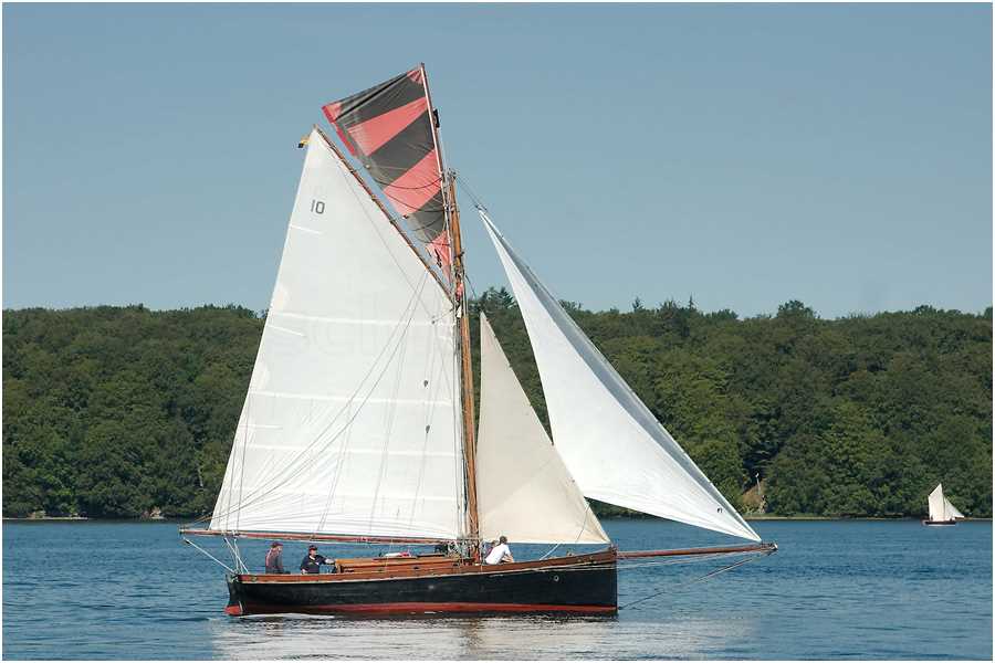 An dem langen, fast waagerecht herausragenden einholbaren Klüverbaum wurde ein großes Dreieckschratsegel gefahren. Diese sicher schwierige und nur auf Kriegsschiffen mit größerer Besatzungszahl bedienbare Takelage wurde in den folgenden Zeiten vereinfacht. Nach und nach verschwanden die Quersegel, an dem verhältnismäßig hohen, durch eine Maststenge auf über 20 m verlängerten Mast wurde um 1900 nur noch das Gaffel-Großsegel und darüber ein größeres Viereck-Gaffeltoppsegel gefahren.