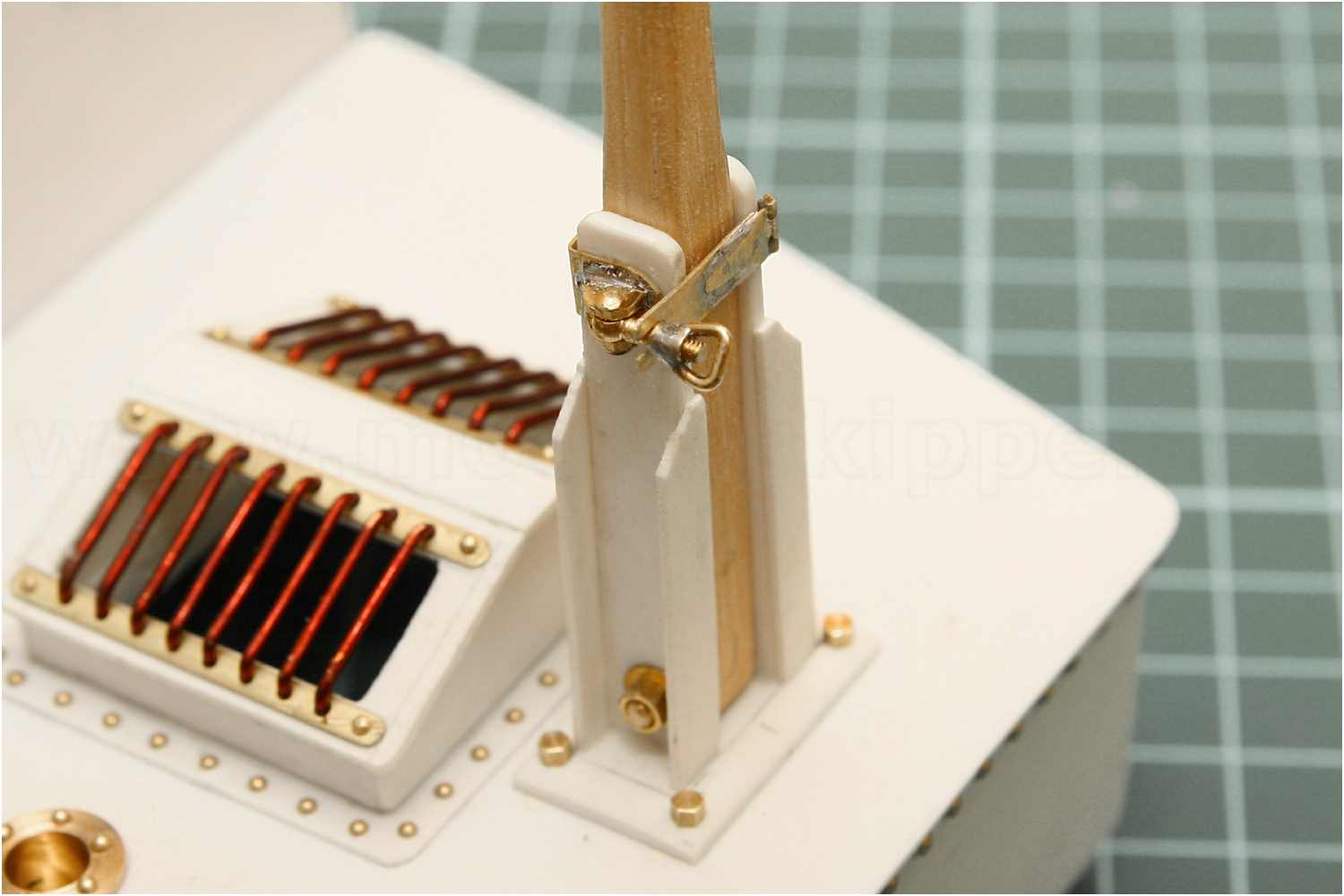 Damit das recht fix und ohne großen Aufwand bewerkstelligt werden kann, ist im oberen Teil des Mastfußes ein Scharnierbeschlag angebracht.