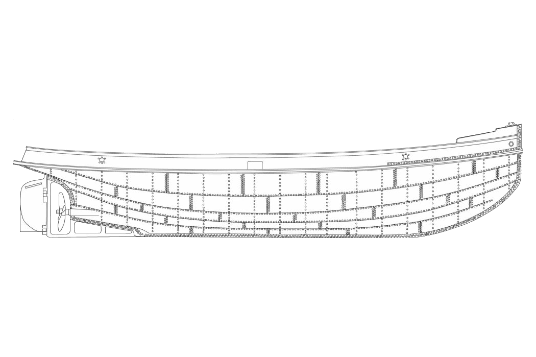Erwähnt werden muss noch, dass nur etwa jeder dritte Spant dargestellt wird und die Plattenstöße statt eine Original-Vierer- nur eine Doppelreihe erhalten werden. Auch die Abstände der Niete zueinander werden maßstäblich nicht so eng sein. Dies ist ein guter Kompromiss und lässt sich mit dem zur Verfügung stehenden Budget realisieren.