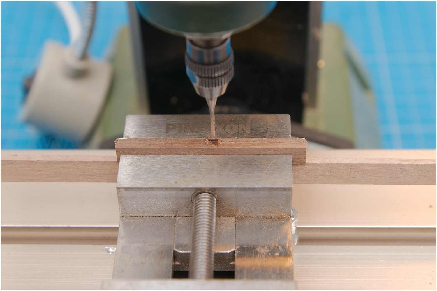 Für den Ankerstock habe ich diesmal die zwei Leisten mit doppelseitigem Klebeband zusammengeklebt, auf der einen Seite eine Formschablone aufgebracht, Löcher für die Bolzen gebohrt und in die Mitte ein Vierkantloch für den Ankerschaft gefräst.
