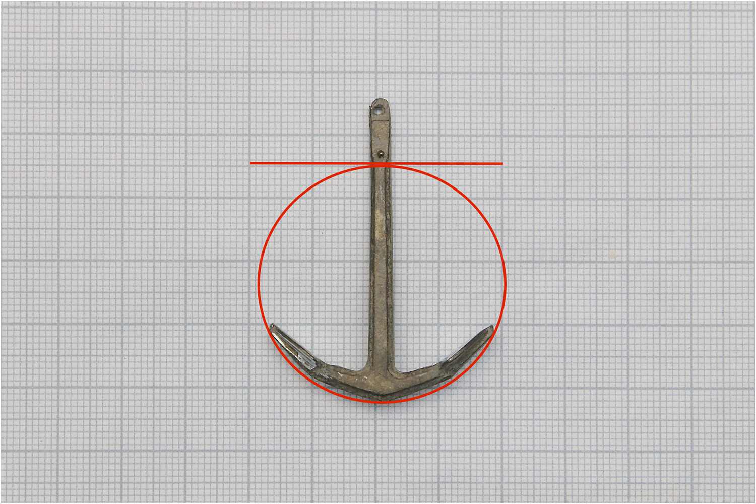 Auch die Proportion ist nach MF S. 201 nahezu ideal, ist nahezu ideal, wie man am Verhältnis der Arme (roter Kreis) zur Position der Unterkante des Ankerstocks (rote Linie) gut erkennen kann.