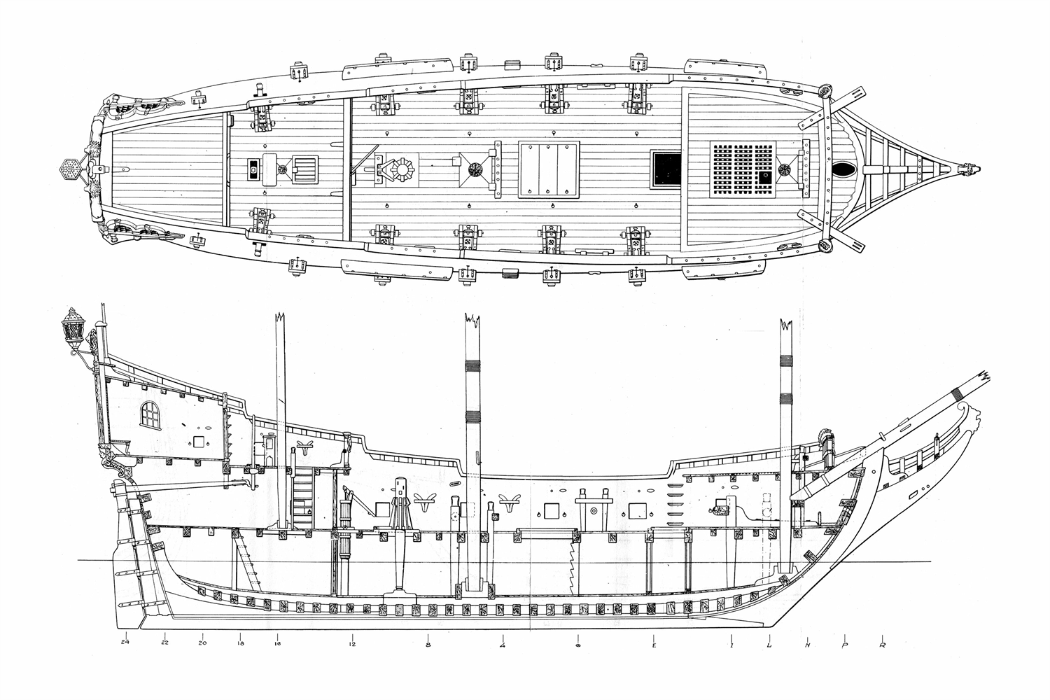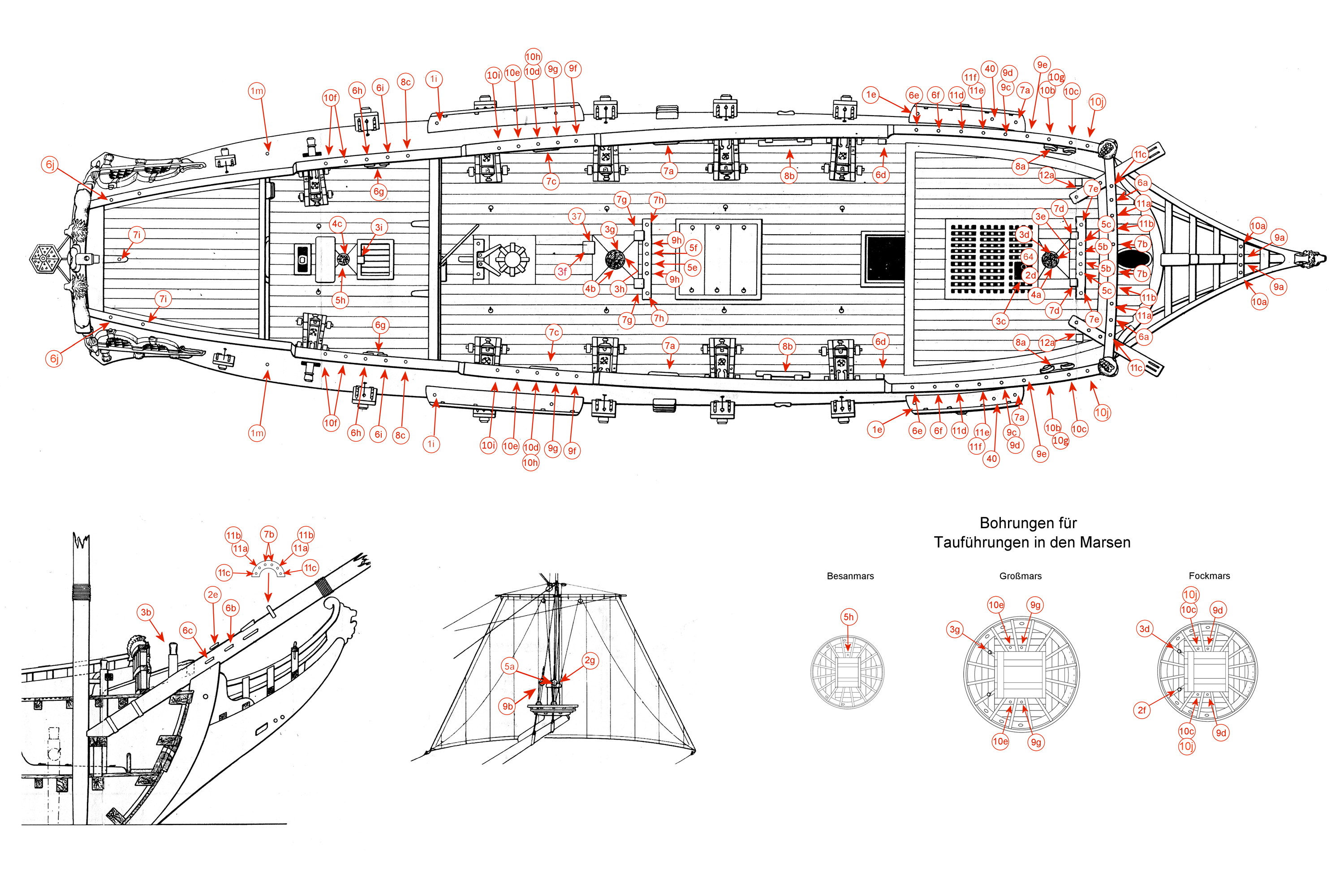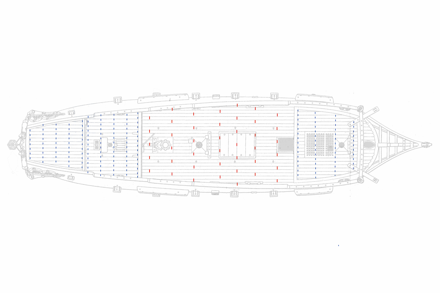 Das Muster der Plankenstöße auf dem Hauptdeck ist rot gezeichnet und die Ebenen der Decksnagelung blau für Back, Kampanje und Hütte. Letztere Decks haben keine "tragende" Funktion und die Planken sind so kurz, dass sie nicht gestoßen werden müssten.
