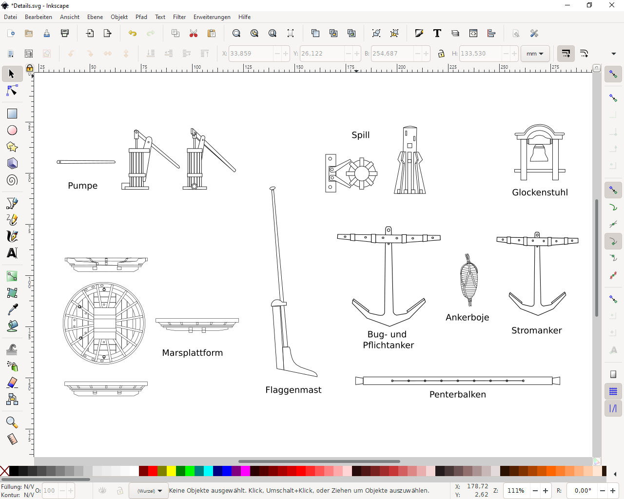Werden einzelne Details im Plan nur unvollständig gezeigt, sind nicht vorhanden oder können durch Scanfehler nicht genau reproduziert werden, lade ich die gescannten Bilder mit Inkscape und vektorisiere die Pixelgrafiken. Unvollständige Details, wie z.B. Draufsicht auf die Marsplattformen werden mit anderen Quellen abgeglichen. Die Zeichnung kann als PDF-Datei geladen werden.