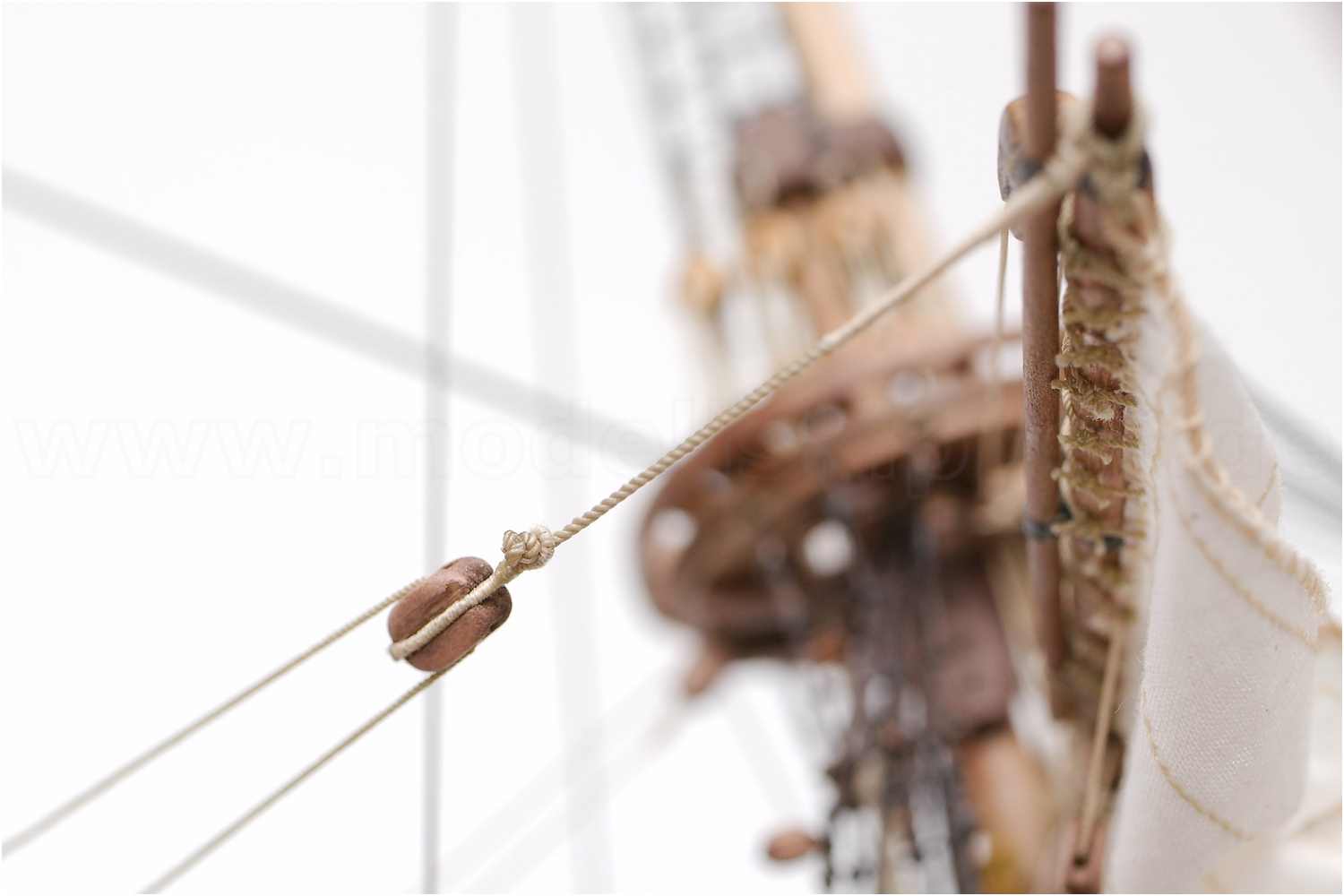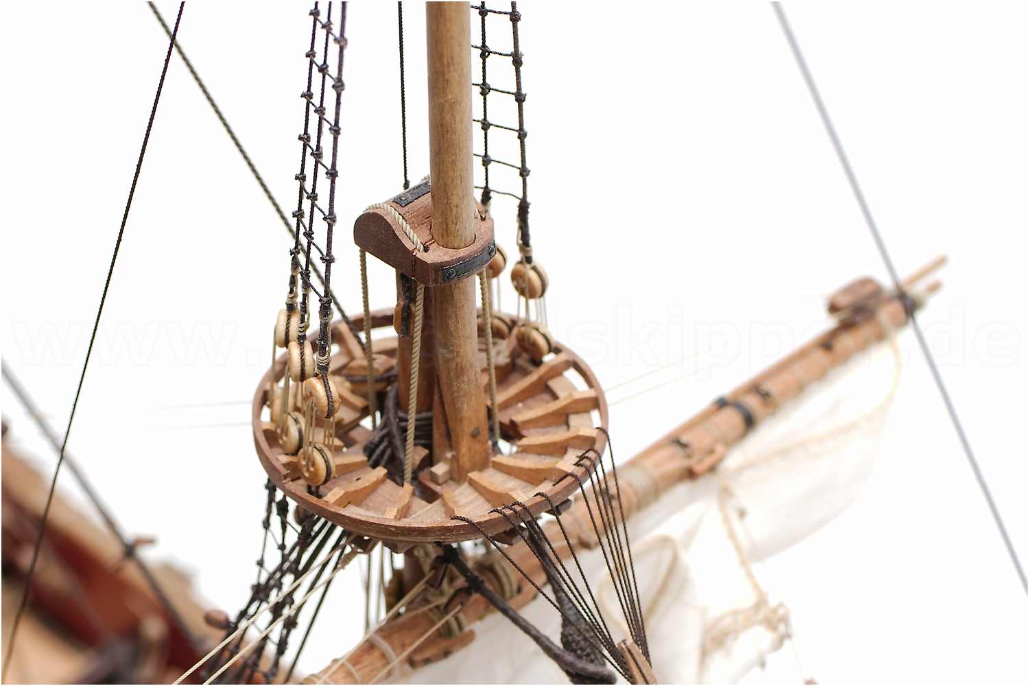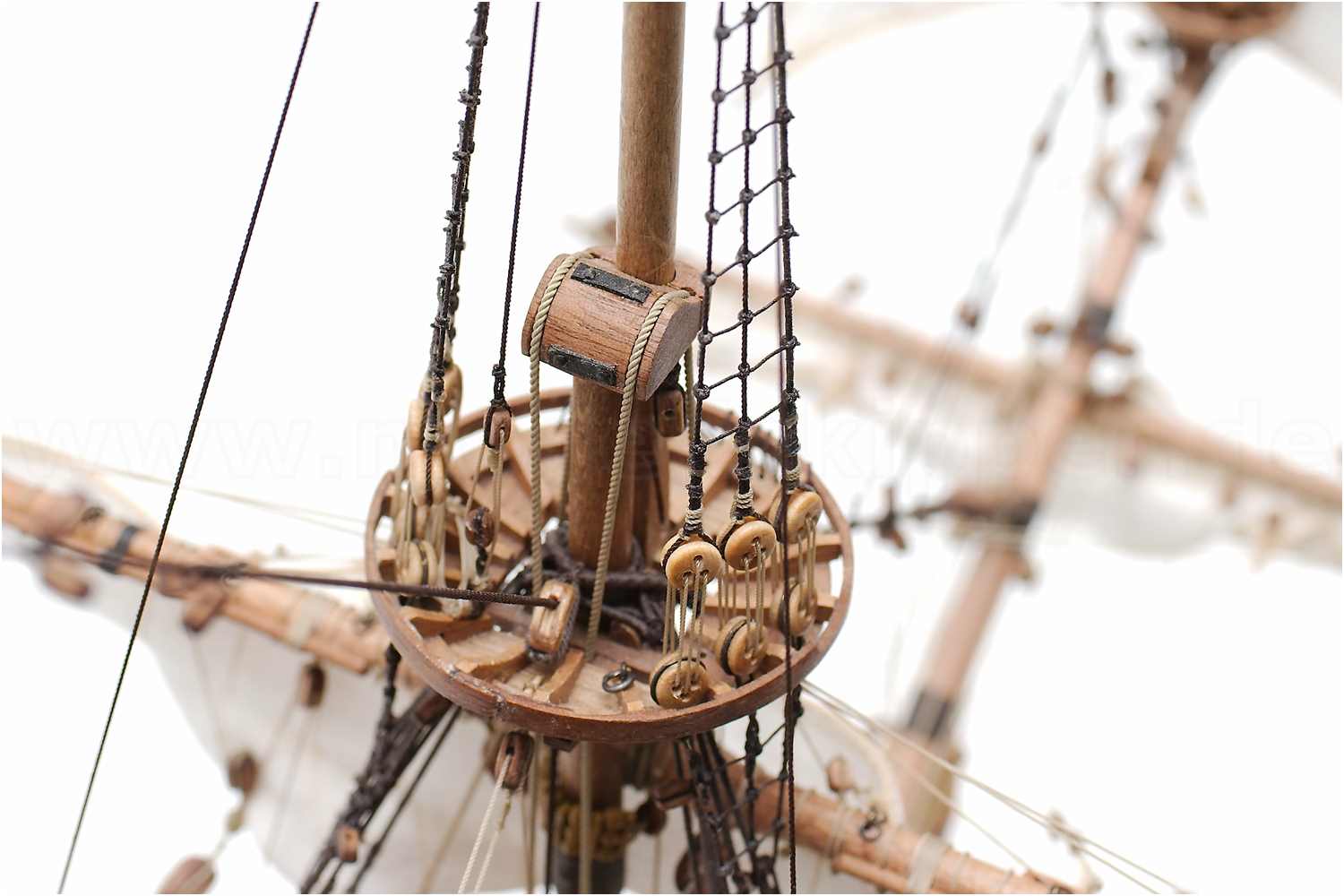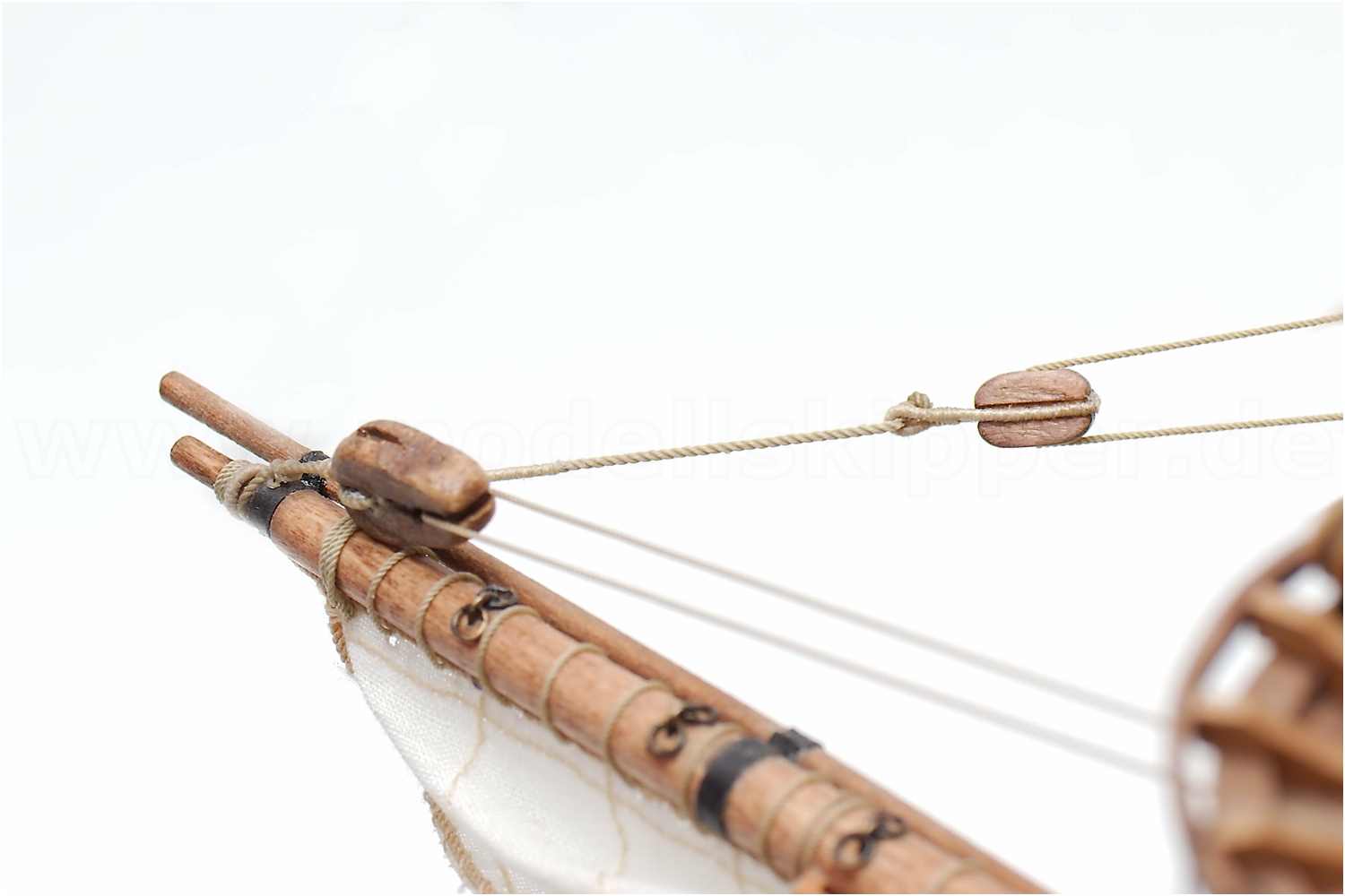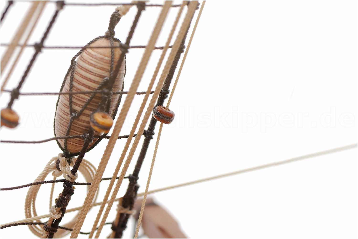 Stärke 0,7 der Fockwanten, bekleidetes Auge an der Rahnock, Stopperknoten am Ende Läufer: feste Part des Läufers angeschlagen auf dem Großstag über dem Stagleitblock wie MS 77 (87), läuft zum Schenkelblock, zurück über Stagleitblock mit kurzem Stropp wie AN 145 (183), fest an Knecht Bb/Stb hinter der Back Quellen: PW 45 (5), PW 90 (6), AT 78, MS 77, AN 143 |