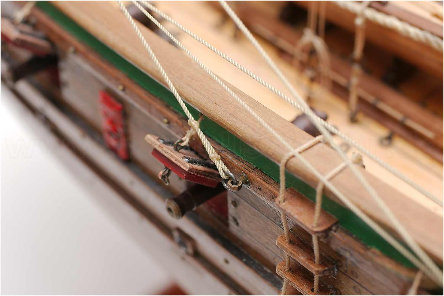 feste Part mit Aug- und Kneifbändsel an Ringbolzen wie AN 159 (205), fest an Ringbolzen Bergholz vor der Außentreppe, läuft über Schotblock, durch Scheibgatt in Schanzkleid vor der Großrüste, fest Hauptdeck am hinteren Kreuzholz Quellen: MS 79, PW 32 (34), PW 86 (1), AN 158 |