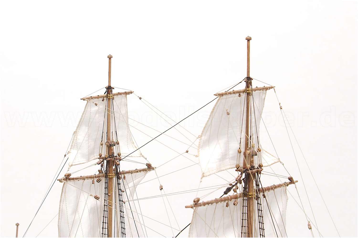Schenkel: bei AN 184 (247) zeigt Schenkel, ebenso am Modell der William Rex, Länge 0,4 der Rahlänge, bekleidetes Auge an der Rahnock, durch den Blockstropp mit Stopperknoten am Ende Läufer: feste Part kommt vom Großbramstag, fest über seinem Stagleitblock, läuft zum Schenkelblock an der Rah, zurück zum Stagleitblock zum Leitblock an hinterer Fockmarswant, über Leitkausch, fest Bb/Stb an Reling Backdeck Quellen: PW 90 (6), MS 84 |