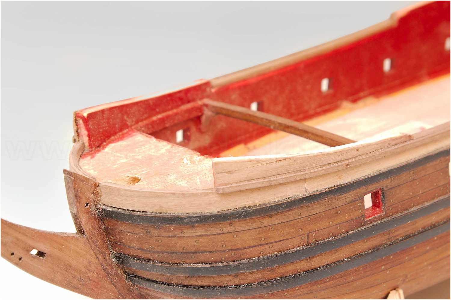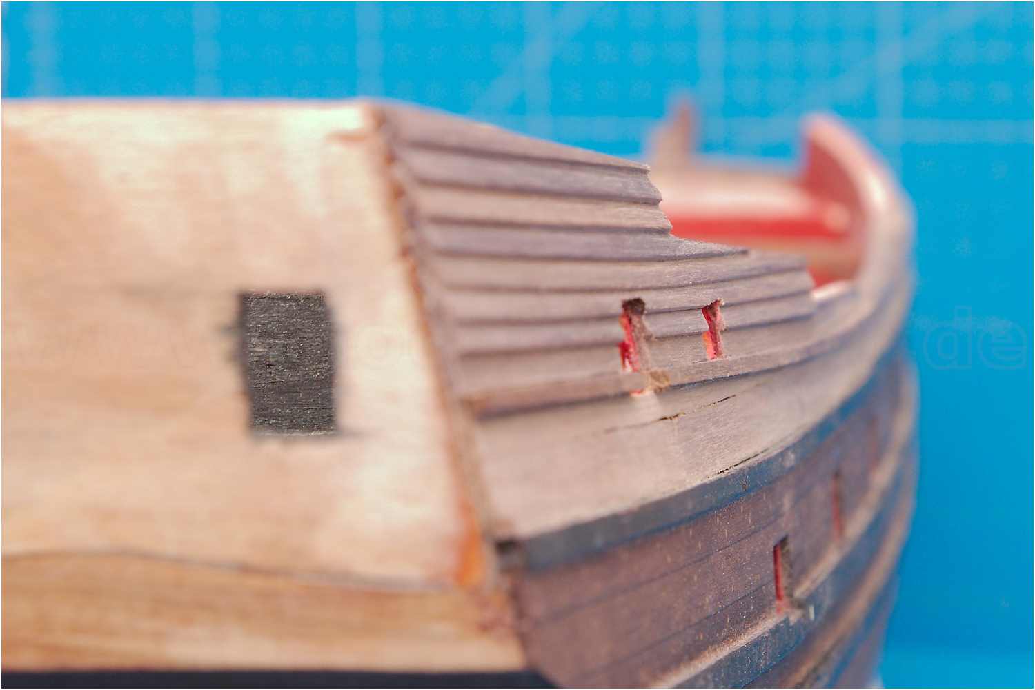 Vorher wurde von der Back, über dem Dollbord am Schanzkleid der Kuhl, bis zum Achterschiff durchgehend eine schmale Scheuerleiste aufgeklebt.