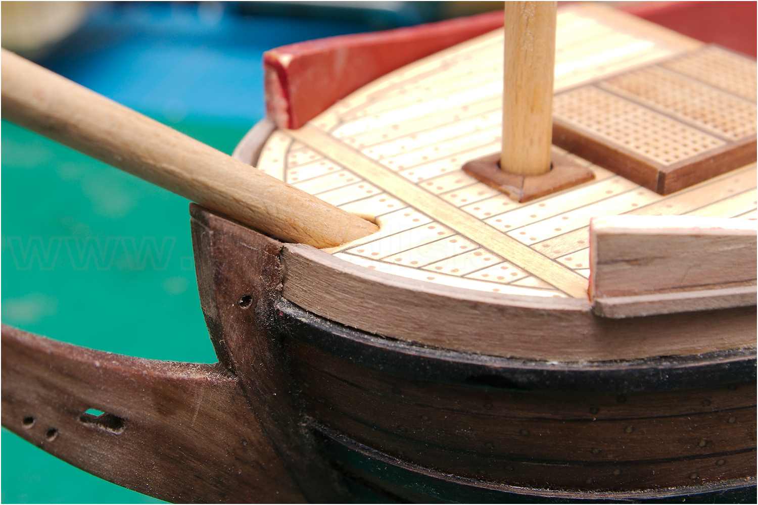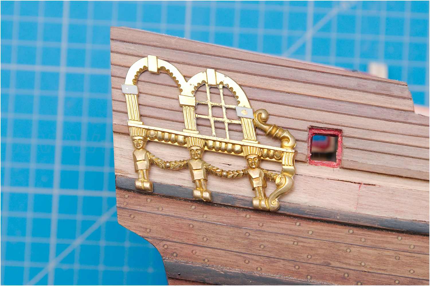 Der letzte Abschnitt der Beplankung des Rumpfes ist das Verkleben der Leisten im Bereich der Back und Aufbauten.