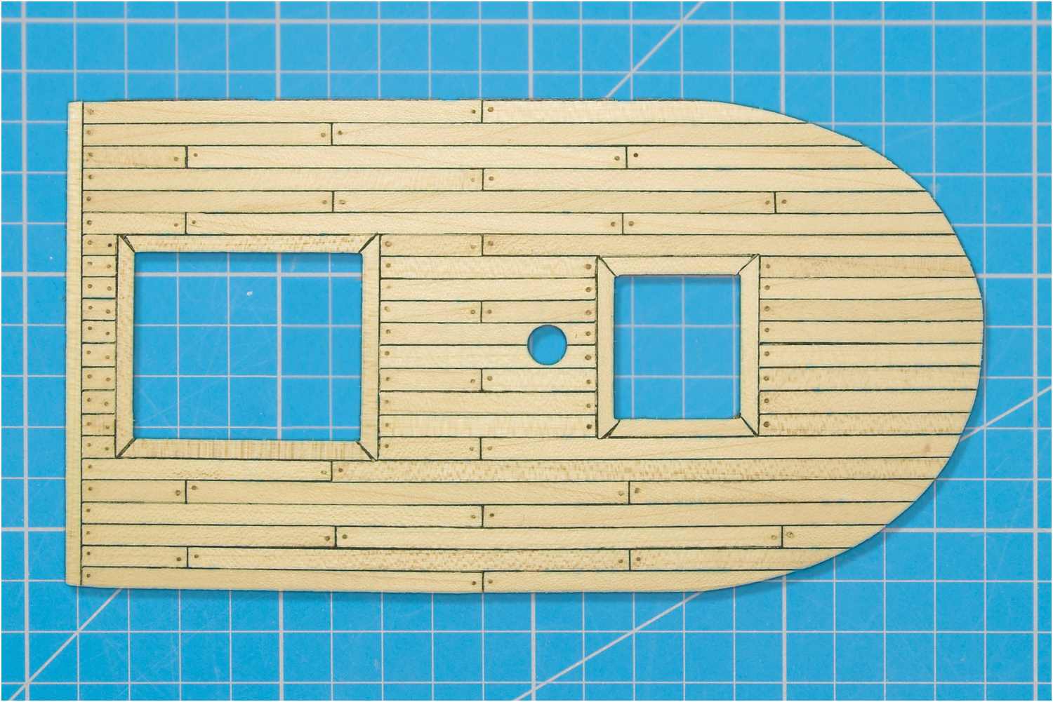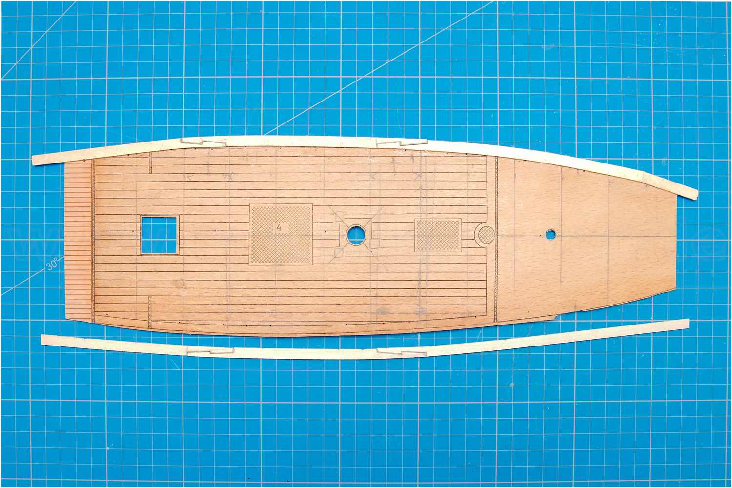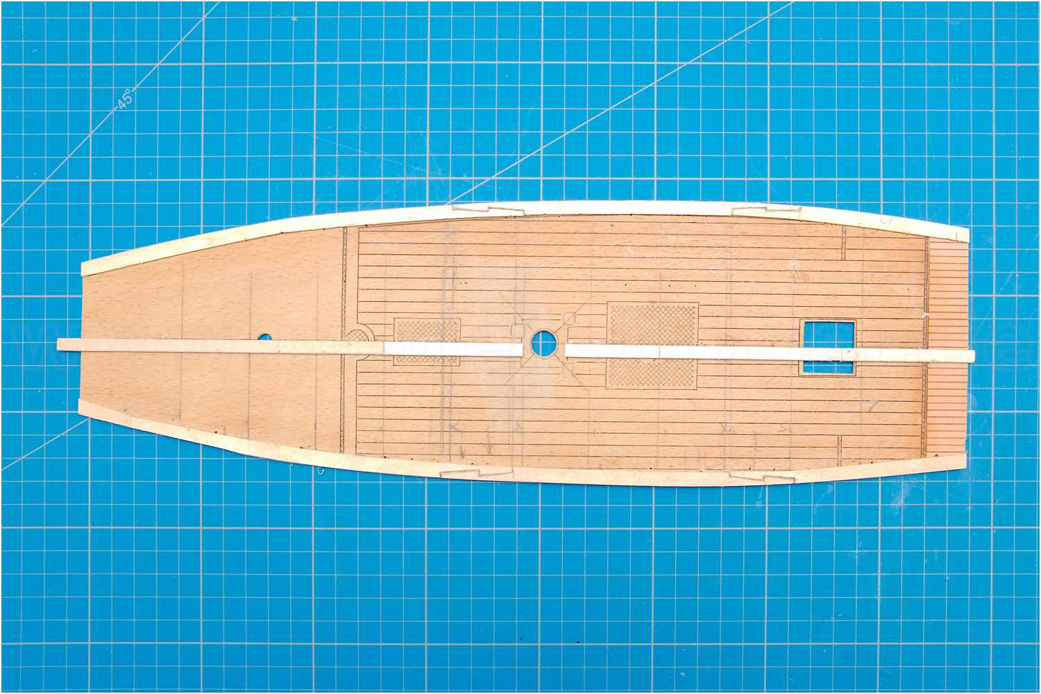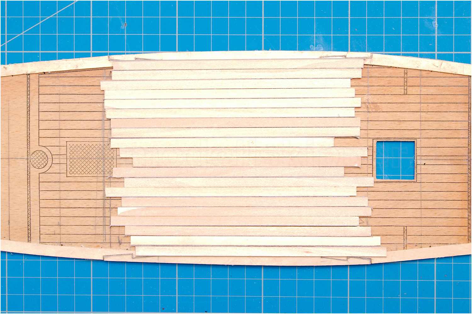 Da eine Rumpfbeplankung beim Baukastenmodell nicht vorgesehen ist, wird der Rumpf mit Außenbeplankung etwas breiter. So musste das Schanzkleid entsprechend verjüngt und die Breite das Originaldecks angepasst werden.