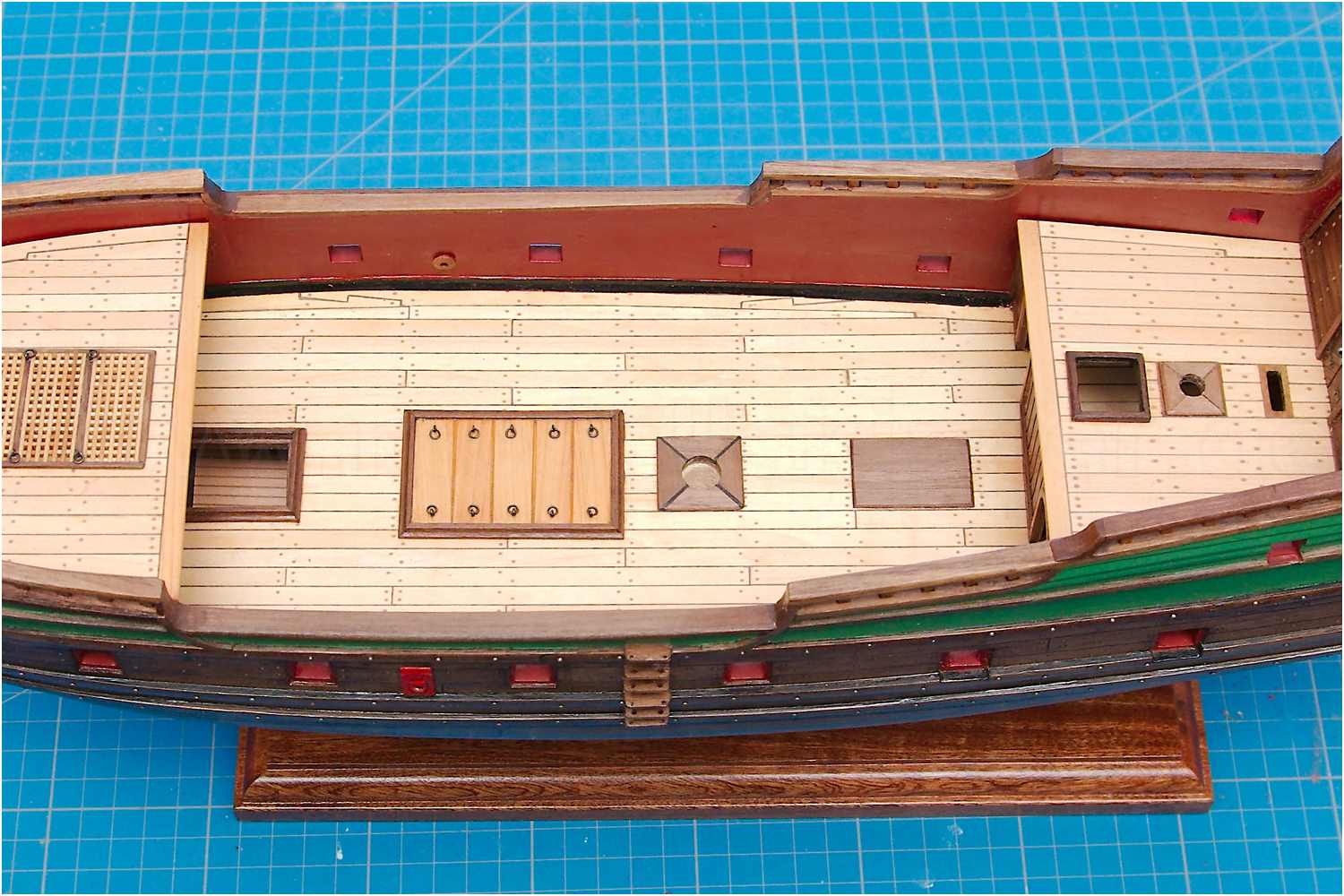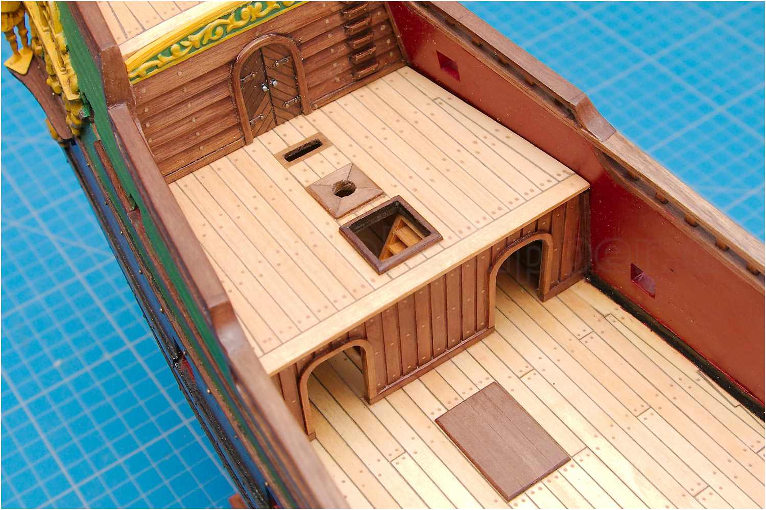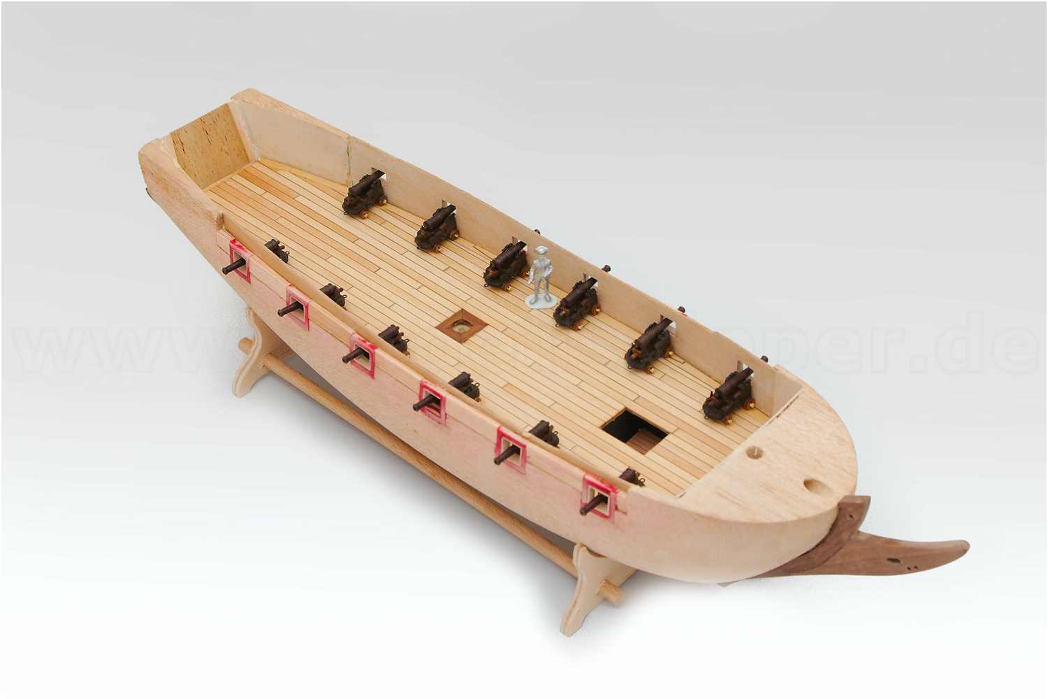 Da eine Rumpfbeplankung beim Baukastenmodell nicht vorgesehen ist, wird der Rumpf mit Außenbeplankung etwas breiter. So musste das Schanzkleid entsprechend verjüngt und die Breite das Originaldecks angepasst werden.