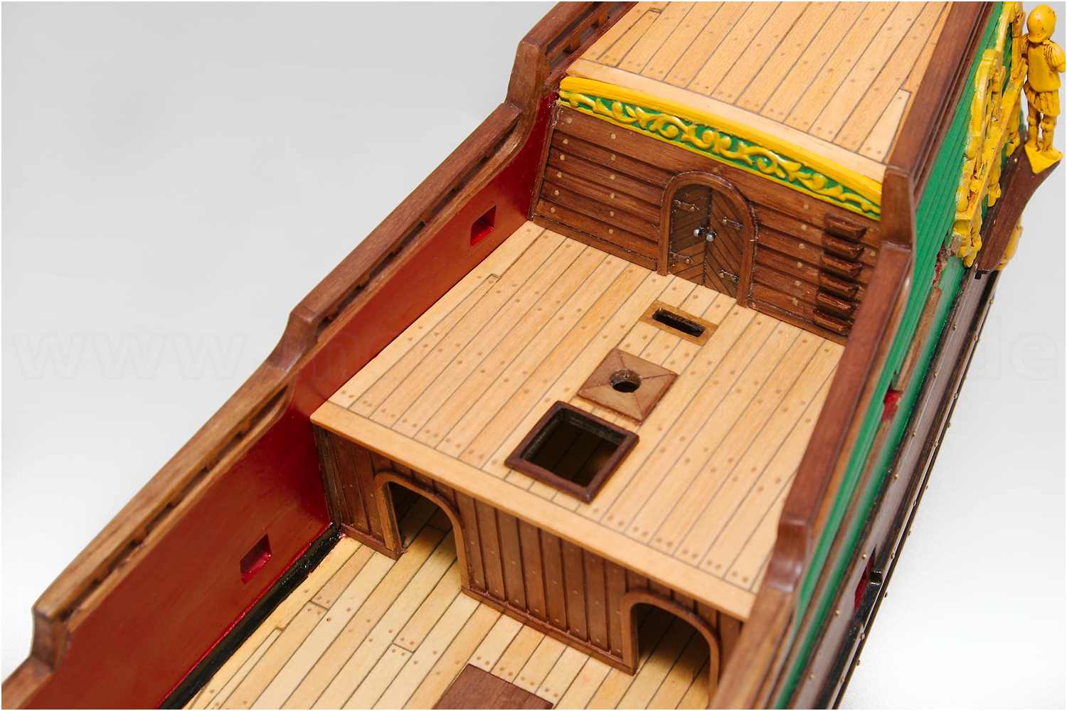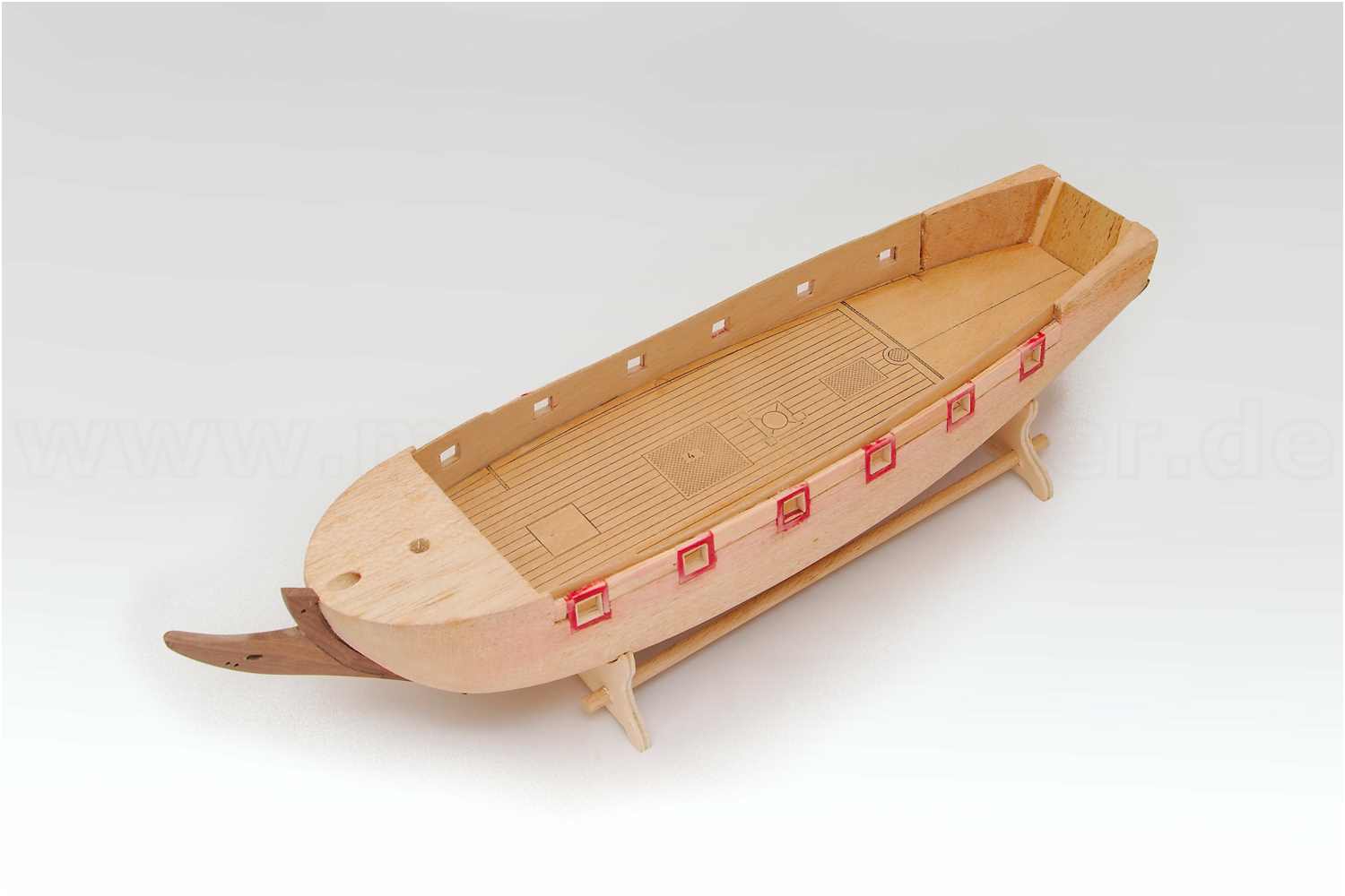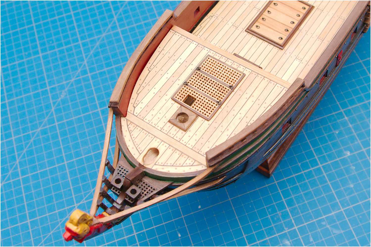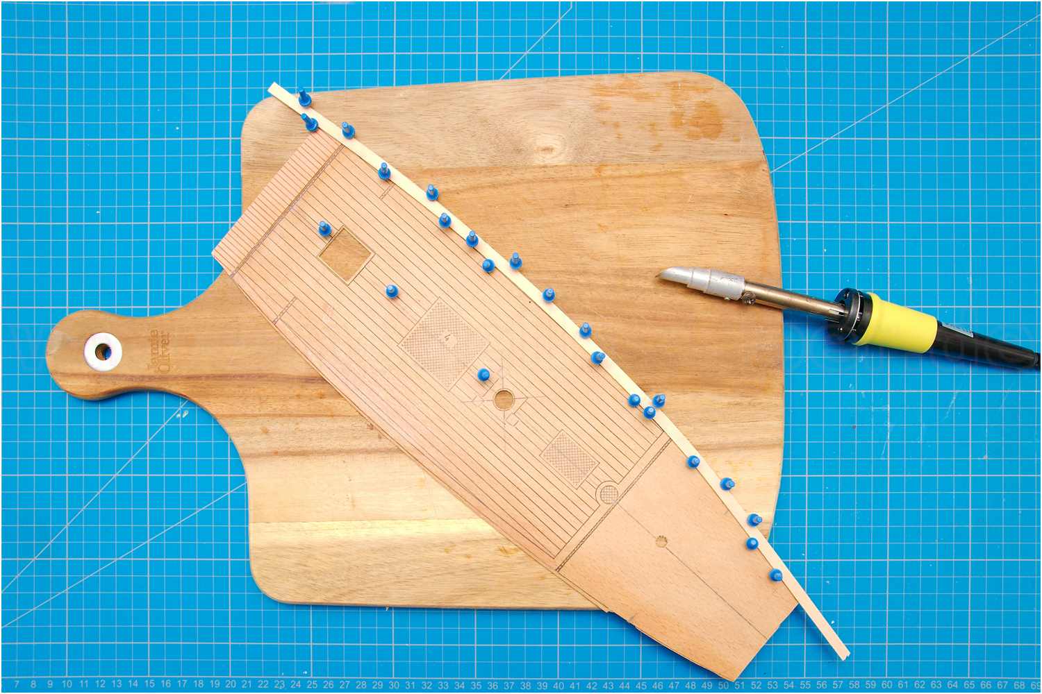 Da eine Rumpfbeplankung beim Baukastenmodell nicht vorgesehen ist, wird der Rumpf mit Außenbeplankung etwas breiter. So musste das Schanzkleid entsprechend verjüngt und die Breite das Originaldecks angepasst werden.