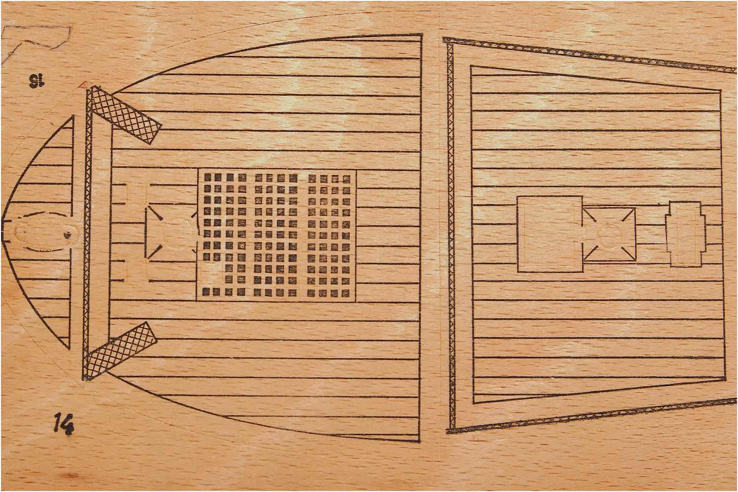 Beim Baukasten sind die Planken auf Sperrholz gedruckt, eine Beplankung ist nicht vorgesehen. Als Modifikation werde ich diese inklusive Kalfaterung realisieren.