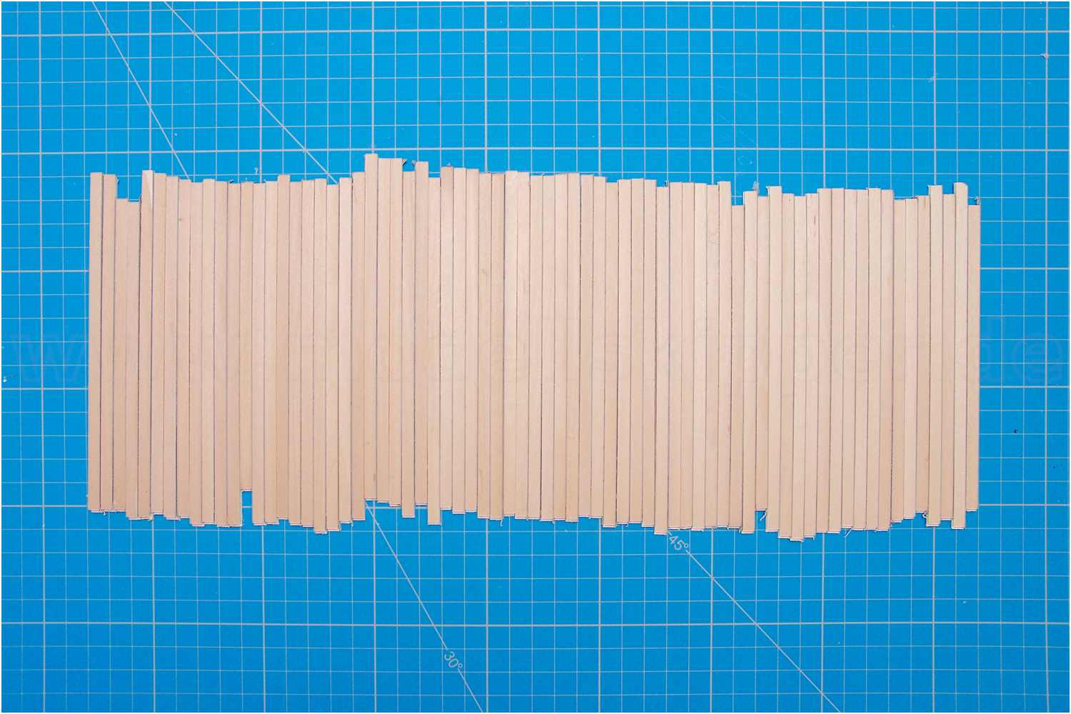 Dann lege ich mehrere Decksplanken probeweise auf das Deck. So kann ich testen, ob ich an der Mittellinie oder mit einer mittigen Leiste beginne, um an der breitesten Stelle des Decks möglichst so am Schandeckel zu enden, dass ich die letzte Decksleiste nicht unnötig verjüngen muss.