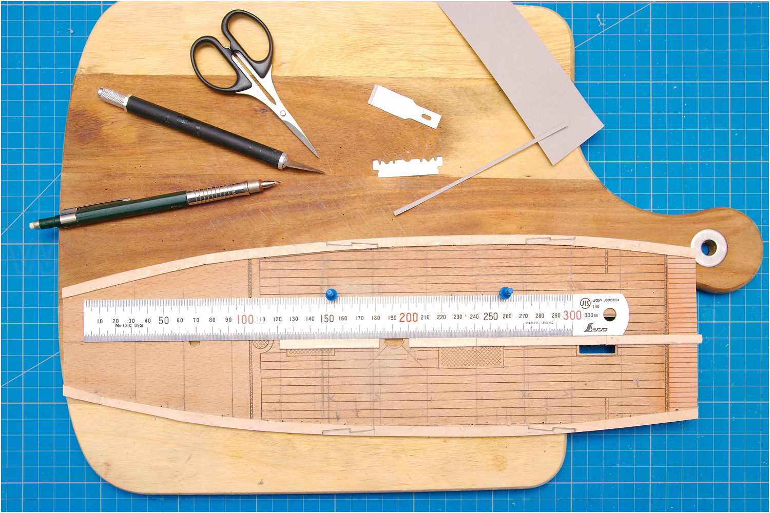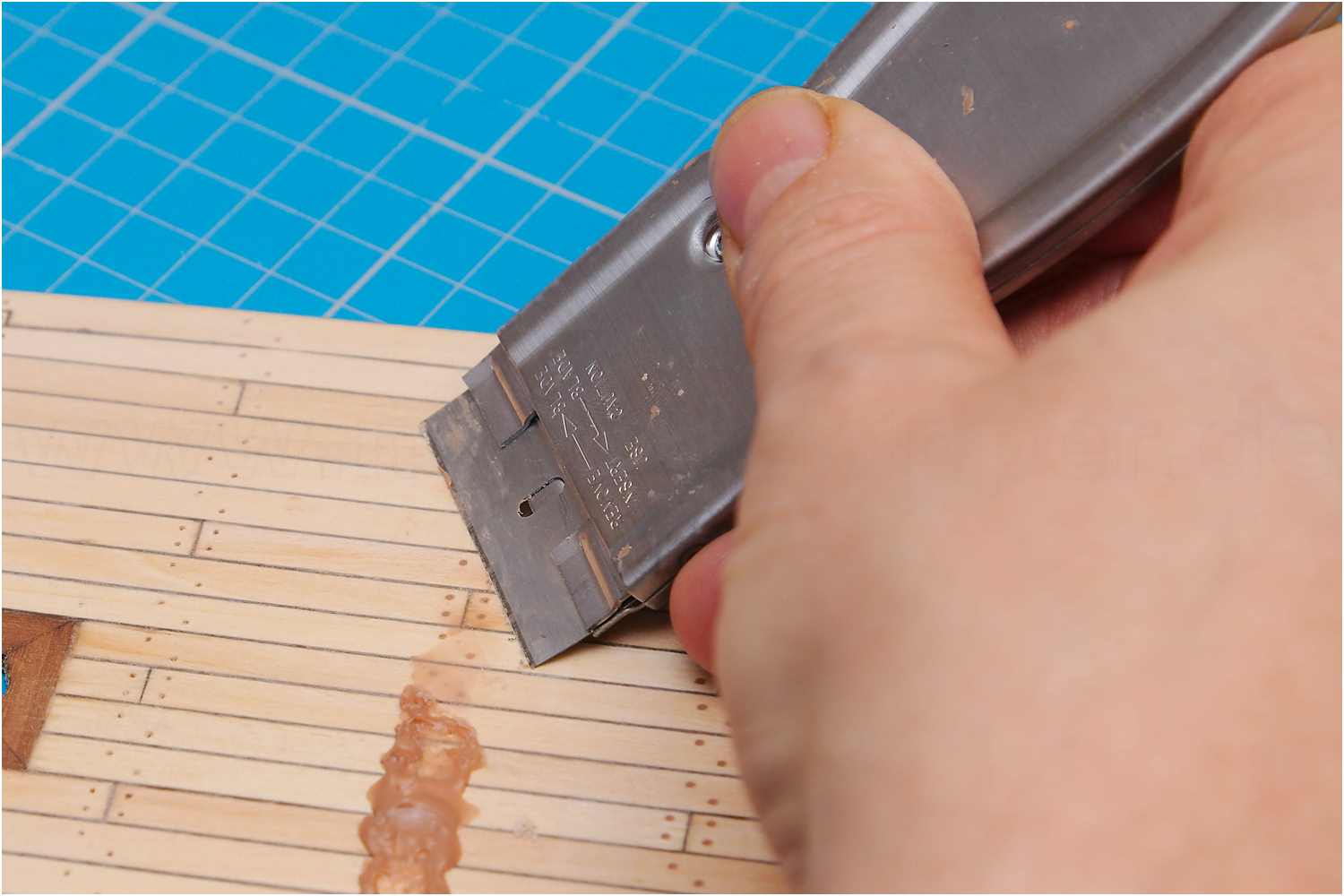 Ich übertrage die Linien der Plankenstöße auf das Deck, fixiere als Anschlag ein Lineal und klebe die erste Planke mit Holzleim auf. Das Holz wird, wie schon beim Schandeckel, wieder aufgebügelt. Abschließend entferne ich die noch weichen Klebereste mit einer Klinge.