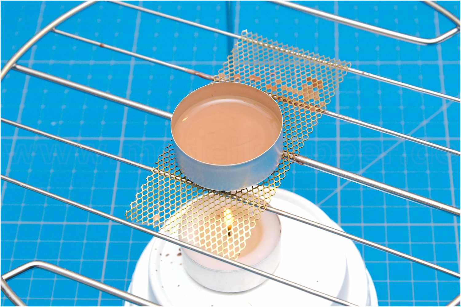 Das Wachs wurde in einem leeren Teelichtbehälter über einer Flamme erwärmt und im flüssigen Zustand mit einem Pinsel in die Bohrungen getupft.