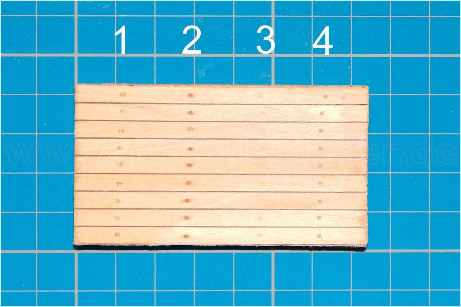 Gehe ich davon aus, dass die Fuge zwischen den Planken im Original etwa 1 cm beträgt, verwende ich Pappe mit einem Stärke von 180 g/m², was der Dicke von 0,2 mm entspricht und perfekt für den Maßstab 1:50 passt.
