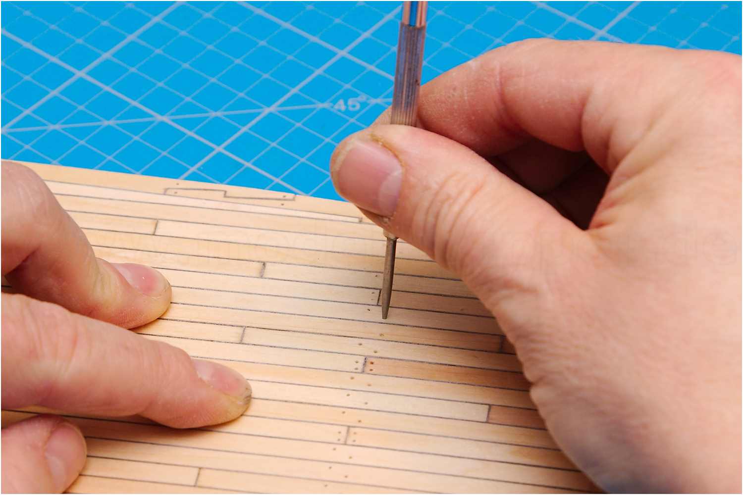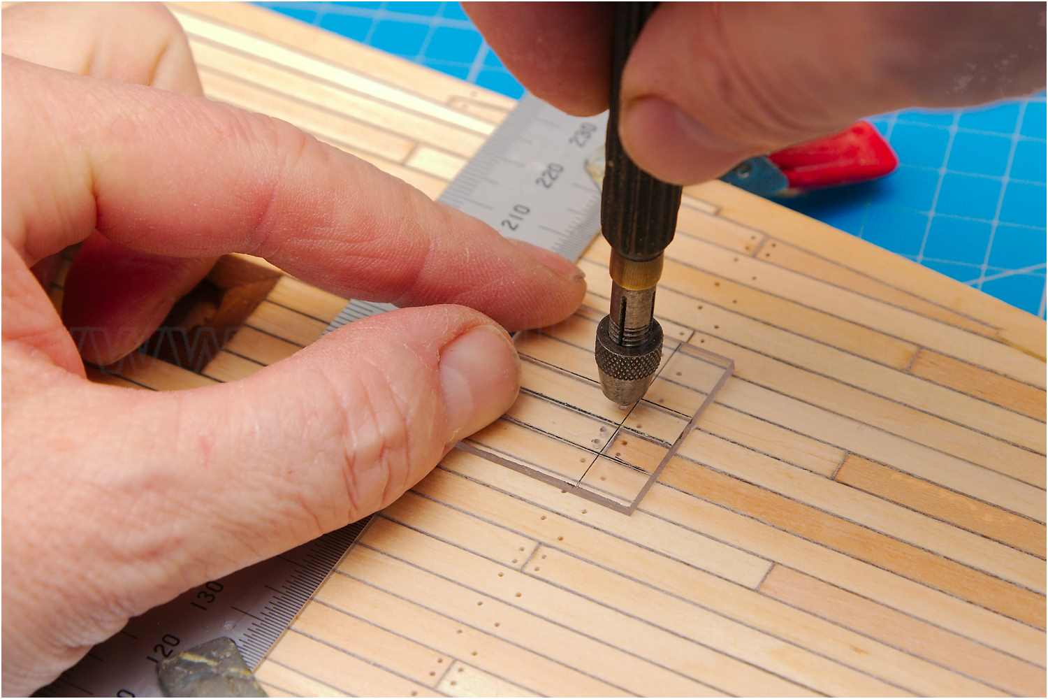 Zunächst werden die Dübellöcher mit einem Durchmesser von 0,8 mm gebohrt. Dazu habe ich mir eine Bohrschablone aus Plexiglas angefertigt. Darauf einen Plankengang eingeritzt und mit einem Permanentmarker farblich hervorgehoben. So sehe ich die Plankengänge auf dem Deck und kann die Schablone gut ausrichten.
