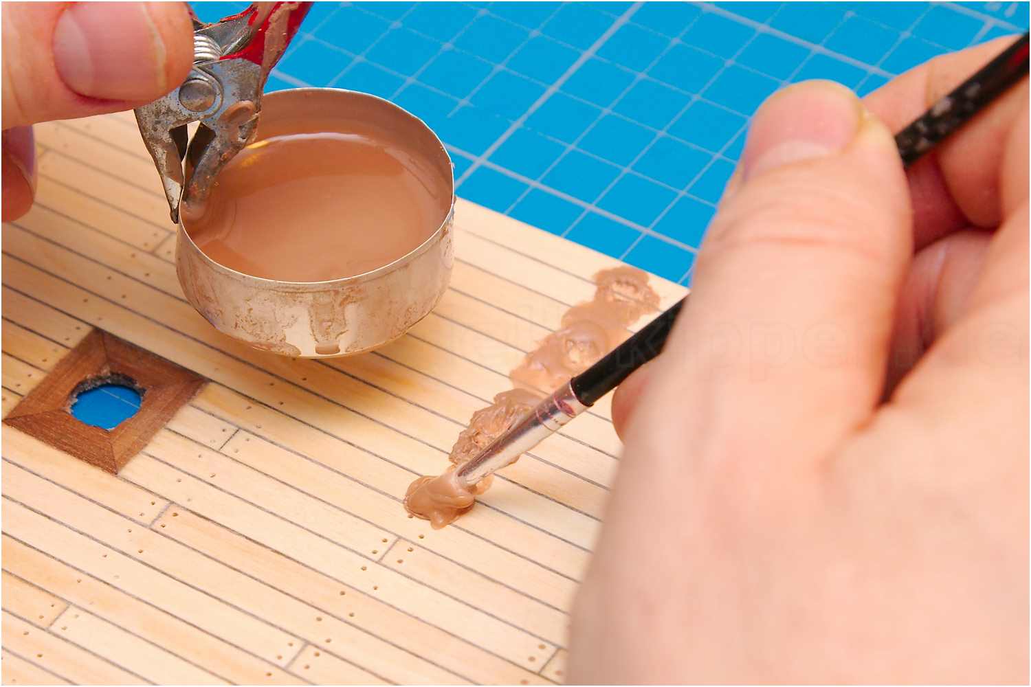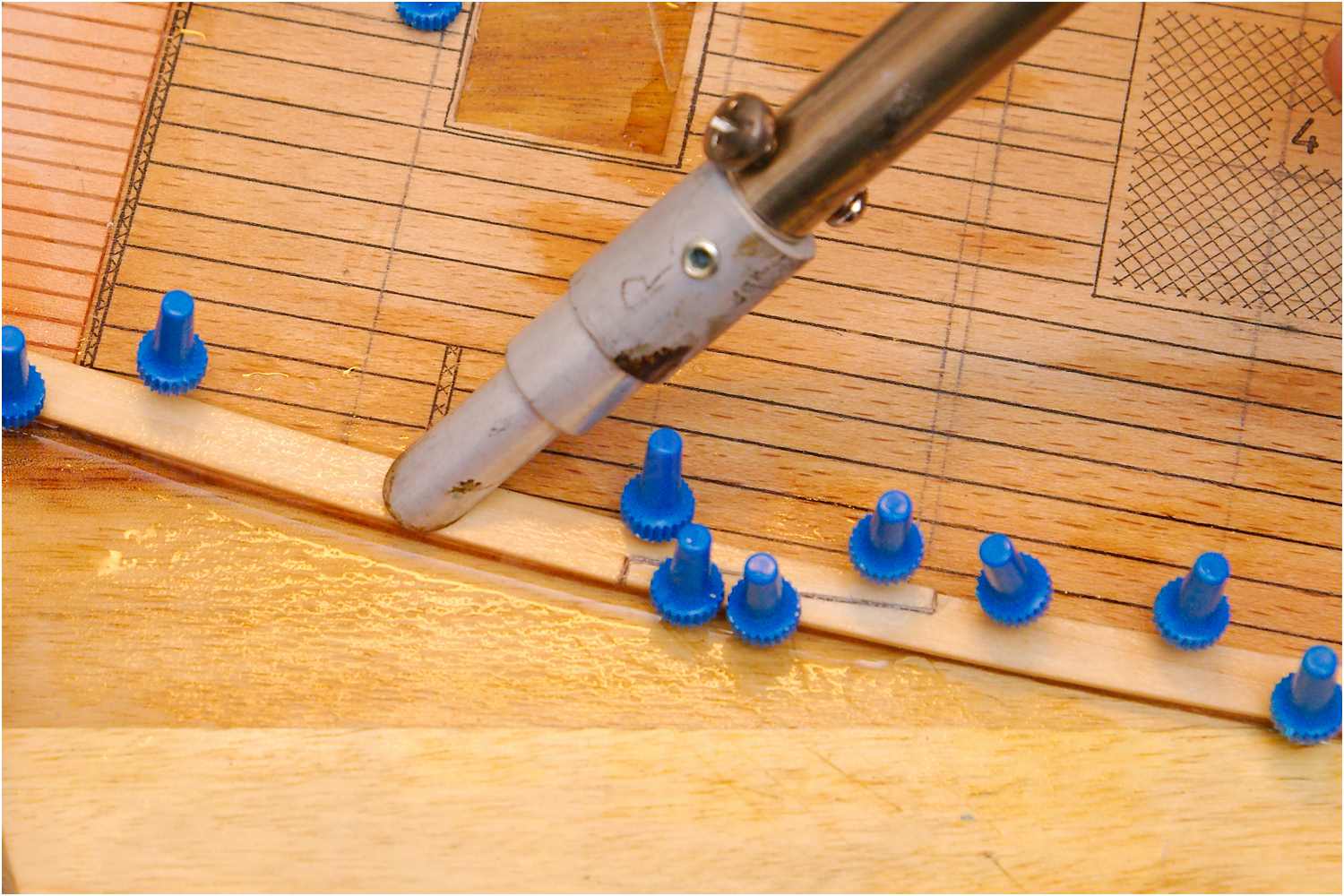 Oftmals wird skeptisch hinterfragt, ob man die Dübel nicht einfach weglassen könne, weil man sie sowieso nicht sieht oder wenn doch, dass sie viel zu dunkel wären. Hier ein Beispiel, wie es beim Replik der Fregatte Shtandart zu sehen ist.