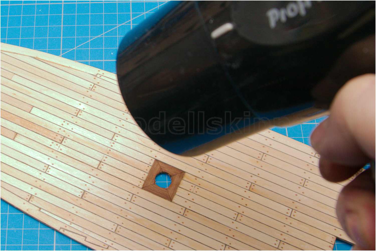 Da das Wachs recht schnell wieder abkühlt, habe ich den doch recht heißen Behälter mit dem flüssigen Wachs mittels einer Modellbauklammer direkt über dem Deck gehalten, um es auch flüssig auf die Löcher geben zu können.