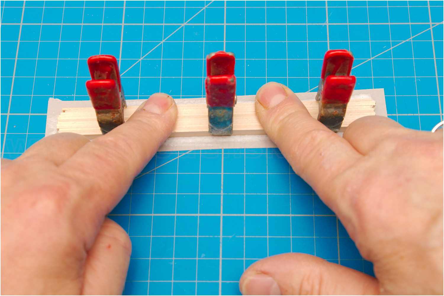 Ein paar Leisten werden mit Klammern fixiert, ein Streifen Pappe mit verdünntem Holzleim eingestrichen und das Leistenpaket auf die geleimte Pappe gedrückt. Die Klammern sind nur dazu da, dass sich das Leistenbündel einfacher auf die Pappe legen lässt, sie werden dann gleich wieder entfernt.