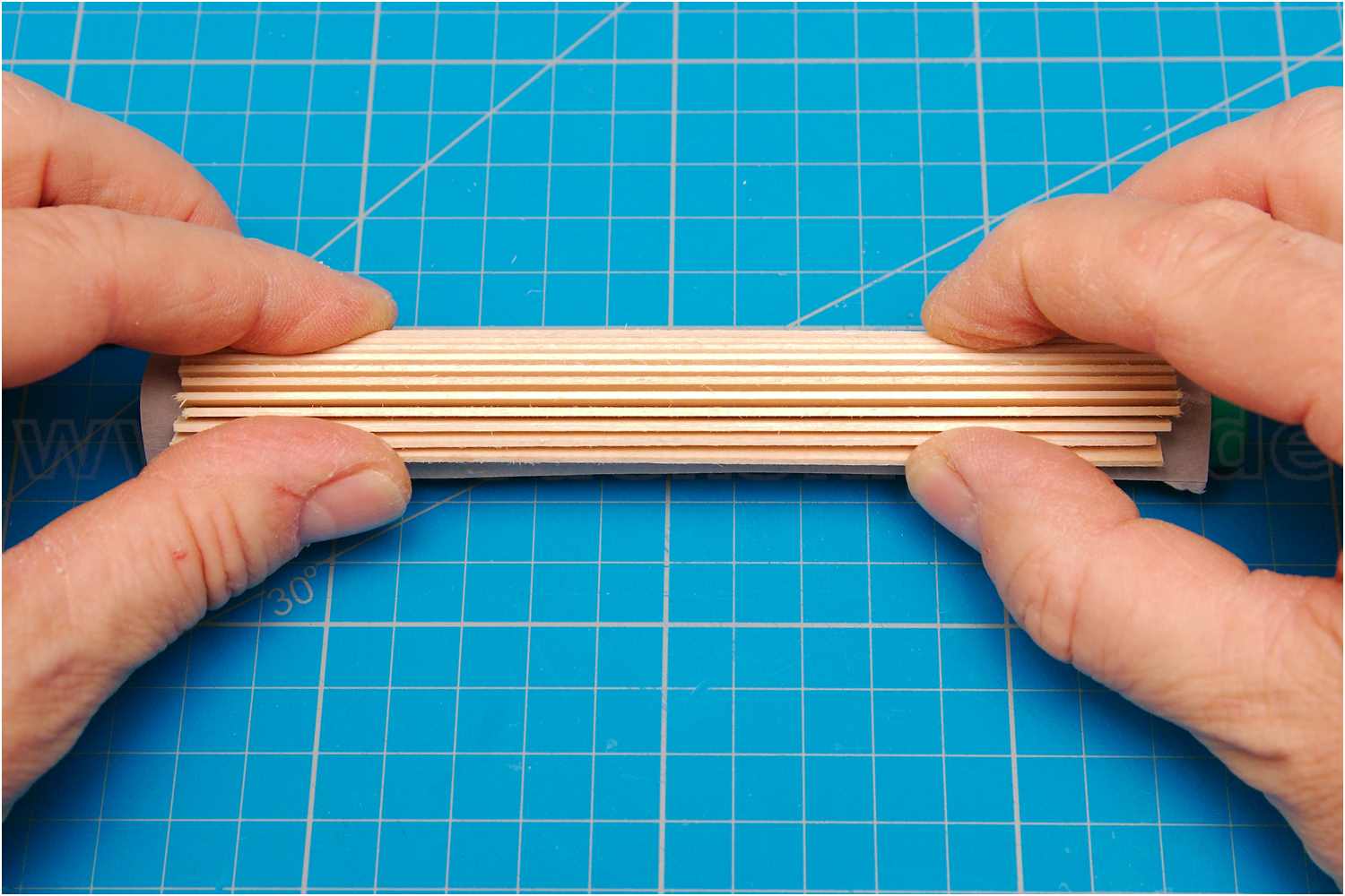 Noch im warmen Zustand lege ich die Leisten auf ein Rundholz oder dicken Filzstift und spreize so die Leisten auseinander, damit diese nicht untereinander verkleben. Das hat sich aus der Erfahrung für die nächsten Arbeitsschritte als wichtig erwiesen.