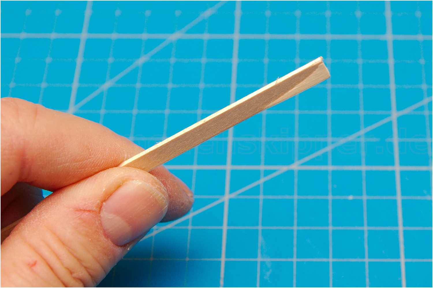 Über Nacht lasse ich dann alles trocken. Die gröbste Spannung ist jetzt aus der Leiste raus und klebe sie mit Holzleim auf das Deck, ebenfalls unter Zuhilfenahme der heißen Formspitze. So bindet der Leim relativ schnell ab.