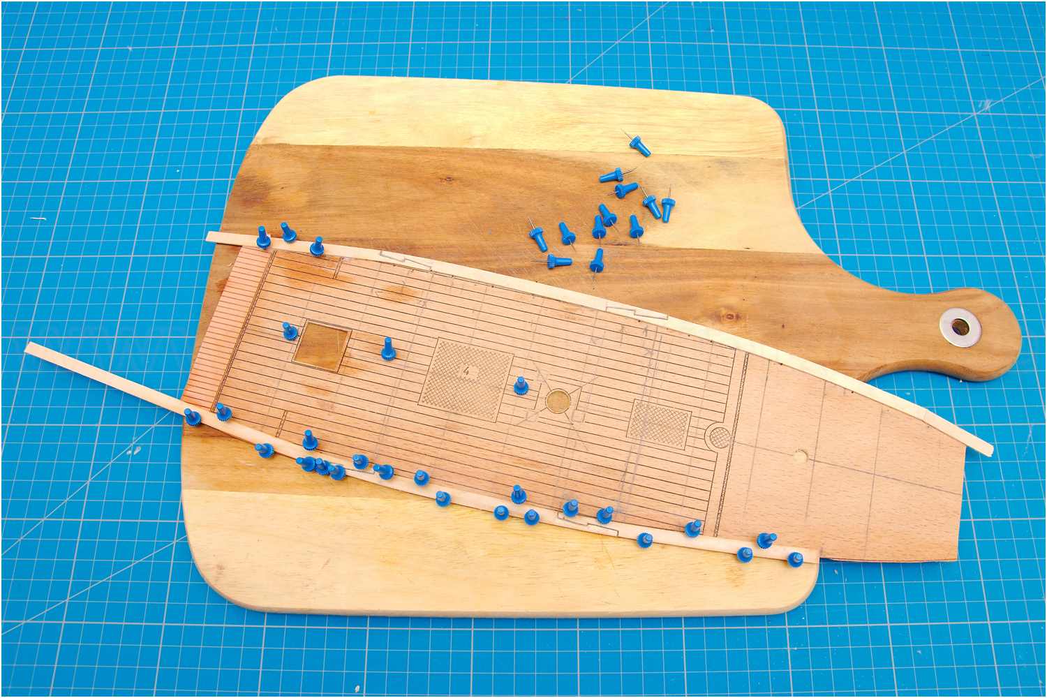 Dazu tauche ich sie kurz in Wasser, erwärme sie mit der Formspitze und biege sie nach und nach in die benötigte Form. In kurzen Abständen fixiere ich die Leiste mit Stoßnadeln.