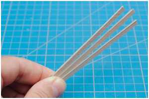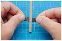Jetzt nimmt man eine halbe Rasierklinge, spreizt die Leisten etwas auseinander und steckt die Klinge in den Zwischenraum, stellt das ganze Paket auf die Stirnseite und zieht mit beiden Händen die Klinge nach unten.