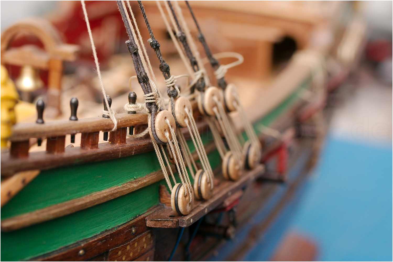 Alle Taue für das stehende und laufende Gut stelle ich selber her. Dazu habe ich mir eine Reepmaschine zugelegt um alle notwendigen Taustärken anfertigen zu können.