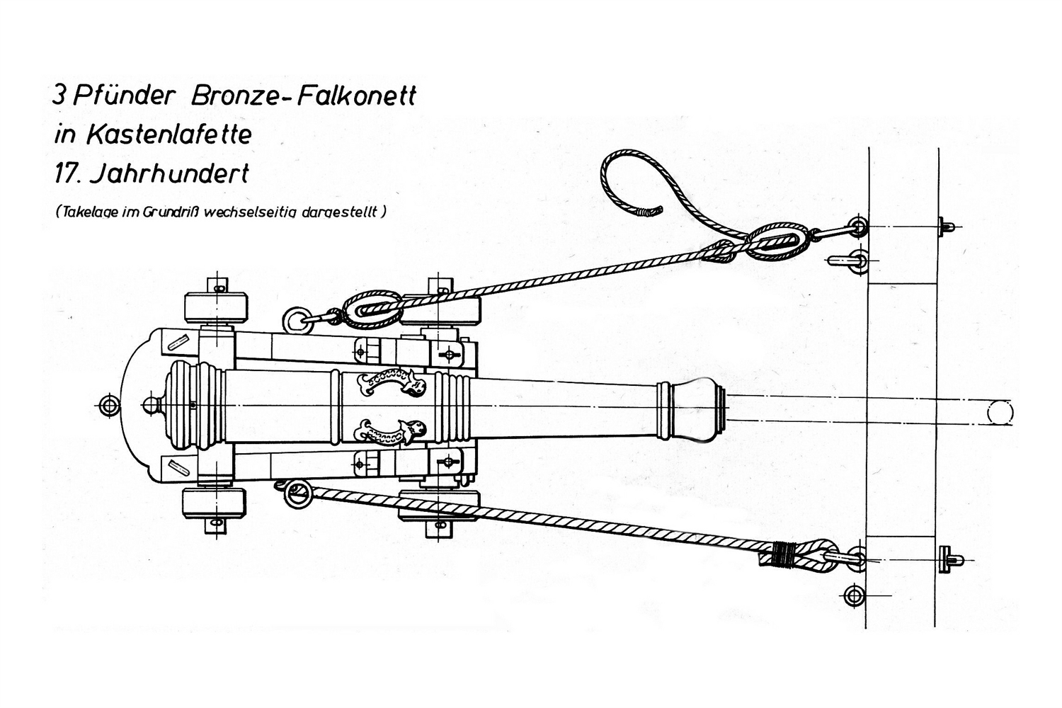 Ich werde mich bei der Takelung der relativ leichten Geschütze nach der nebenstehenden Zeichnung richten, mit einem durch die Lafettenbacken geführtem Brooktau sowie zwei Seitentaljen und einer Rückholtalje die jeweils über einscheibige Blöcke geführt werden.