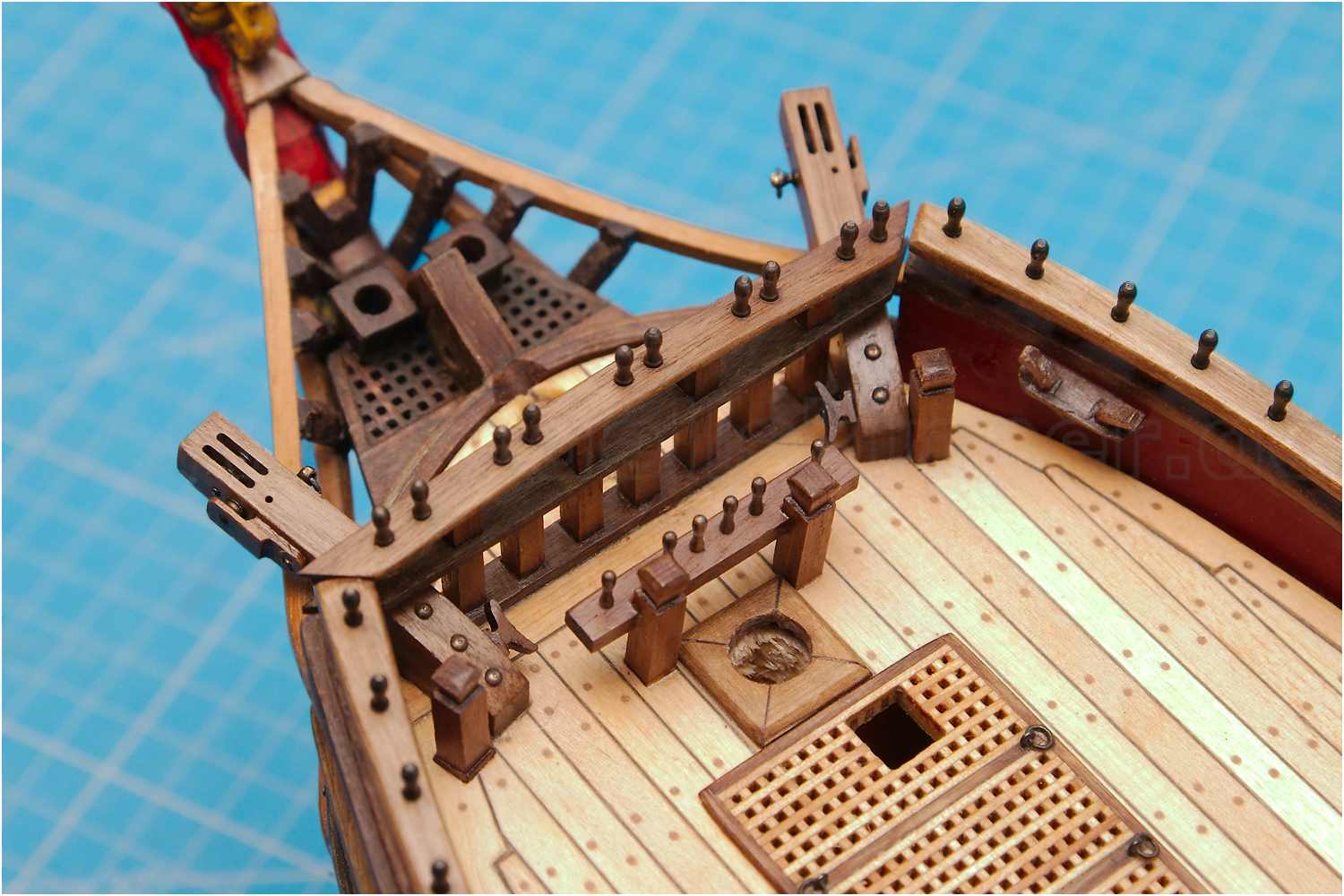 Nach der Überarbeitung aller Belegstellen im Takelplan wurden als Modifikation die Belegbänke des Fock- und Großmasts um je zwei Belegnägel erweitert.