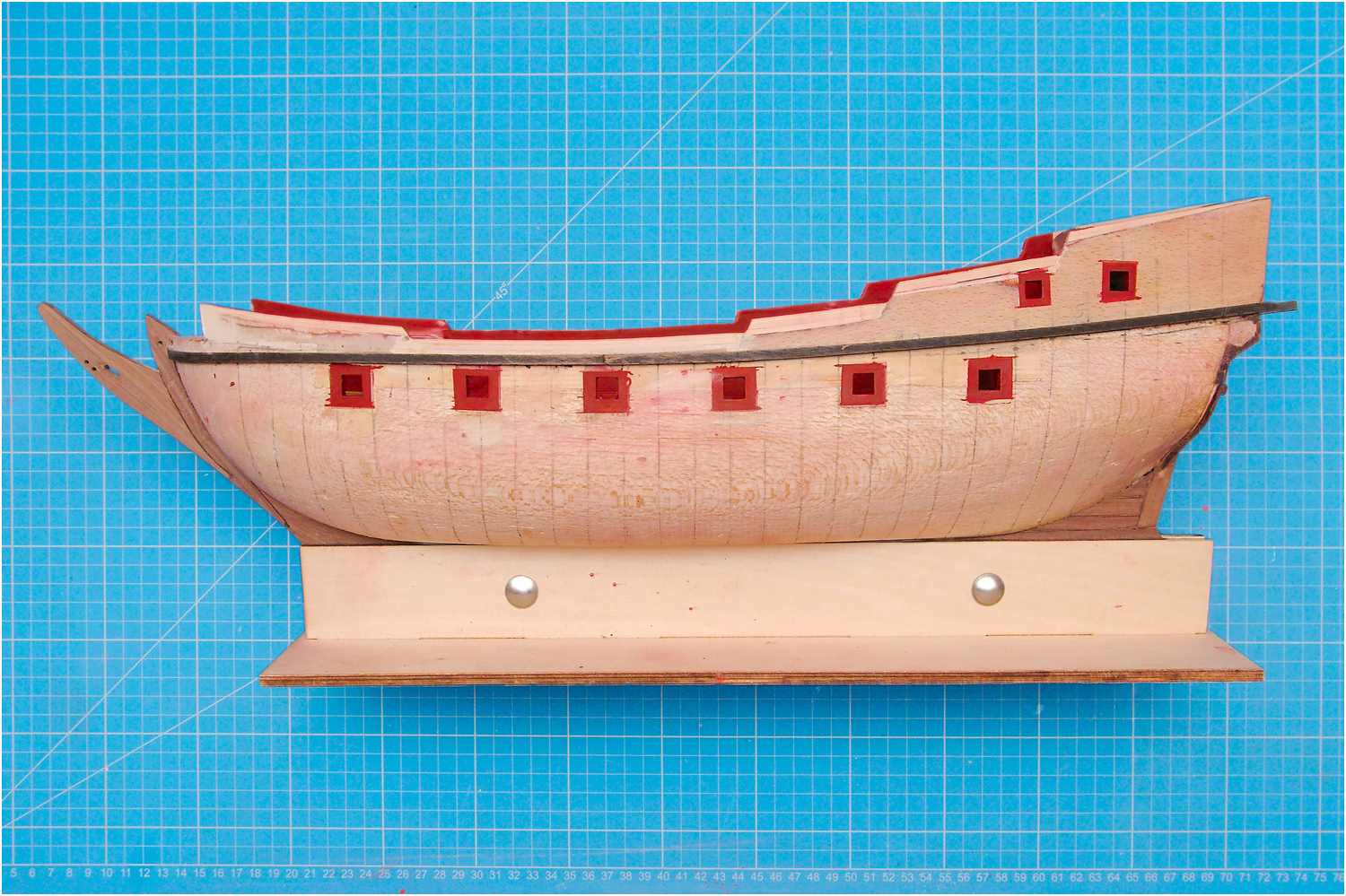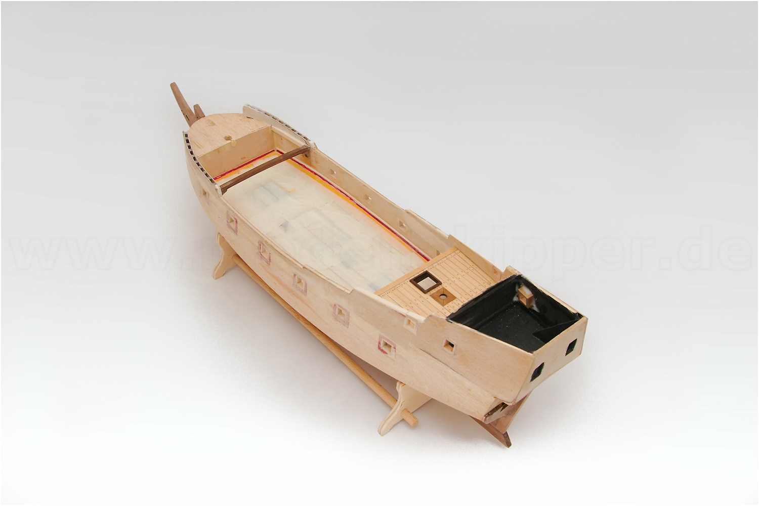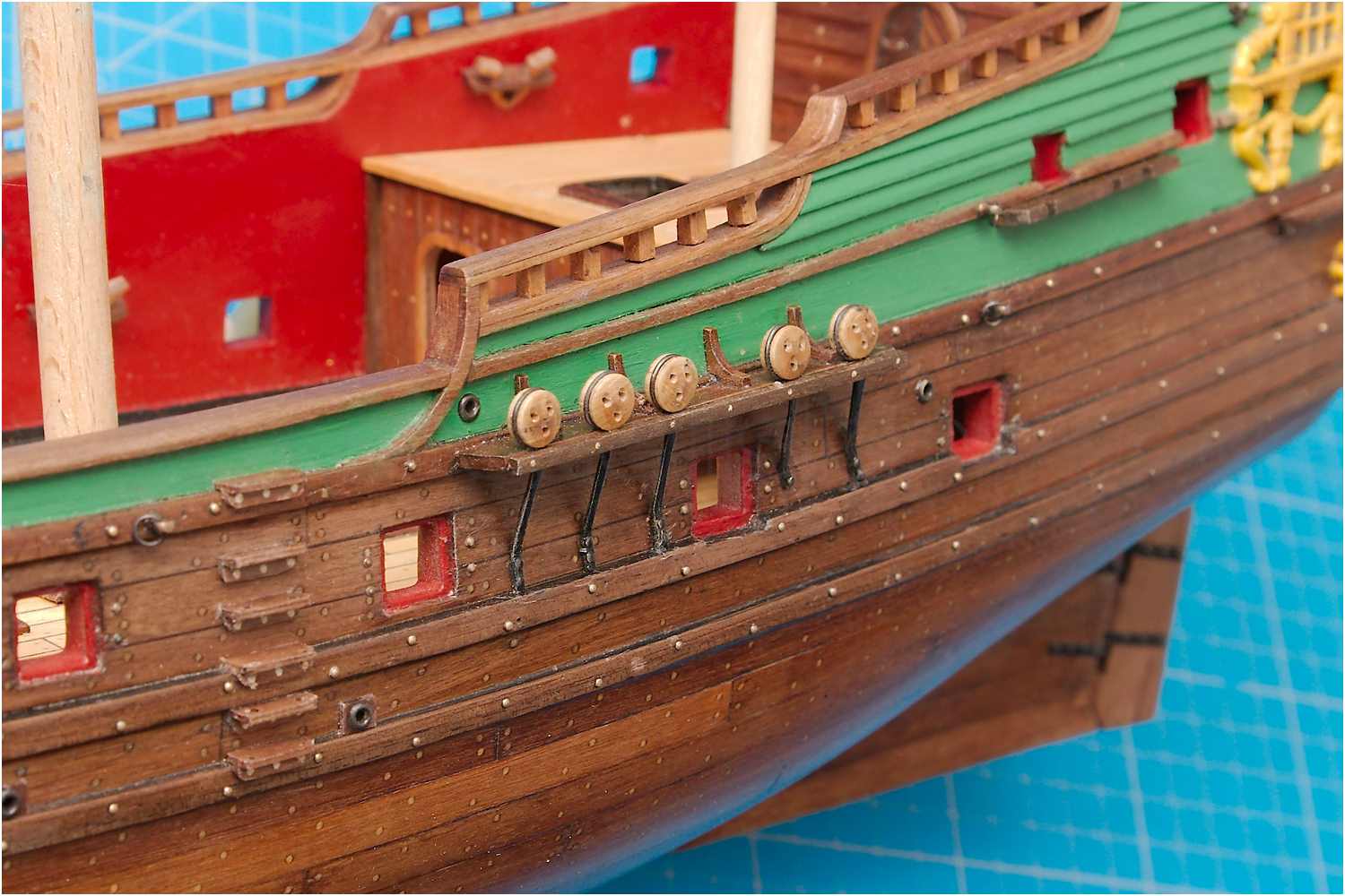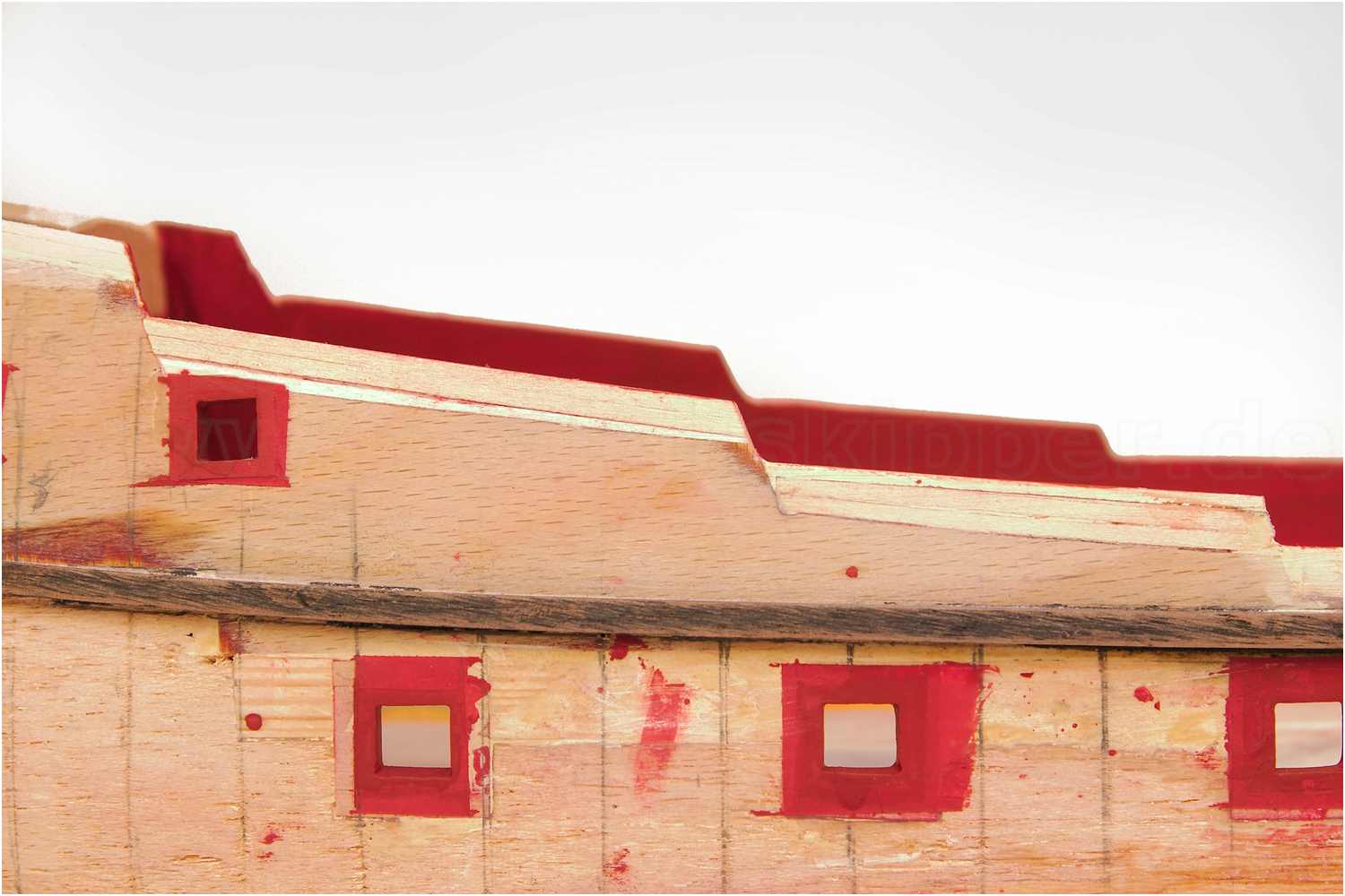 Diesmal war es die Oberkante der Bordwand, die ja auf Grund der zusätzlichen Decksbeplankung um einiges höher sein muss. Der Fehler wurde diesmal früh genug erkannt und konnte relativ problemlos repariert werden. Das komplette Schanzkleid wurde aufgefüttert und musste nur noch einmal lackiert werden