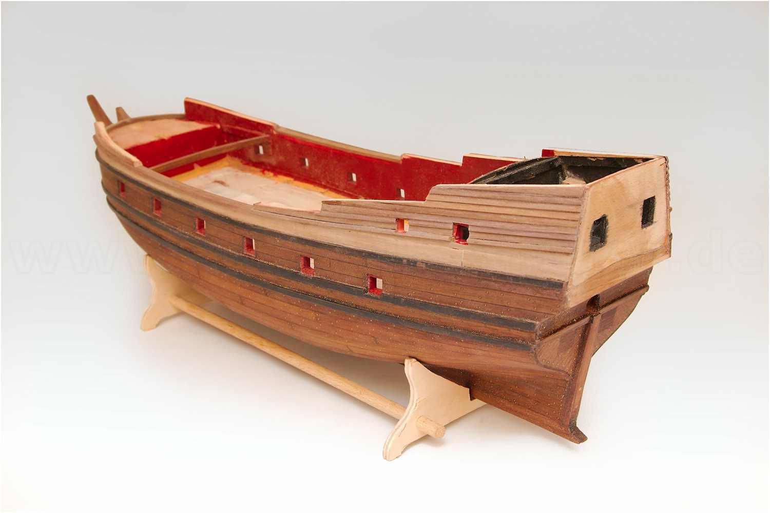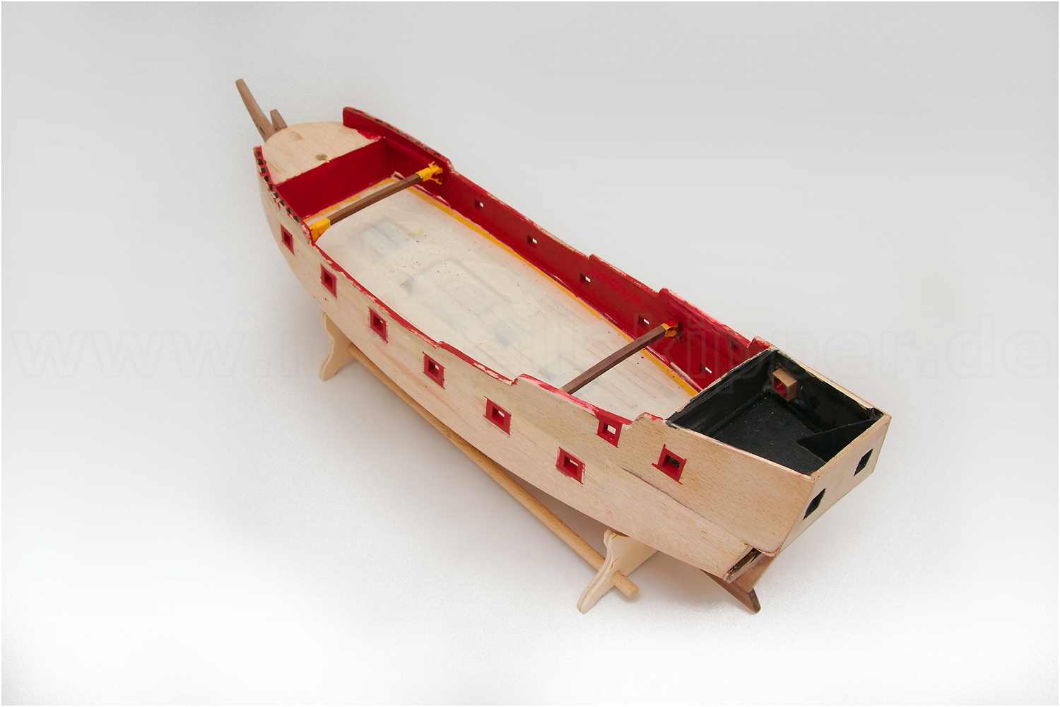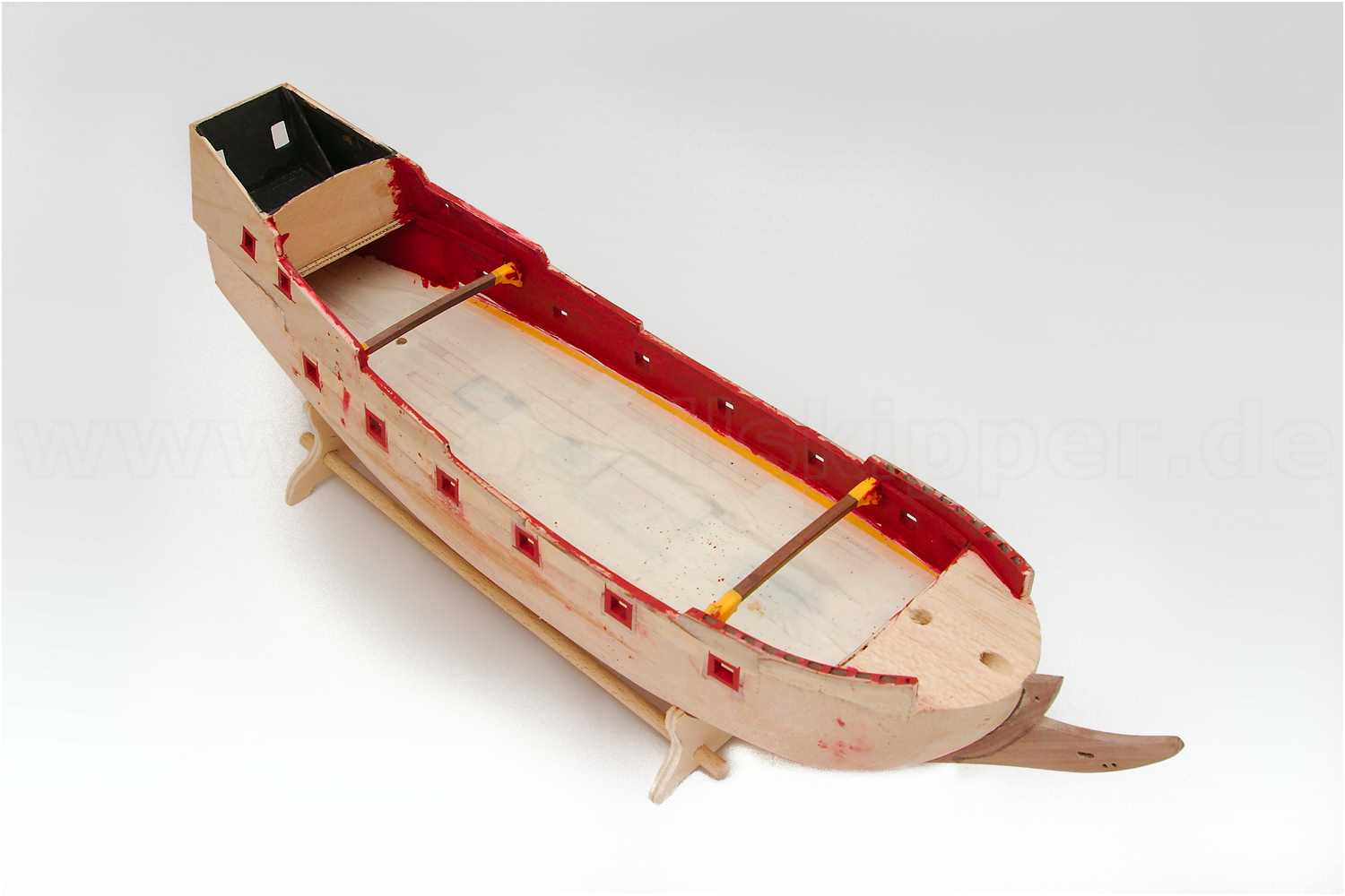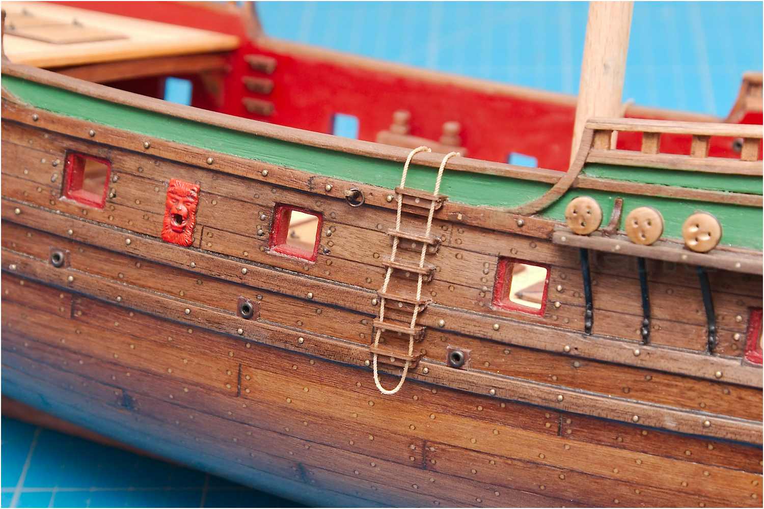 Diesmal war es die Oberkante der Bordwand, die ja auf Grund der zusätzlichen Decksbeplankung um einiges höher sein muss. Der Fehler wurde diesmal früh genug erkannt und konnte relativ problemlos repariert werden. Das komplette Schanzkleid wurde aufgefüttert und musste nur noch einmal lackiert werden