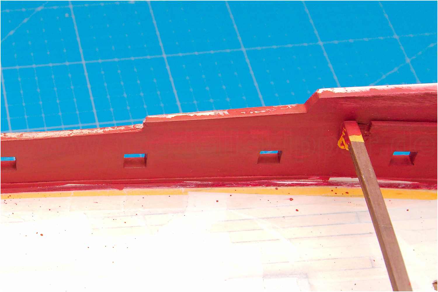Nach dem Verschleifen der Füllholzer am Schanzkleid der Back sind die Arbeiten an der am Rumpfaußenhaut erst einmal so weit abgeschlossen. Es konnte nun die Lackierung des kompletten Wegerung der Bordwand erfolgen.