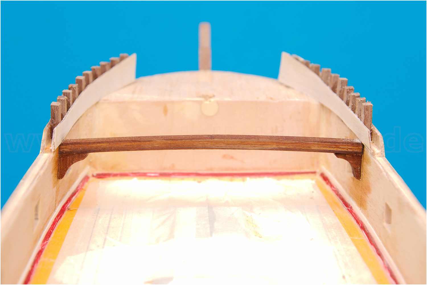 Das Schanzkleid auf der Back ist noch im Rohzustand. Was man sieht, sind nicht die Geländerstützen, sondern nur die Füll- und Abstandshölzer für die innere Wegerung, die im nächsten Arbeitsschritt noch gekürzt und verschliffen werden. Die Hölzer wurden so eingesetzt, dass in den Zwischenräumen dann die Geländerstützen eingesetzt werden können und Halt haben. Leider habe ich das im Eifer des Gefechts an den hinteren Bordwänden vergessen.