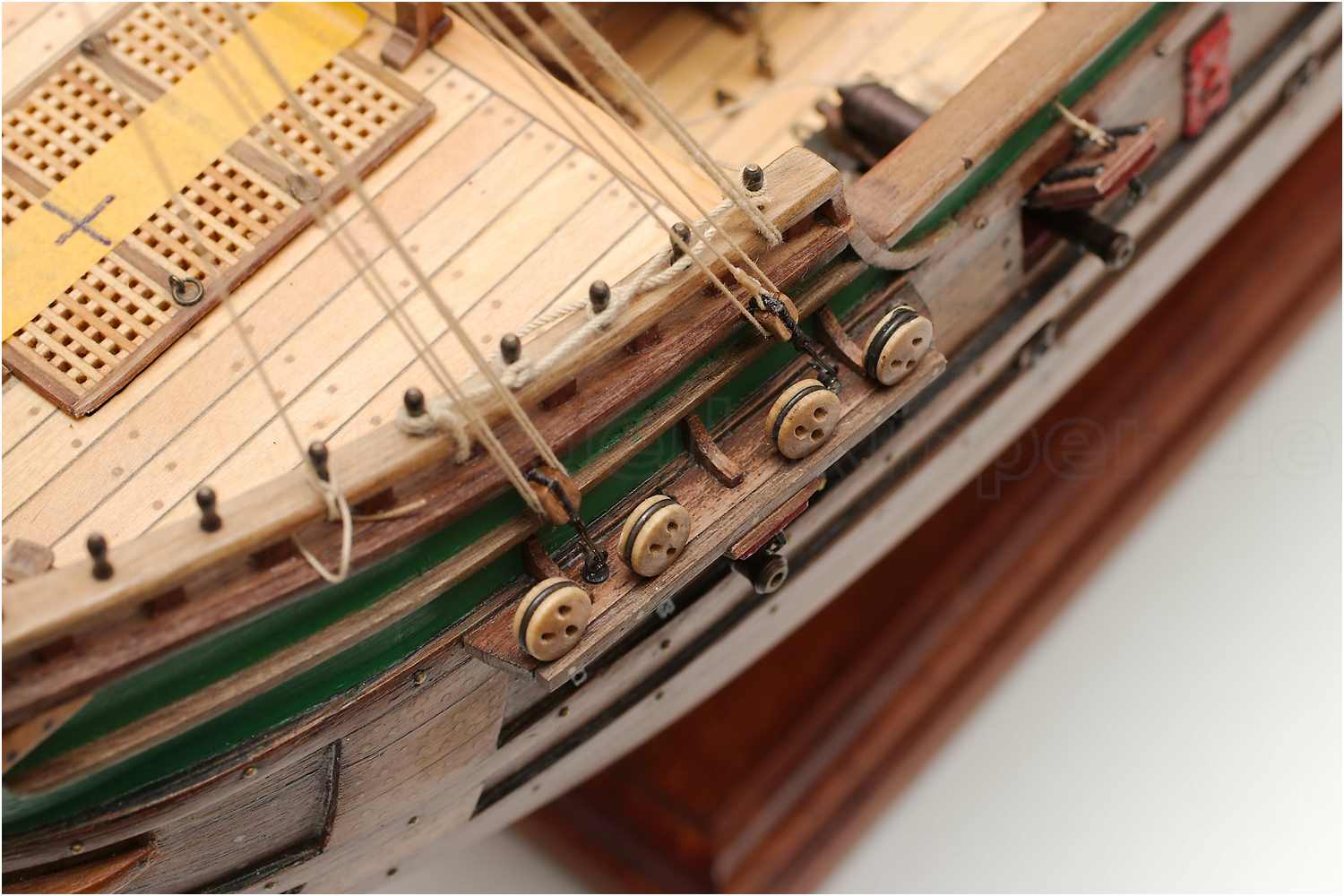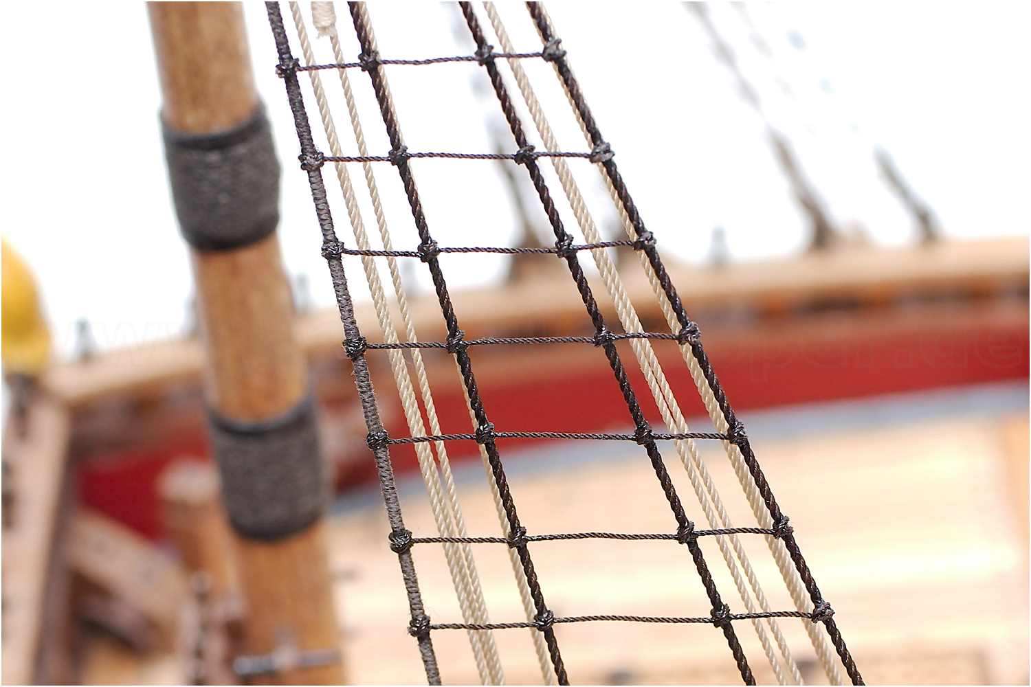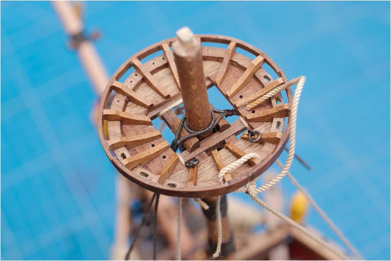 Wie sich allerdings herausstellte, neigten die Taue der laufende Parten aus Mara-Garn nach mehrfachem Durchziehen durch die engen Löcher der Blöcke zum Fusseln.