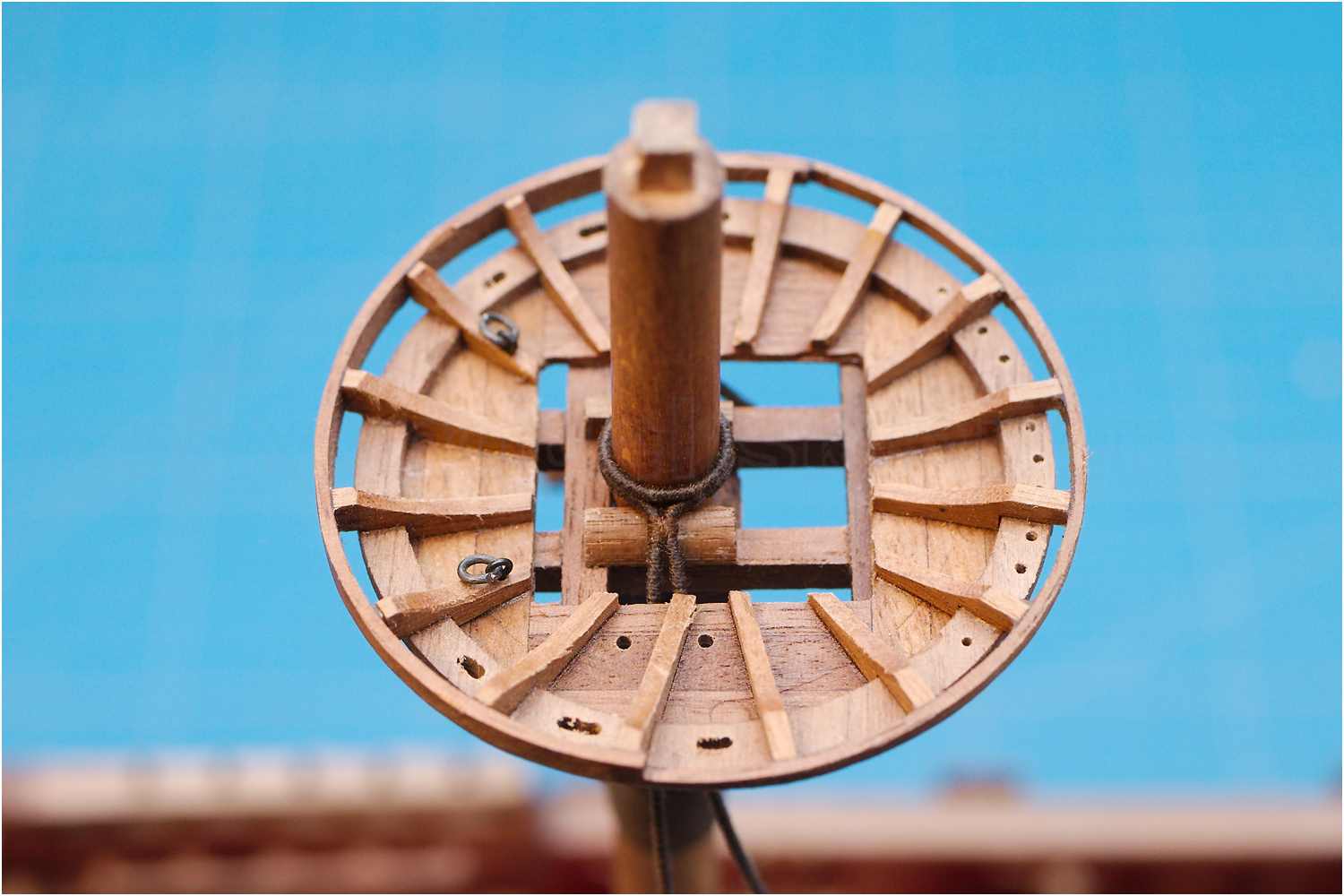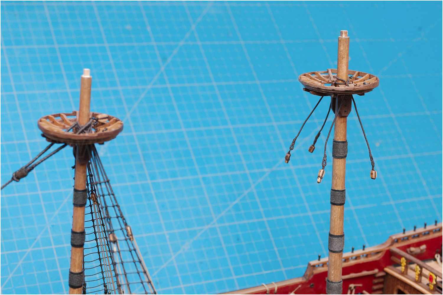 Im Originalbausatz sind gar keine Seitentakel vorgesehen, im BP am Fock- und Großmast jeweils nur einer je Seite. Als Modifikation realisiere ich an jedem der beiden Masten eine Talje mit zwei Doppelblöcken für schwerere und eine Talje mit Violine und Einfachblock für leichtere Lasten, insgesamt vier Takel.