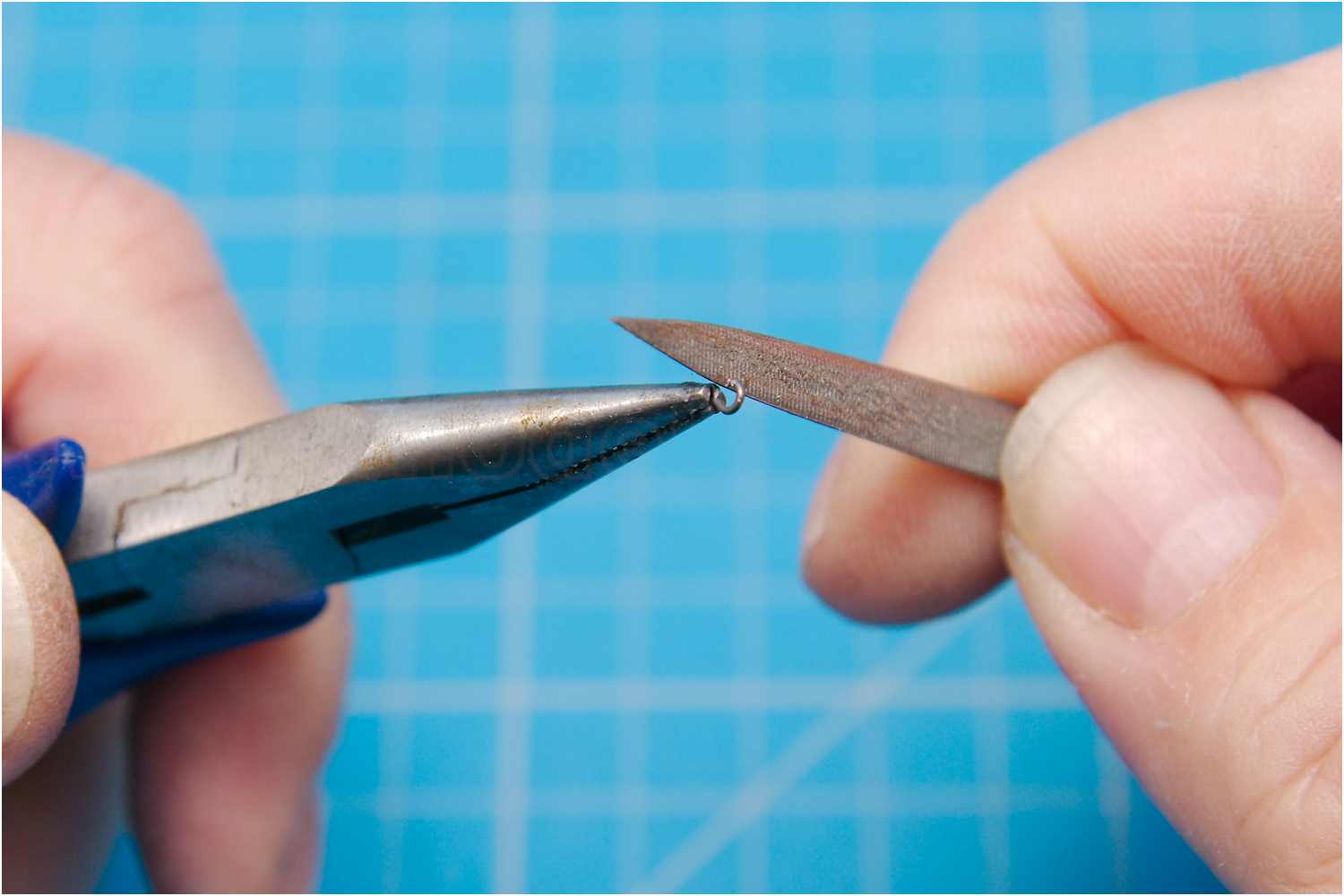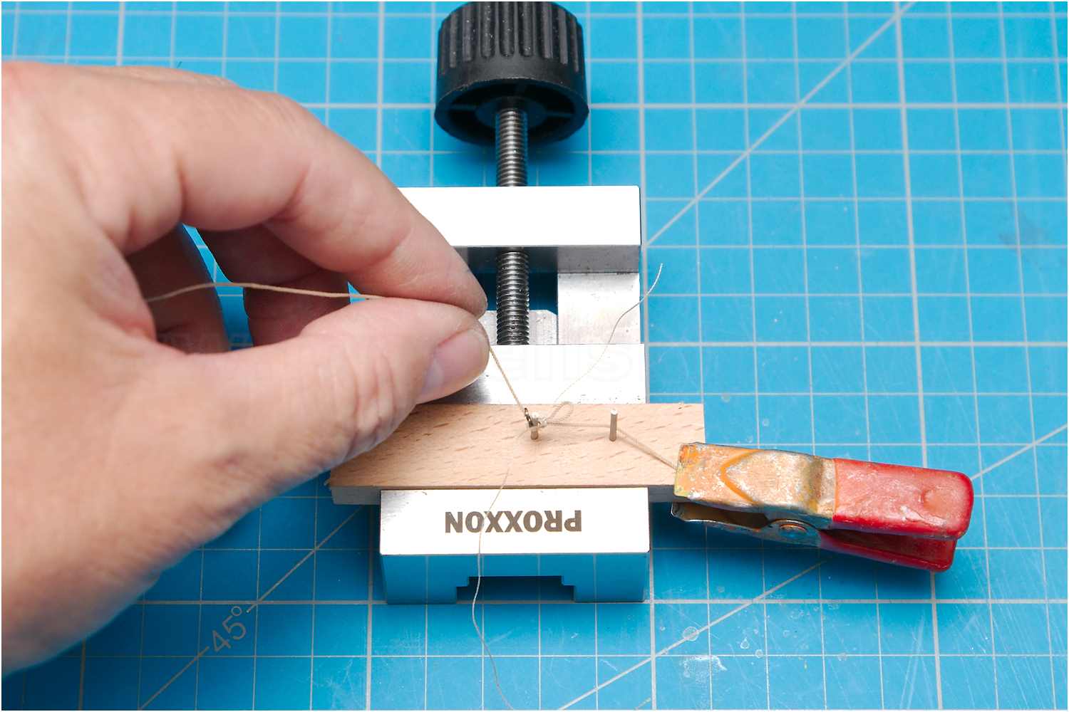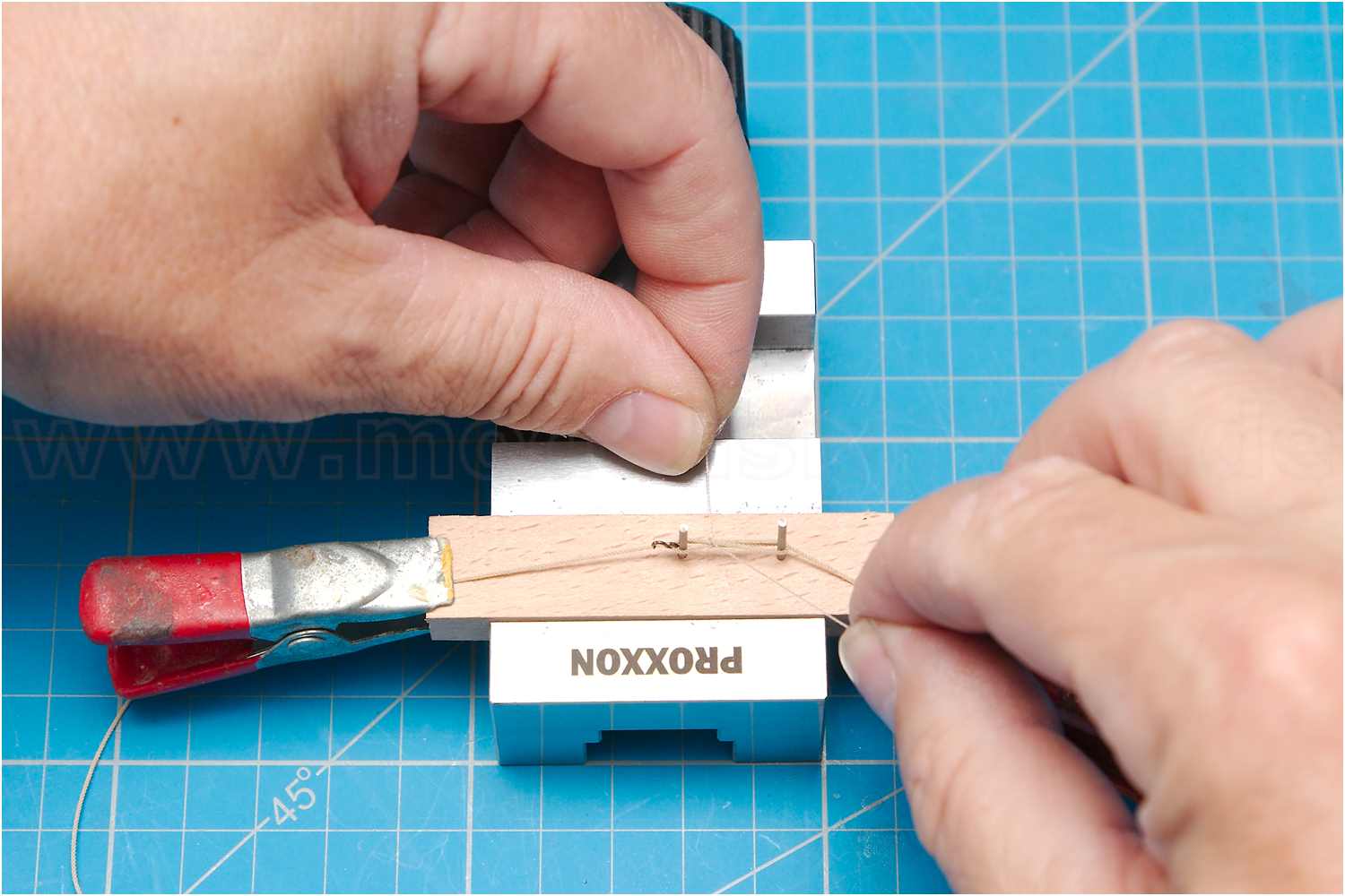 Dort klemme ich ein Ende das Taus ein, wickle es um die Messingstifte und tränke es mit Ballenmattierung.