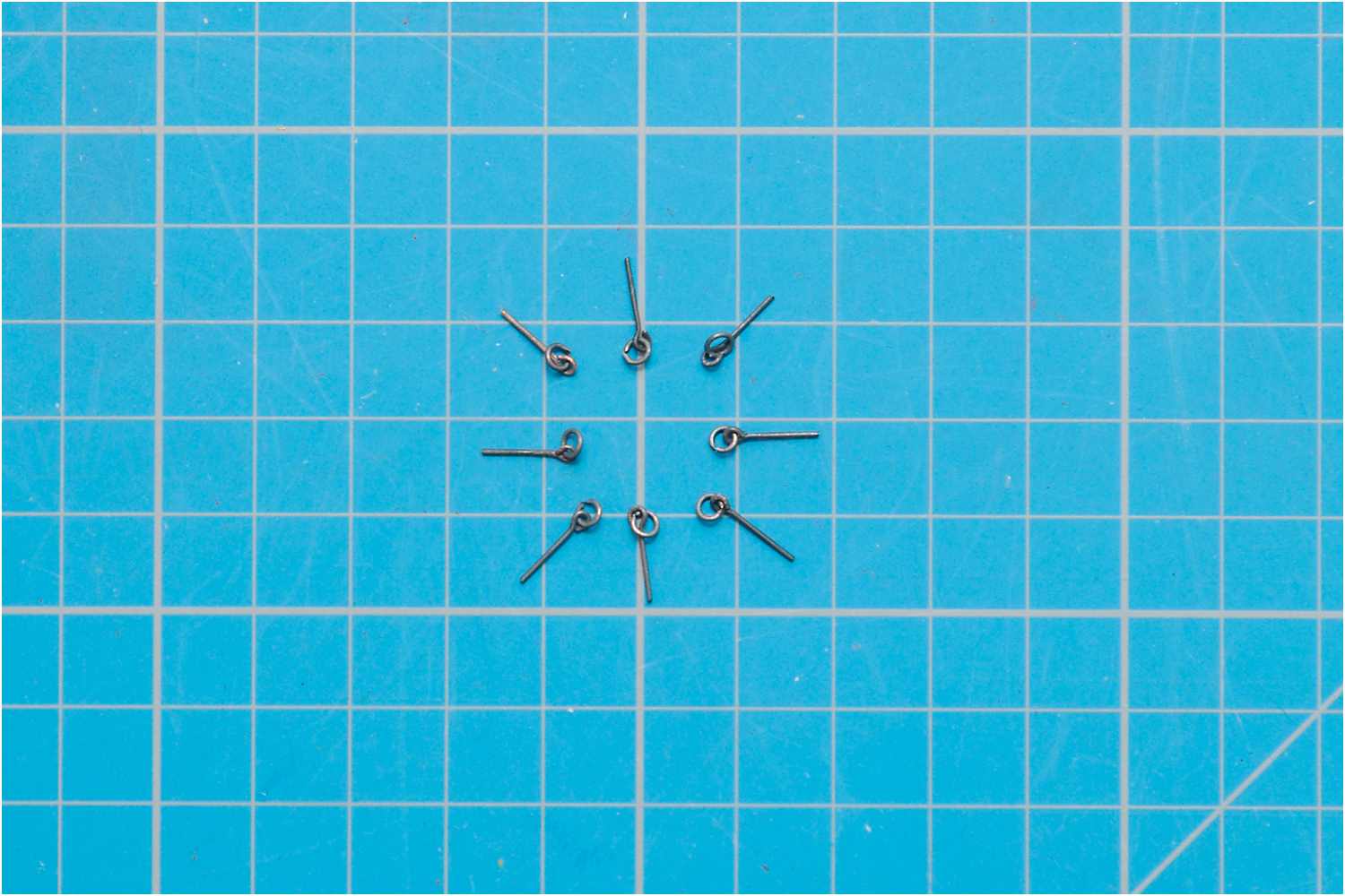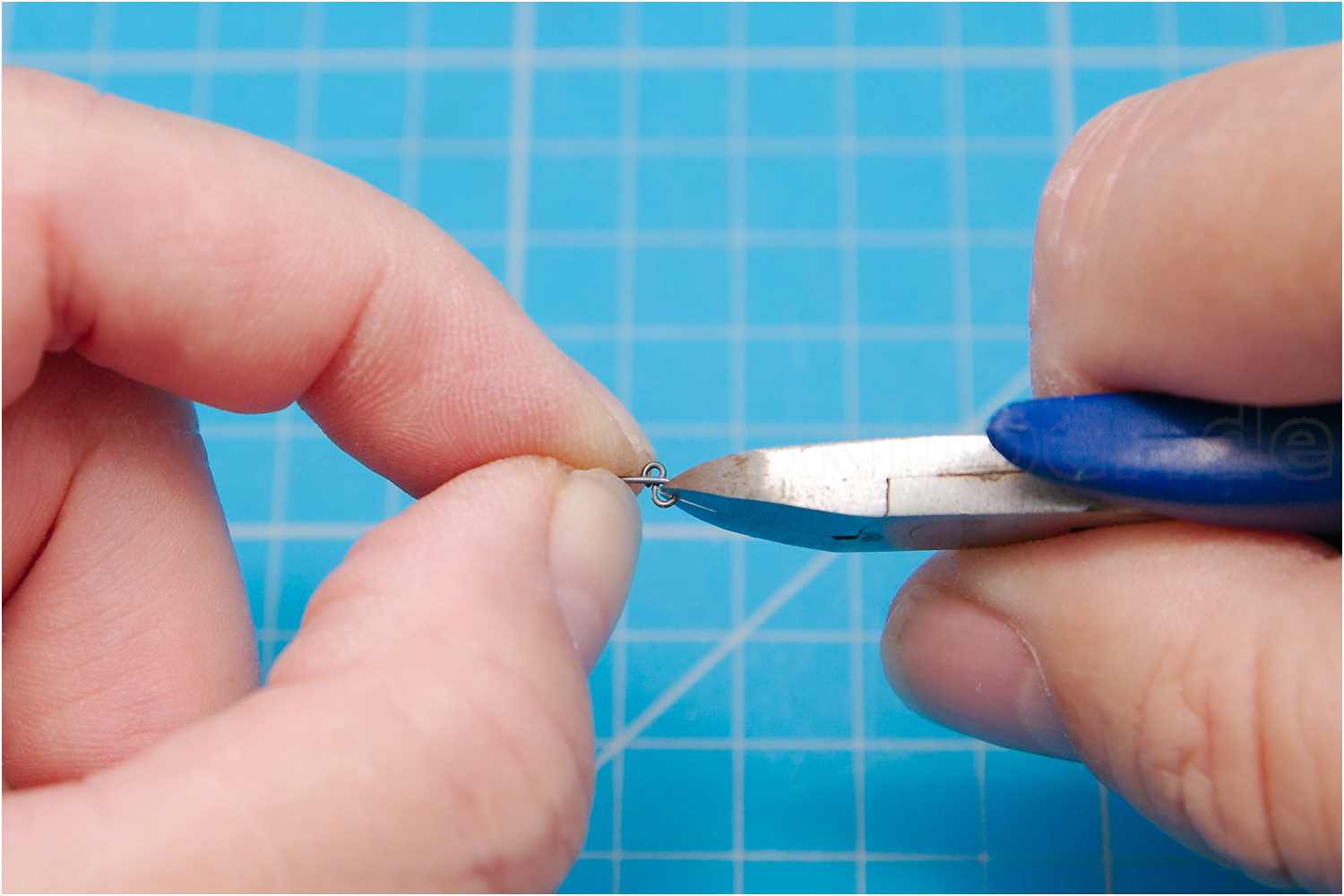 Um die Blöcke ist ein Stropp gelegt und ein Haken eingebunden. Die Haken habe ich aus 0,5 mm brüniertem Messingdraht gebogen.