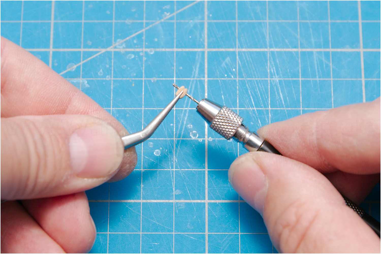 Entsprechend der Taustärke des Taljereeps habe ich das Loch des Scheibgatts 0,2 mm größer gebohrt. Um das Tau später problemlos durchfädeln zu können, ist das Ende mit Sekundenkleber versteift.