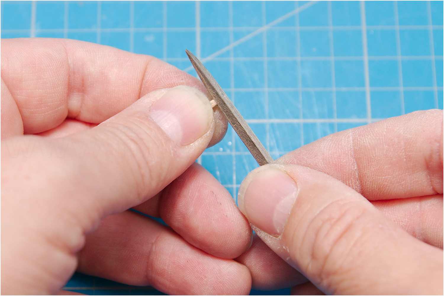 Hierfür habe ich ein Sperrholzrest mit Polystyrol beschichtet, in diese Platte zwei kurze Messingstifte eingeklebt und an der Stirnseite einen kleine Spalt eingesägt.