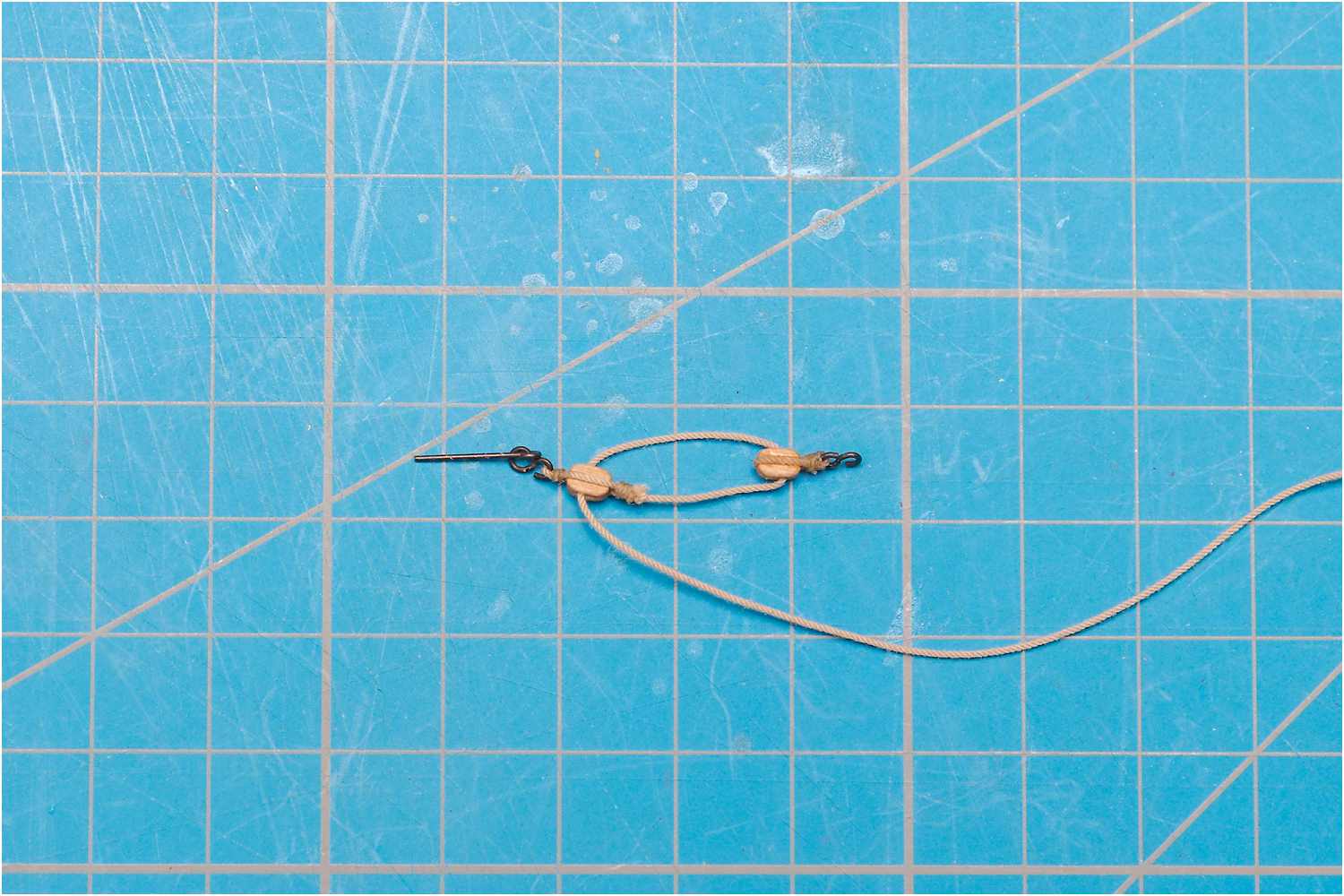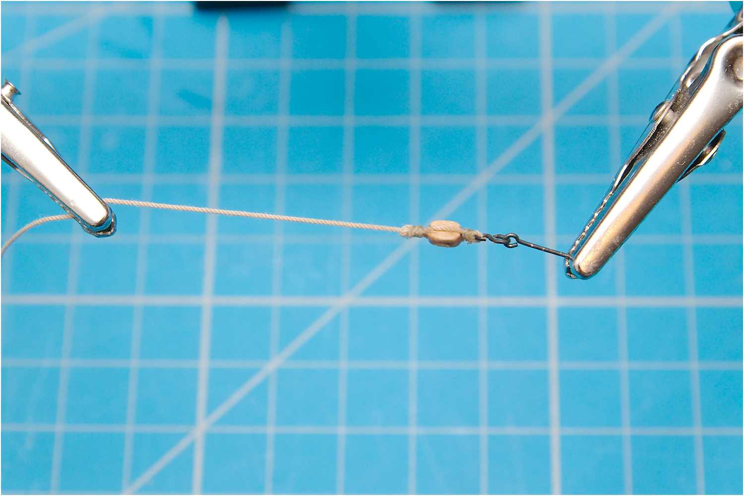 Mit 0,1 mm Garn wird nun auf das Reep ein Takling gesetzt. So erhalte ich zwei Schlaufen, eine für den Haken und die andere für den Block. Mit den Enden des Seils kann ich die Schlaufen zusammenziehen. Um identische Taklinge zu erhalten, habe ich diese immer mit 5 Schlägen gebunden.