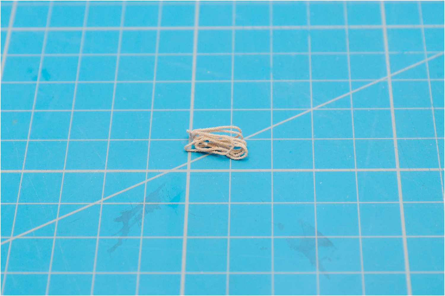 Nach dem Trocknen nehme ich es von der Vorrichtung und schneide aus dem Knäuel die notwendige Menge für drei Buchten ab, lege diese über das Ende des Taljenläufer und klebe es vorsichtig mit einer geringen Menge Sekundenkleber auf das Deck.