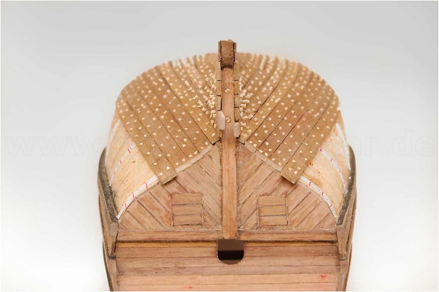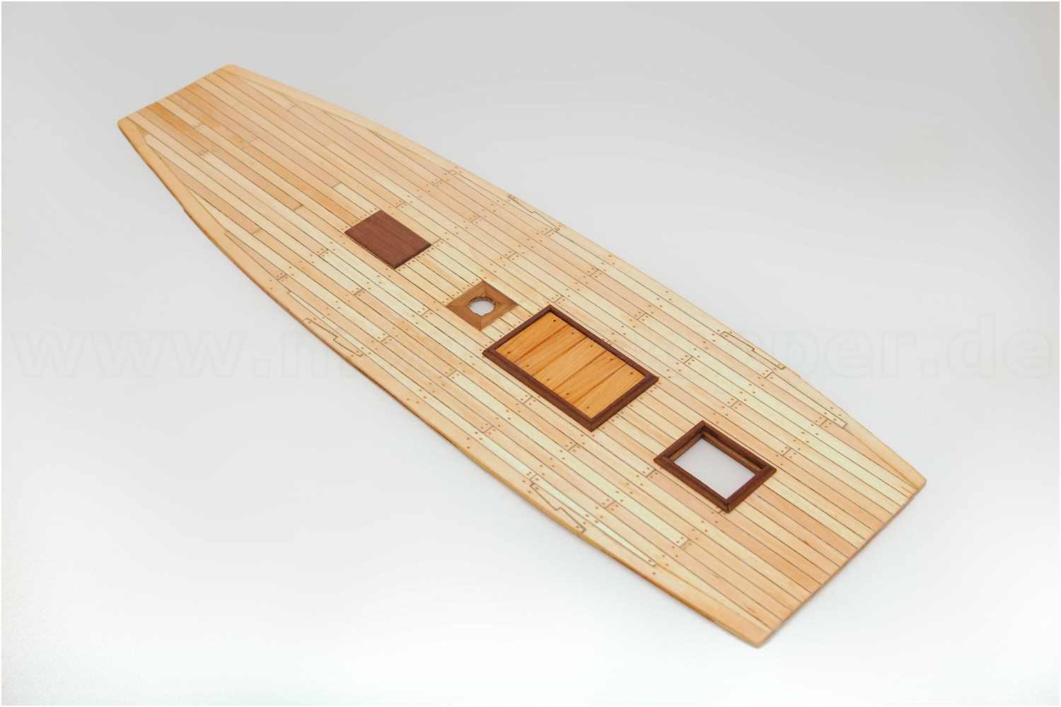• laut Bausatz ist keinerlei Beplankung vorgesehen, das Modell erhält jedoch eine Rumpfbeplankung aus Nussbaumholz und die Decks werden mit Linde realisiert,