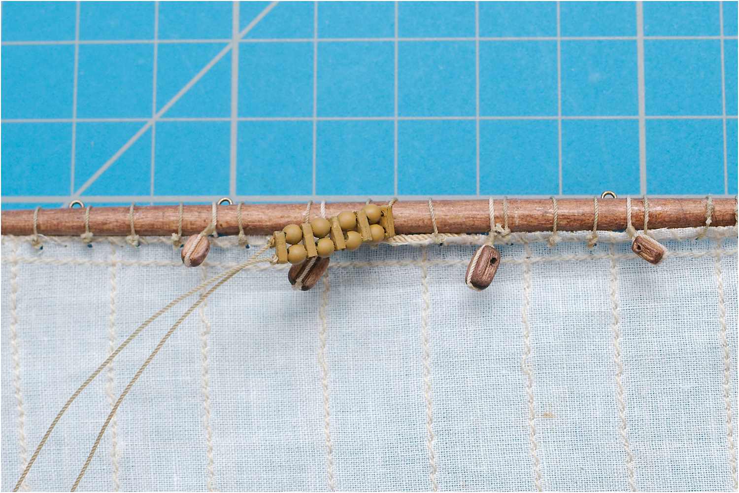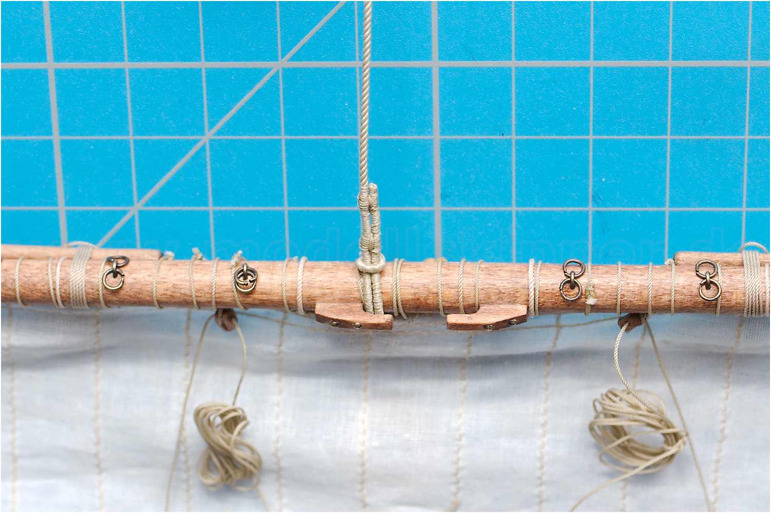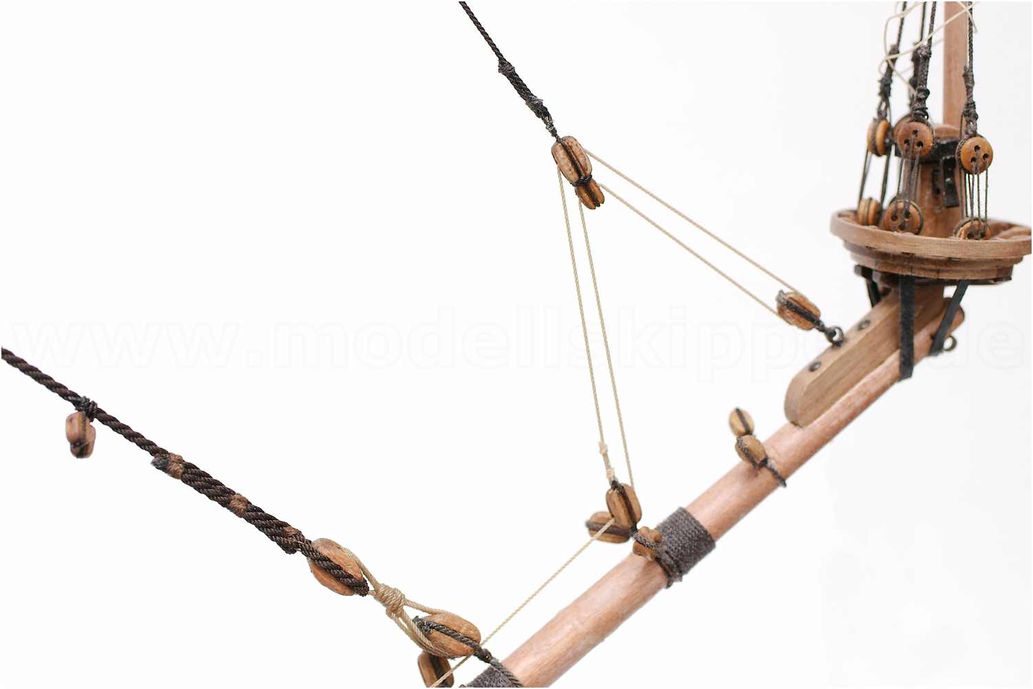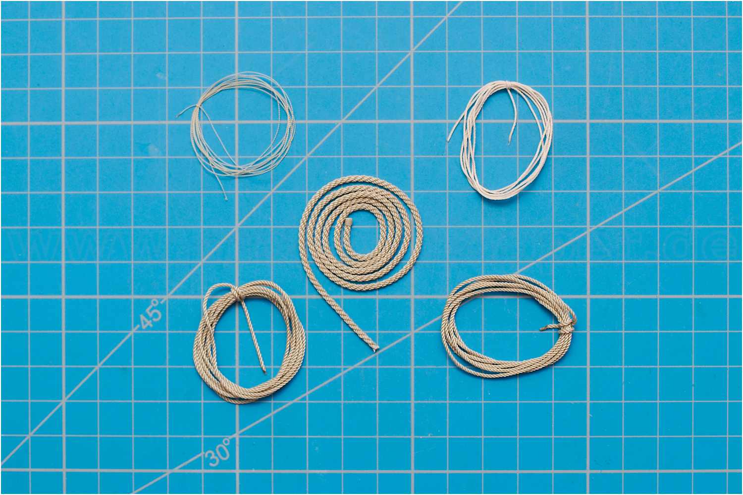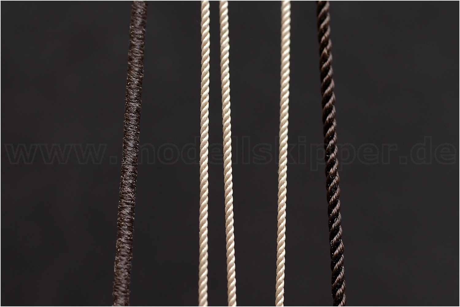 Für das laufende Gut nutze ich Garn der Fa. Gütermann vom Typ Mara, Skala oder Tera mit den unterschiedlichsten Fadenstärken von 30 bis 420, um entsprechend flexibel die notwendigen Taudurchmesser schlagen zu können. Ein Übersicht der Taue, die mit diesen Garnen geschlagen werden können, findet man hier.