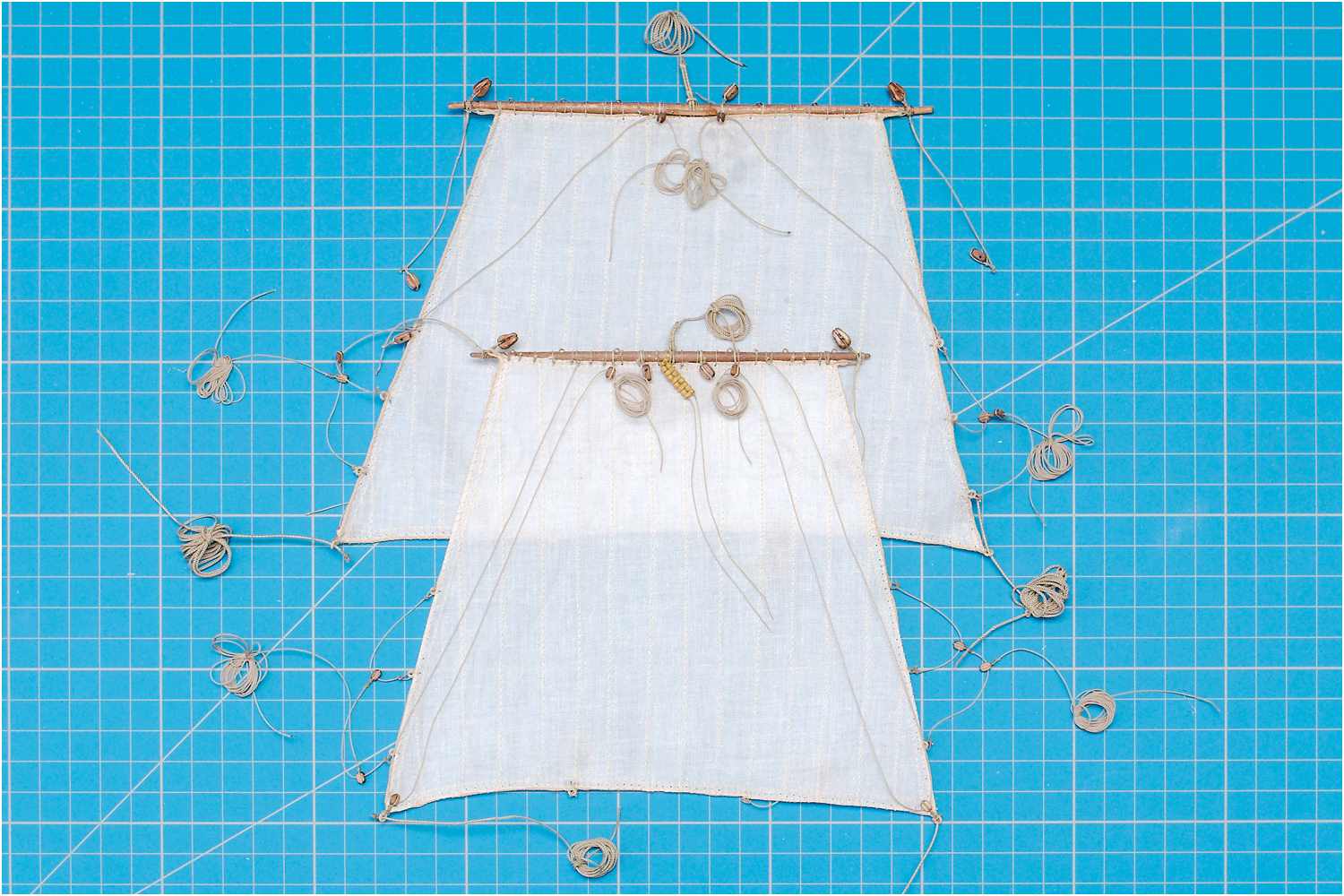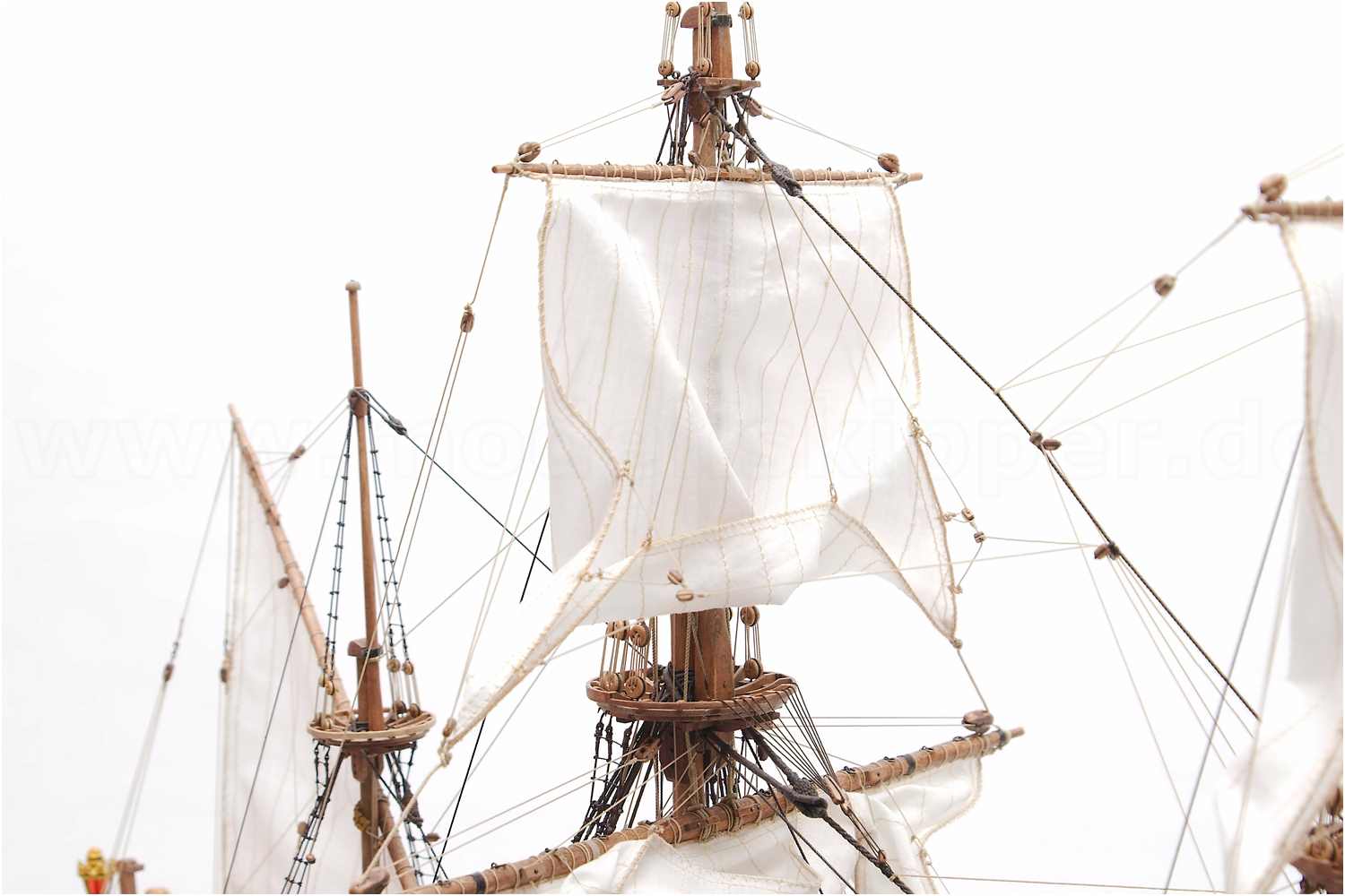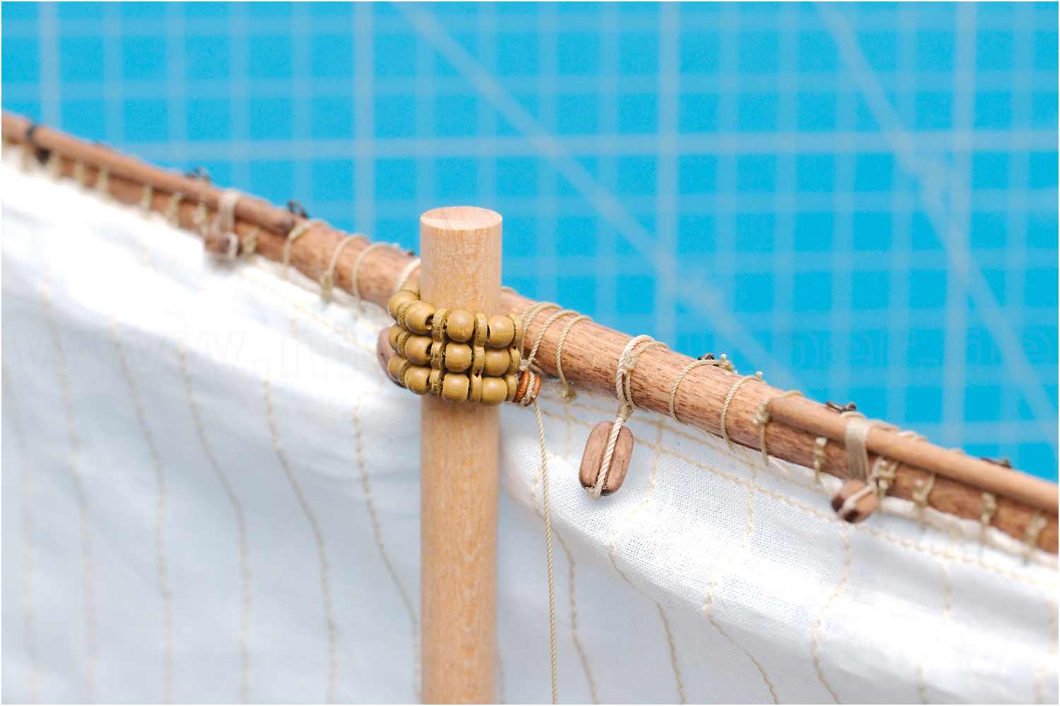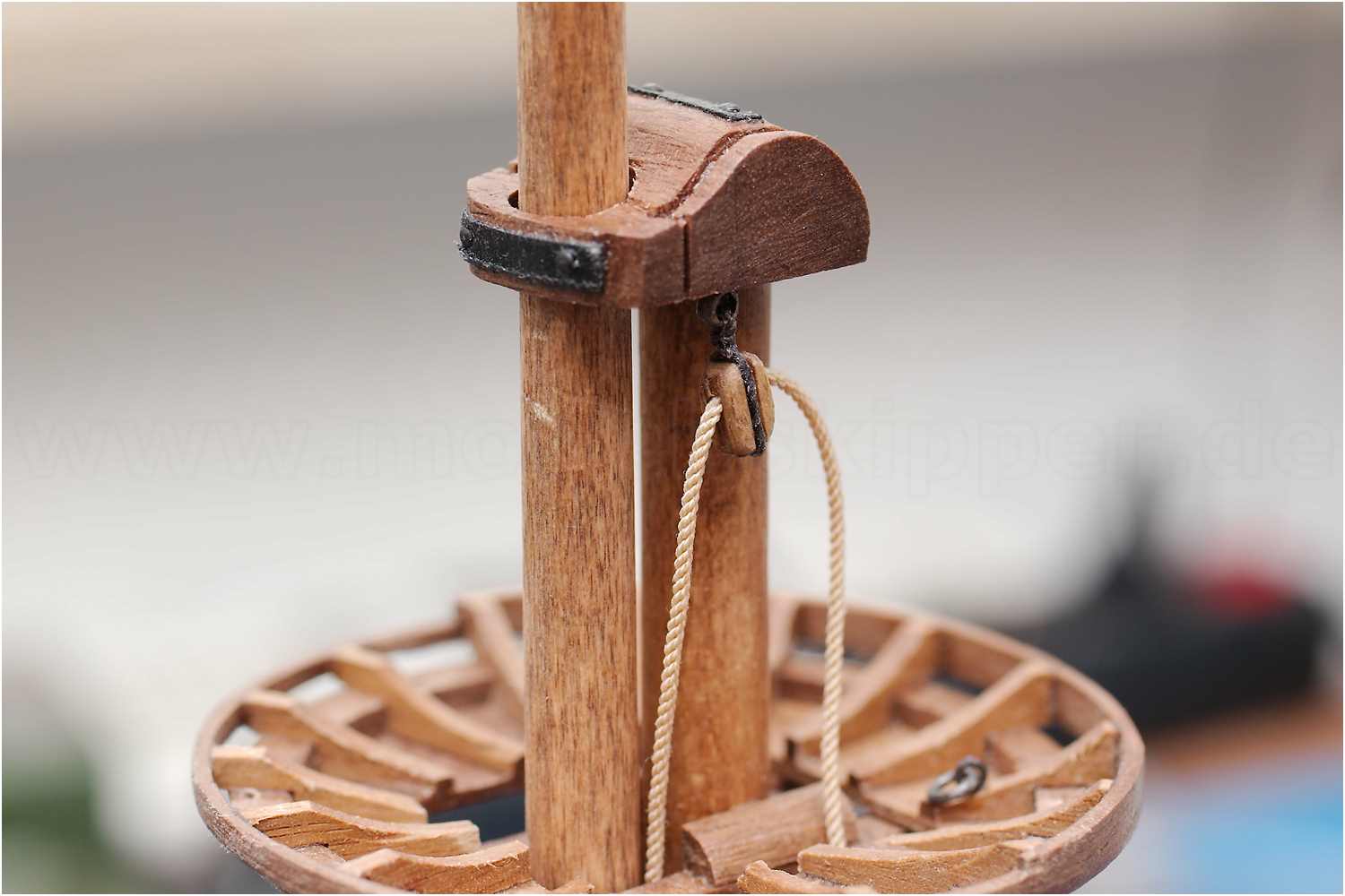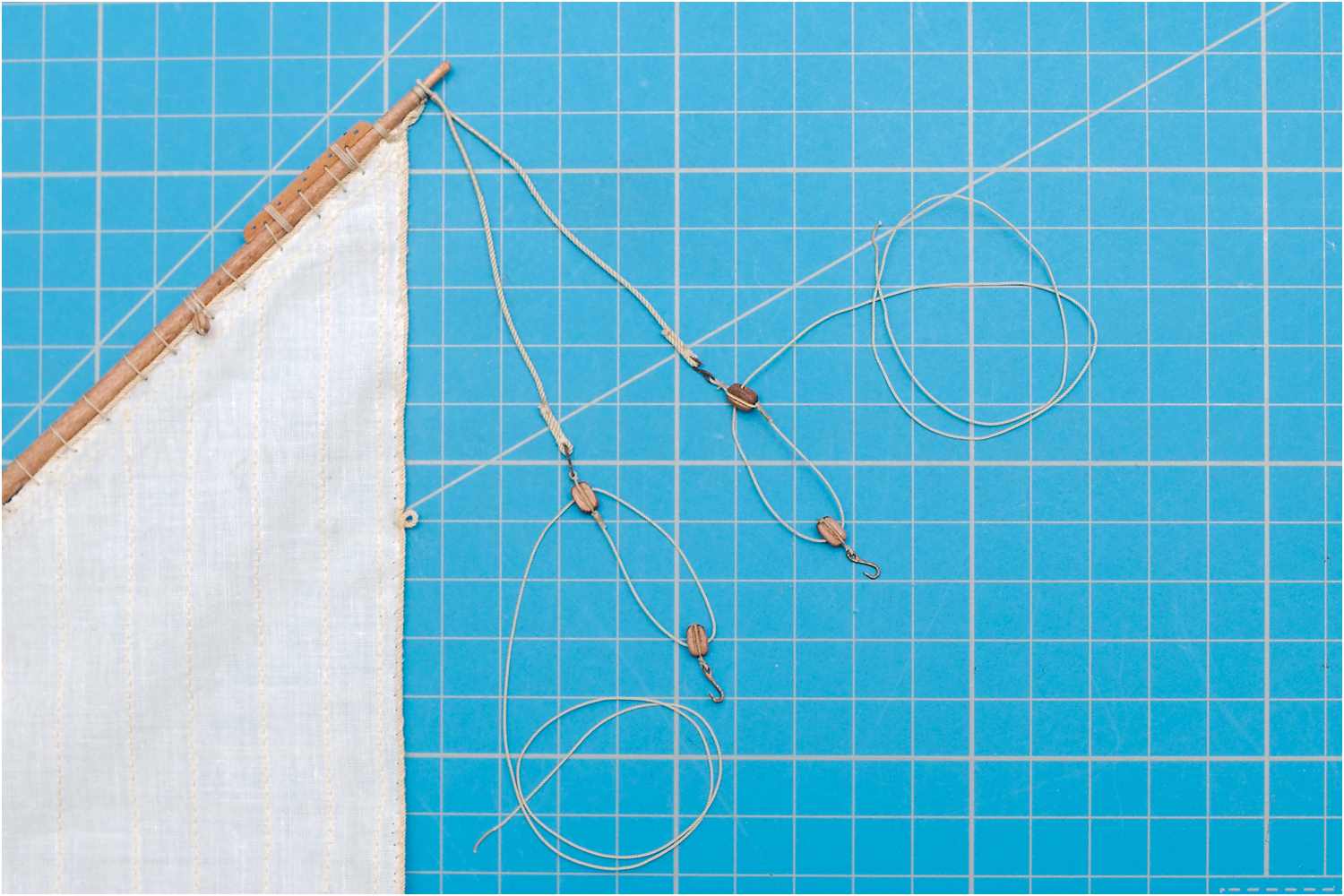 Für das laufende Gut nutze ich Garn der Fa. Gütermann vom Typ Mara, Skala oder Tera mit den unterschiedlichsten Fadenstärken von 30 bis 420, um entsprechend flexibel die notwendigen Taudurchmesser schlagen zu können. Ein Übersicht der Taue, die mit diesen Garnen geschlagen werden können, findet man hier.