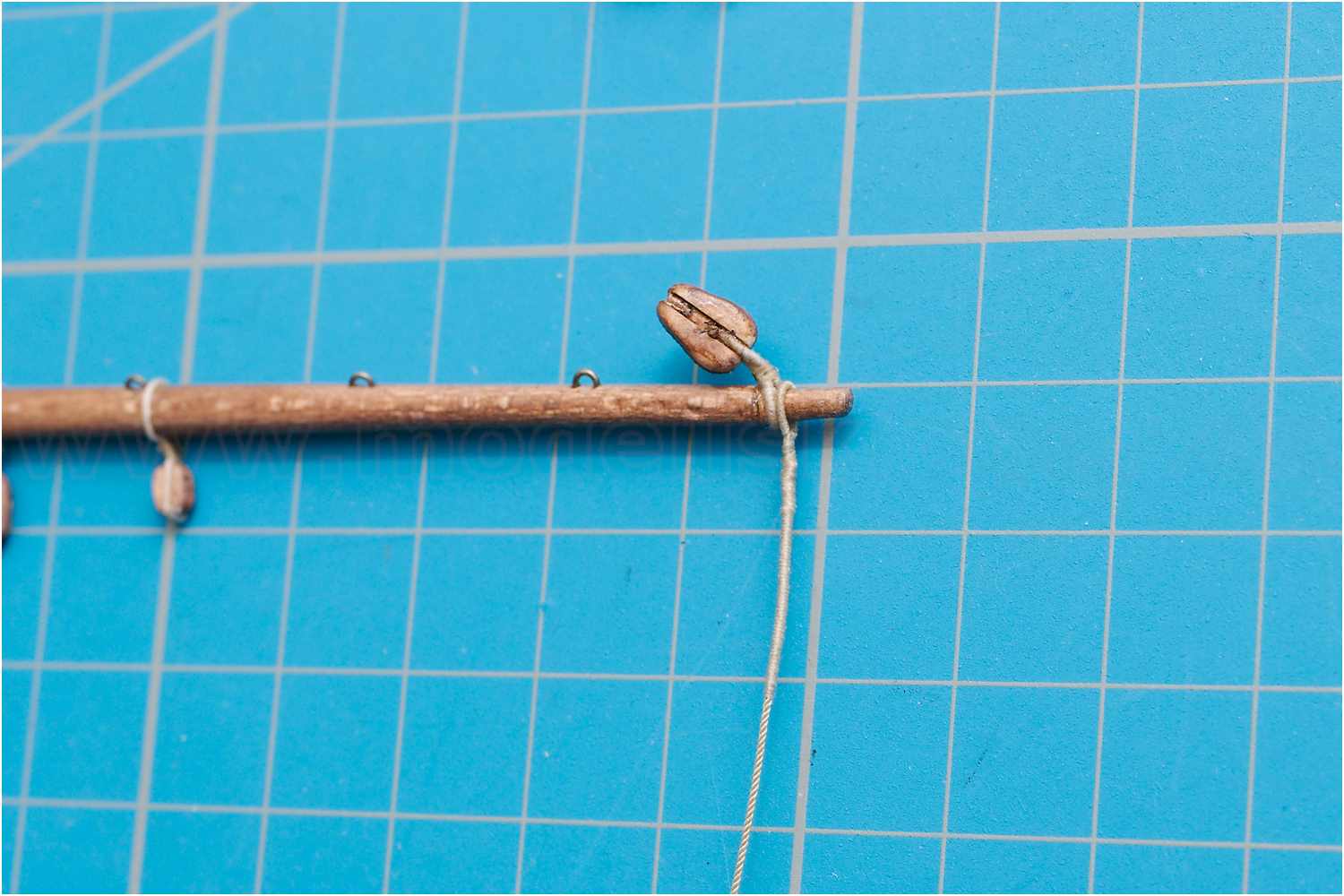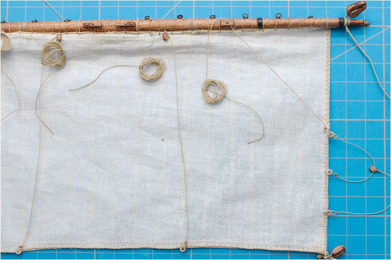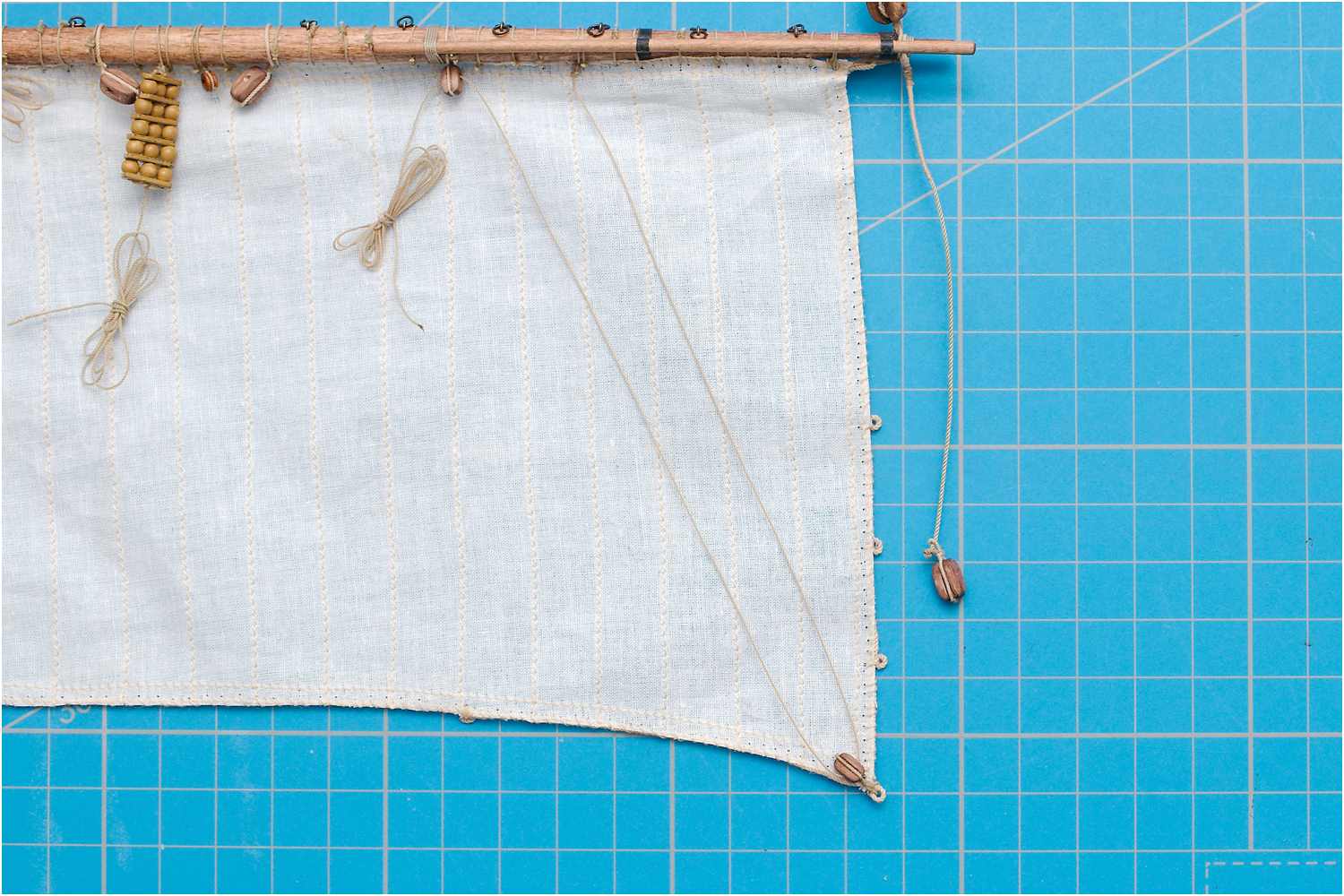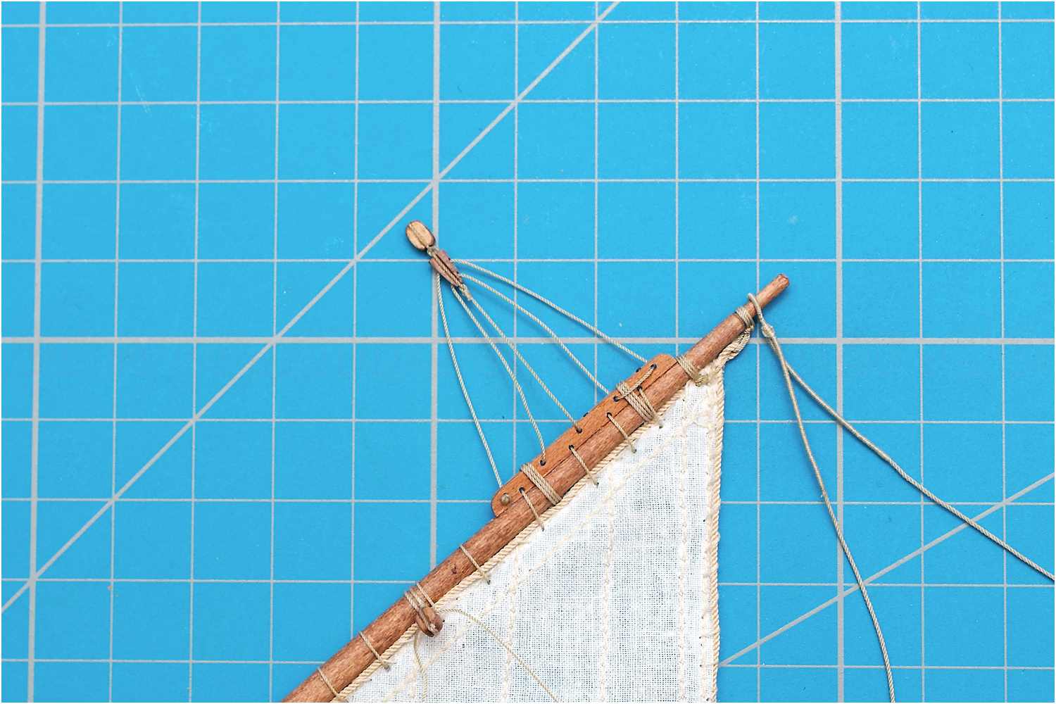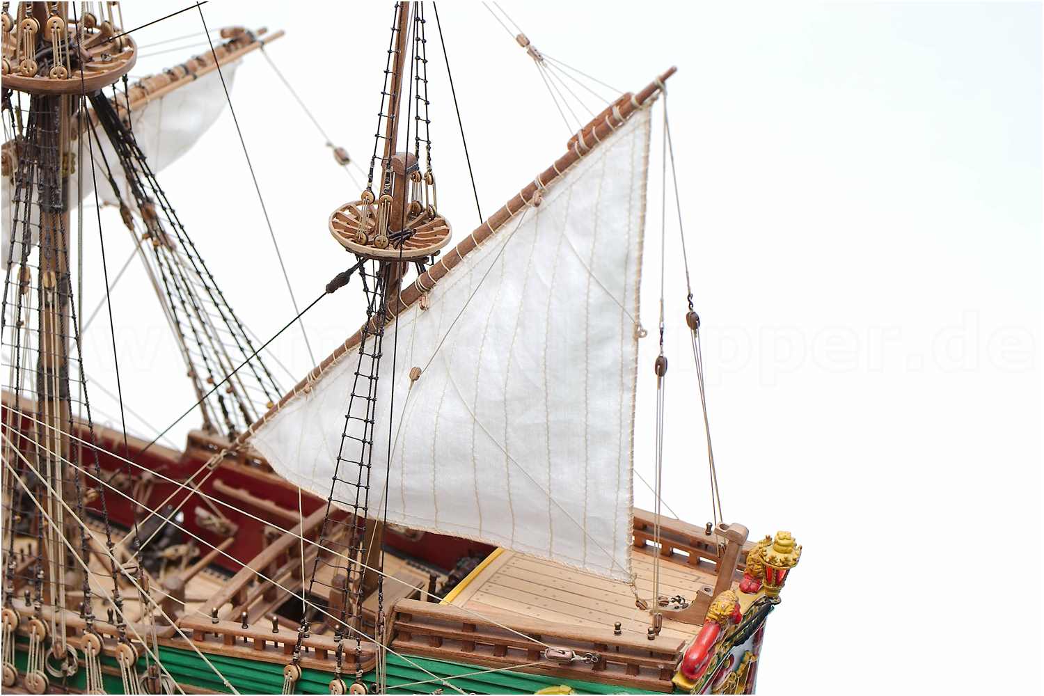 Für das laufende Gut nutze ich Garn der Fa. Gütermann vom Typ Mara, Skala oder Tera mit den unterschiedlichsten Fadenstärken von 30 bis 420, um entsprechend flexibel die notwendigen Taudurchmesser schlagen zu können. Ein Übersicht der Taue, die mit diesen Garnen geschlagen werden können, findet man hier.