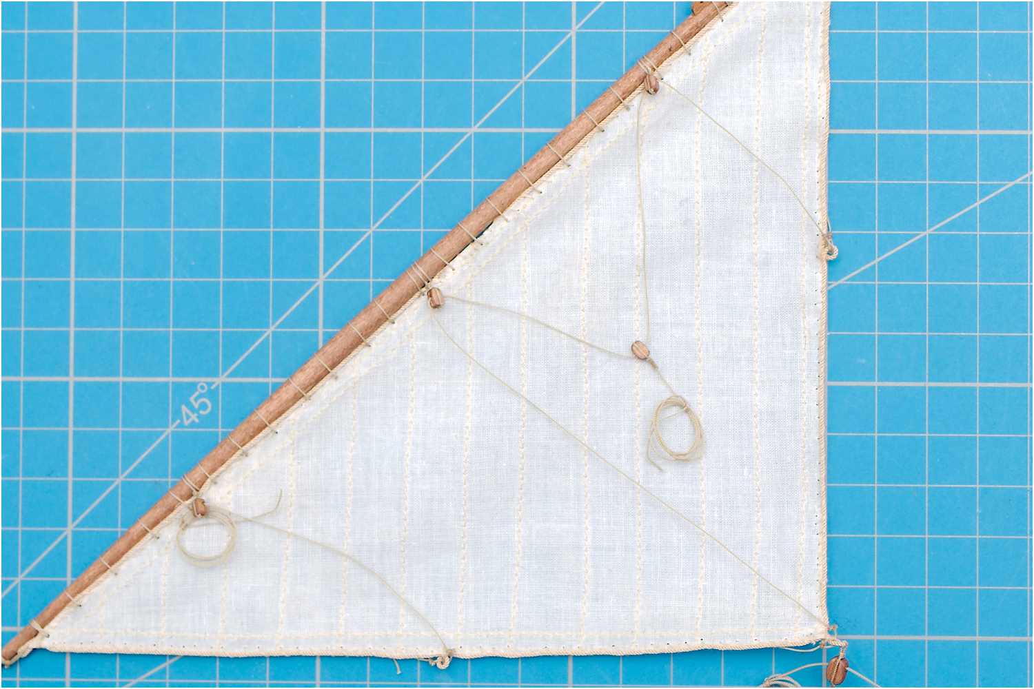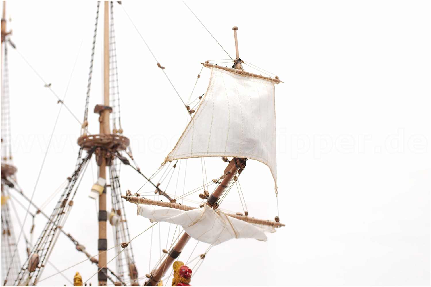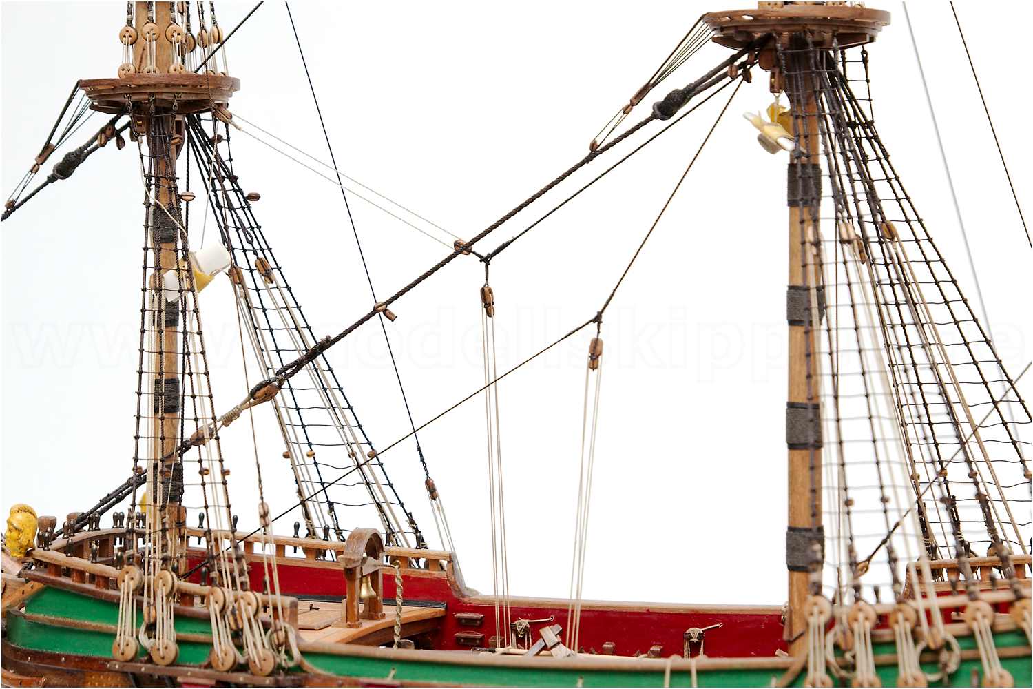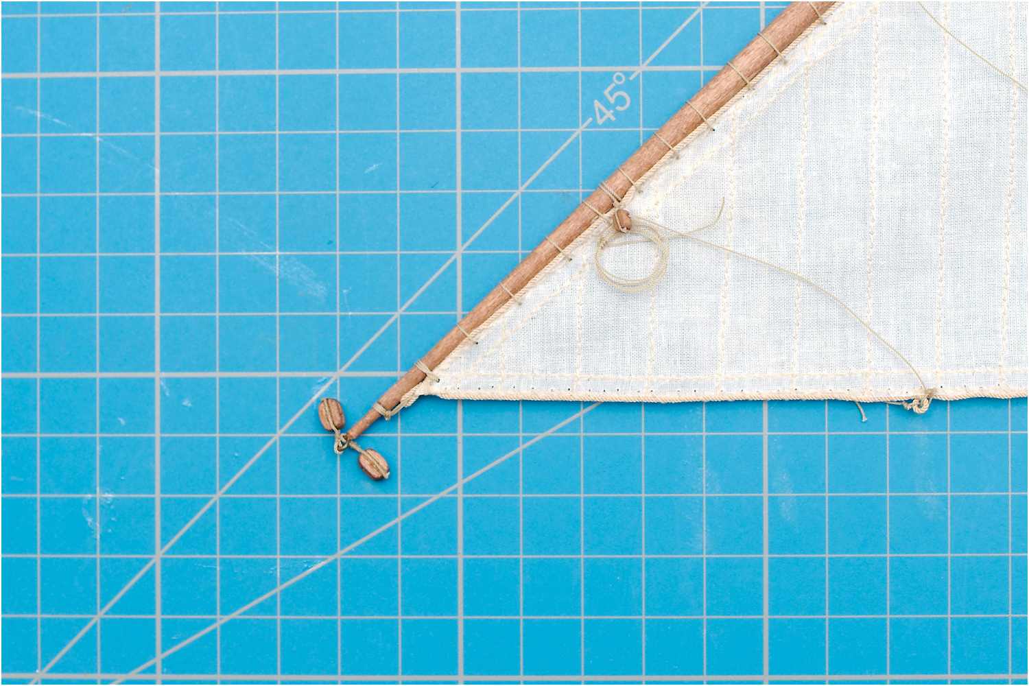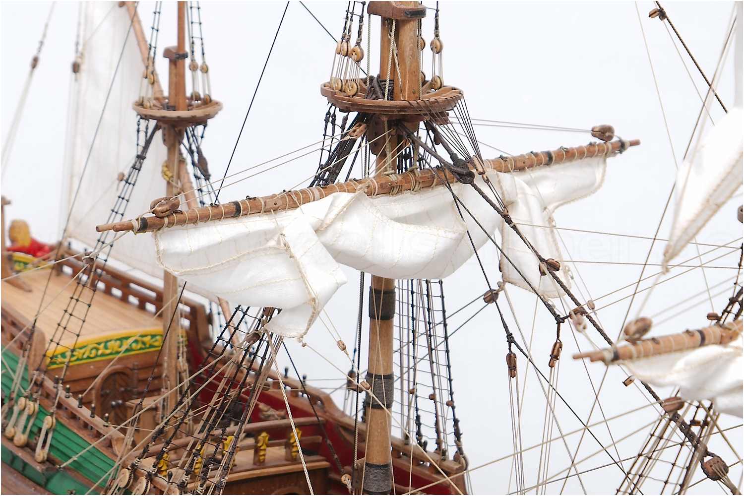 Für das laufende Gut nutze ich Garn der Fa. Gütermann vom Typ Mara, Skala oder Tera mit den unterschiedlichsten Fadenstärken von 30 bis 420, um entsprechend flexibel die notwendigen Taudurchmesser schlagen zu können. Ein Übersicht der Taue, die mit diesen Garnen geschlagen werden können, findet man hier.