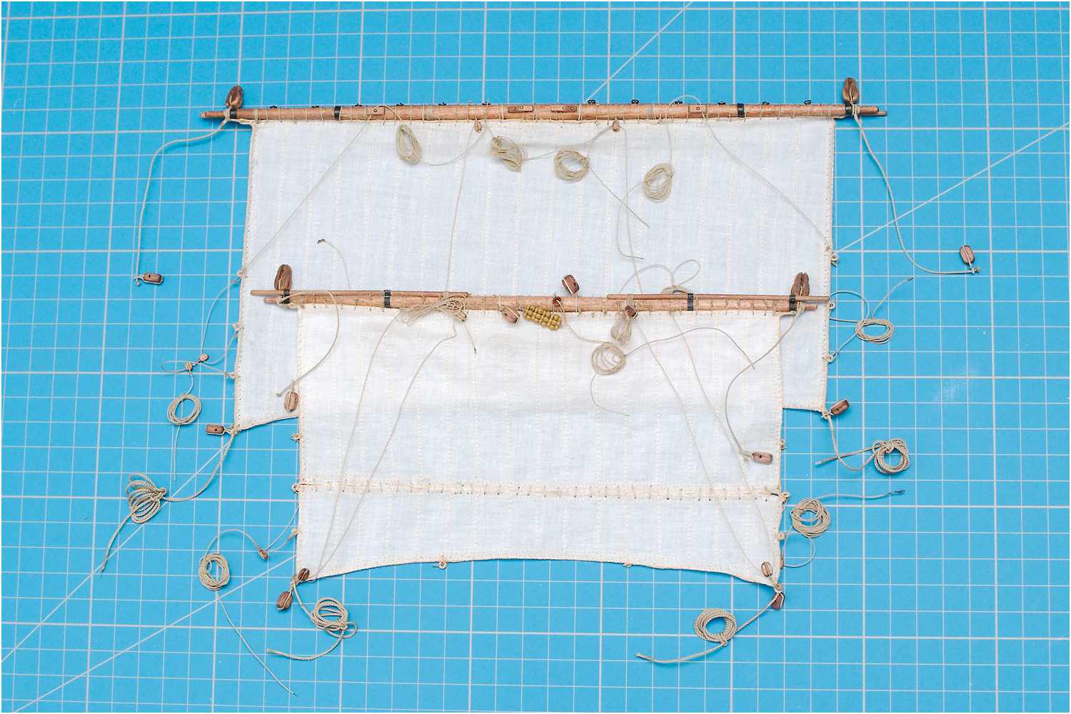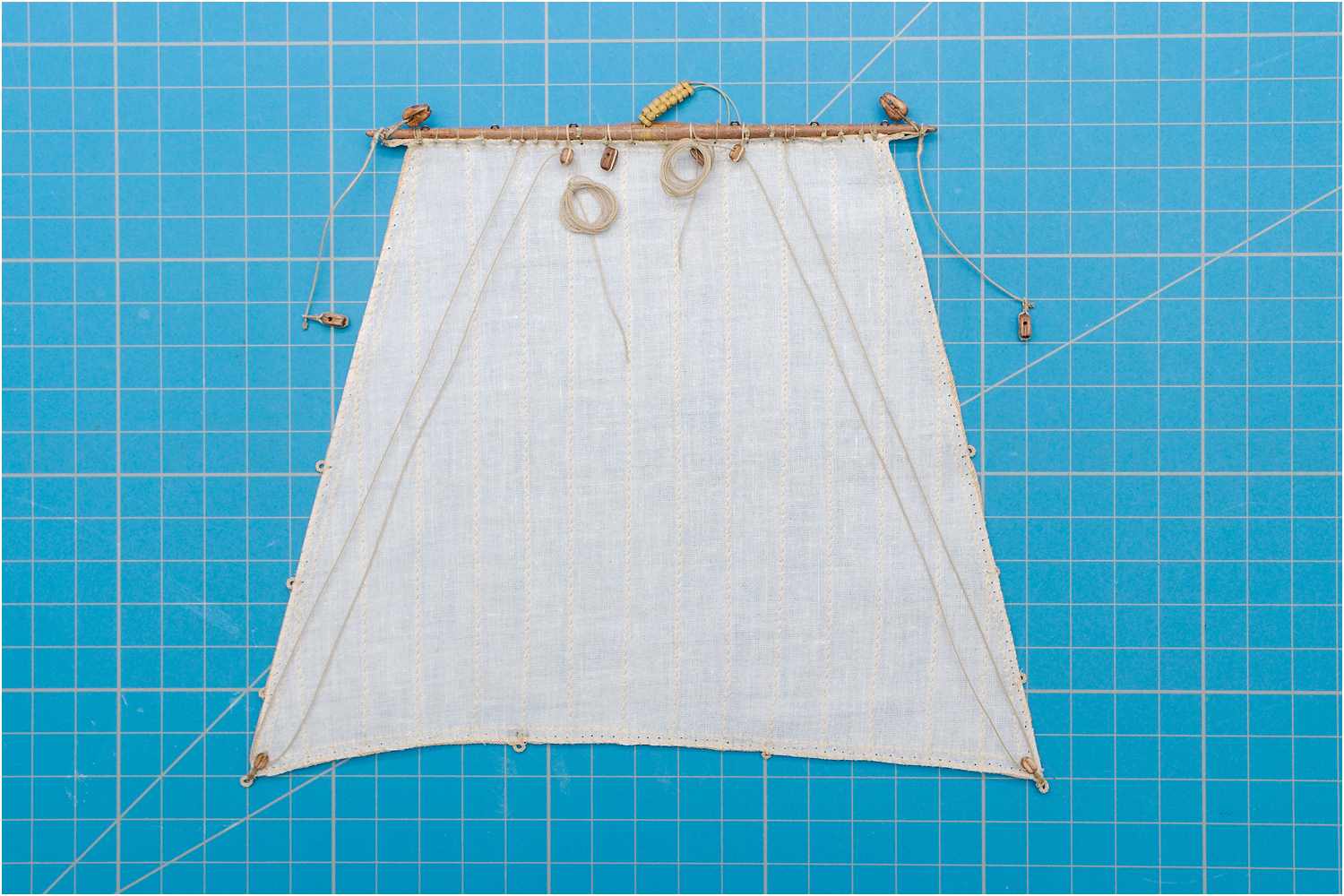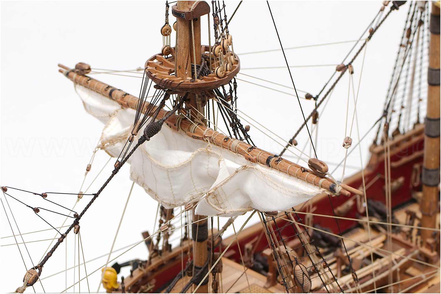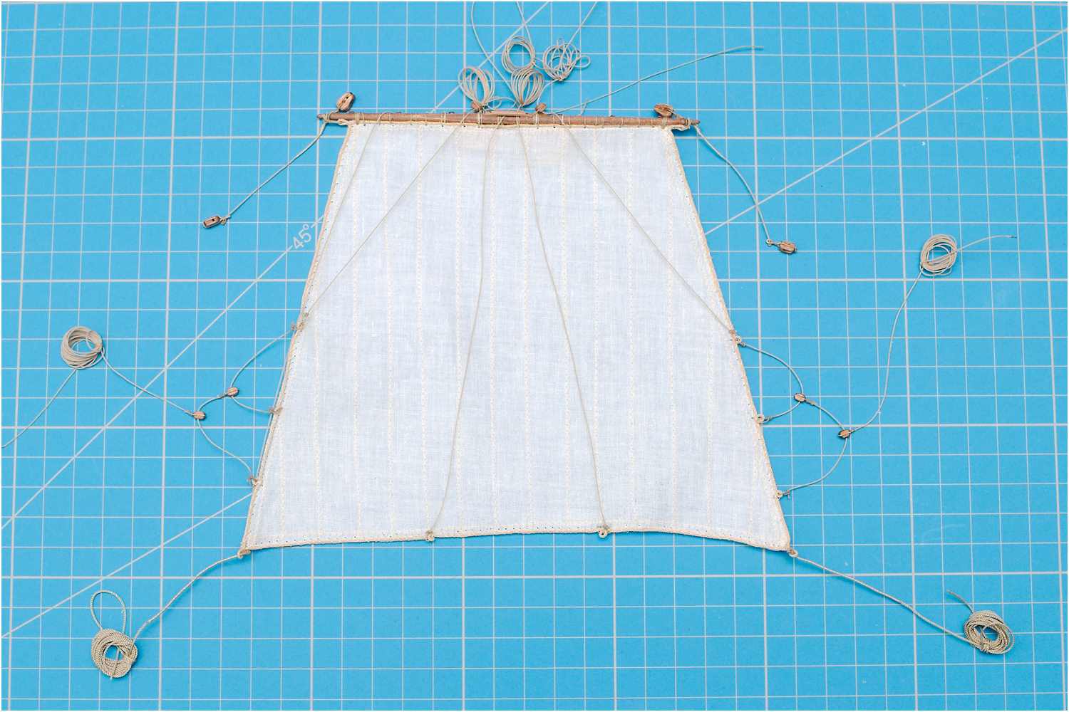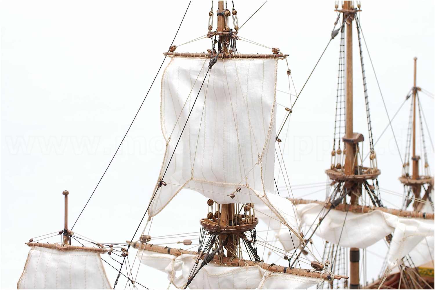 Für das laufende Gut nutze ich Garn der Fa. Gütermann vom Typ Mara, Skala oder Tera mit den unterschiedlichsten Fadenstärken von 30 bis 420, um entsprechend flexibel die notwendigen Taudurchmesser schlagen zu können. Ein Übersicht der Taue, die mit diesen Garnen geschlagen werden können, findet man hier.