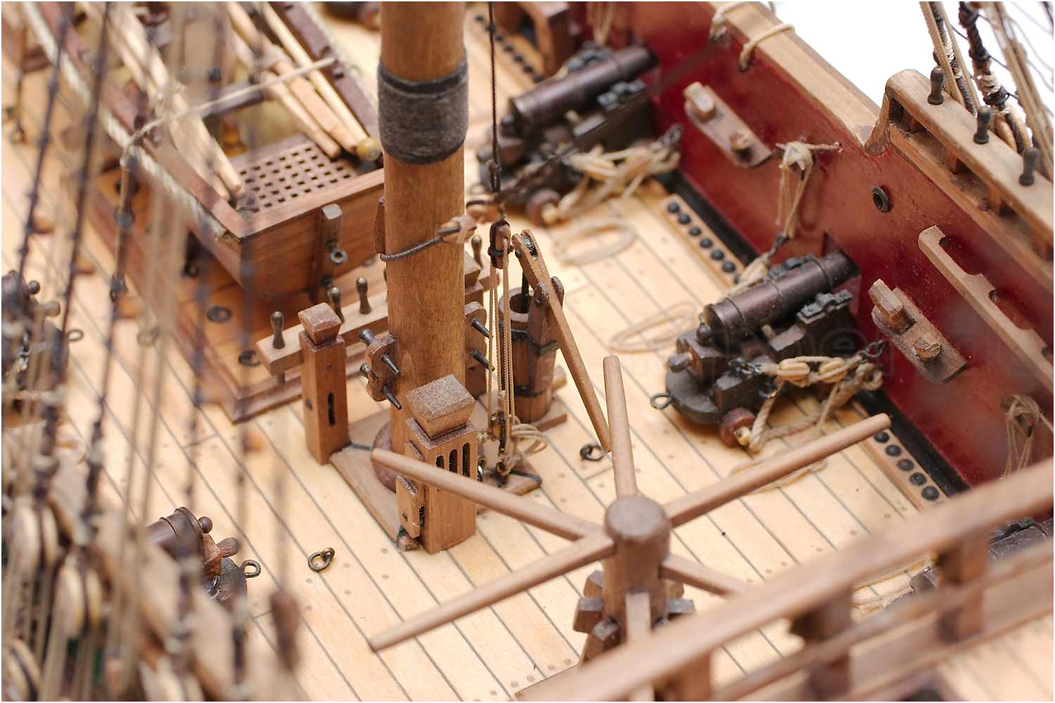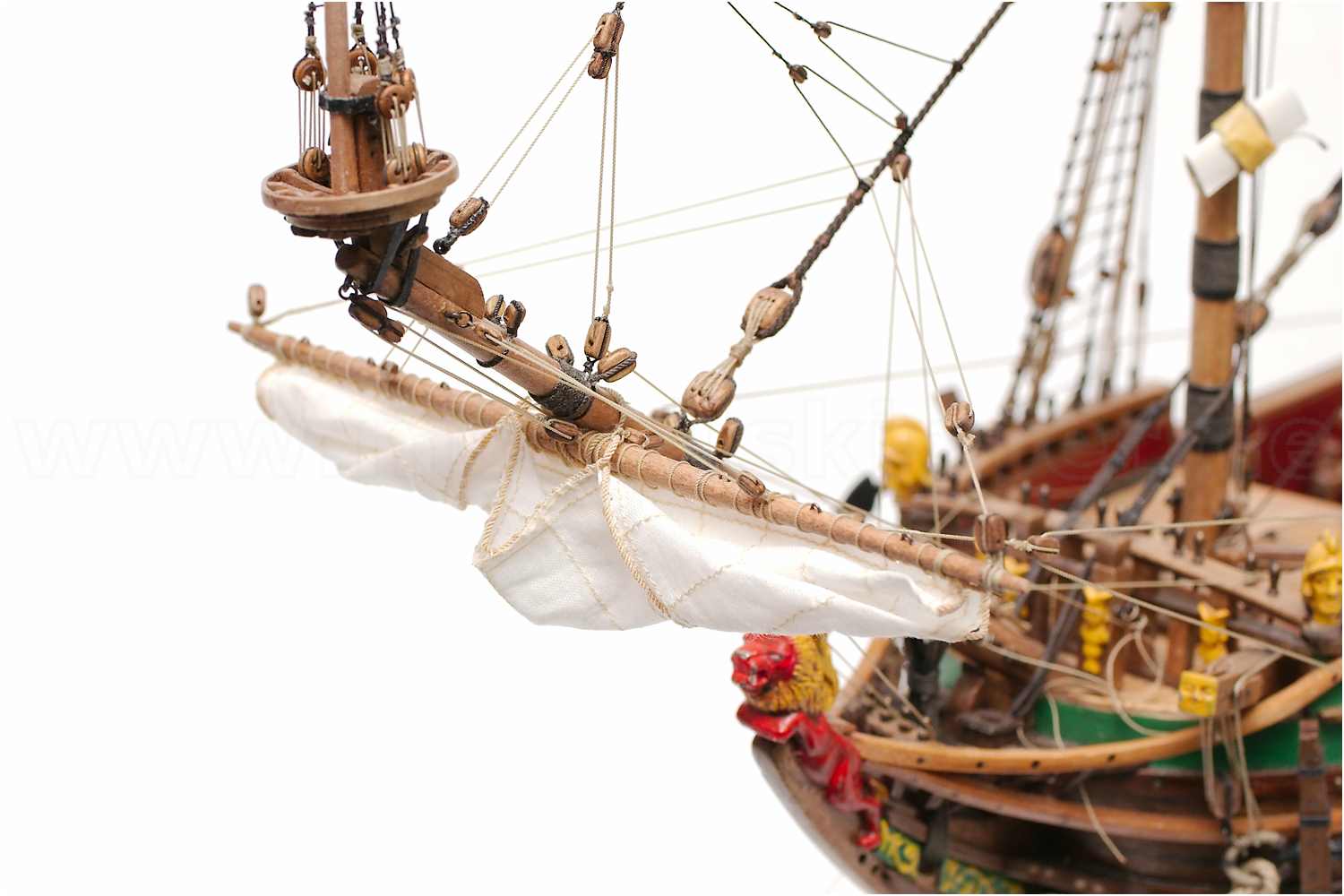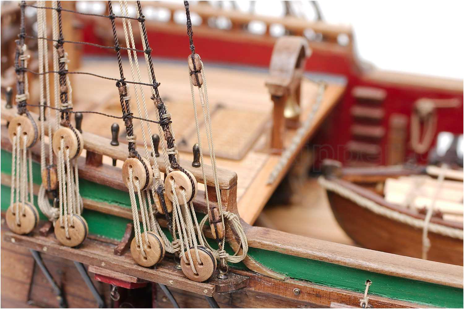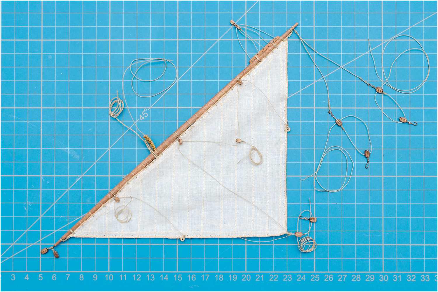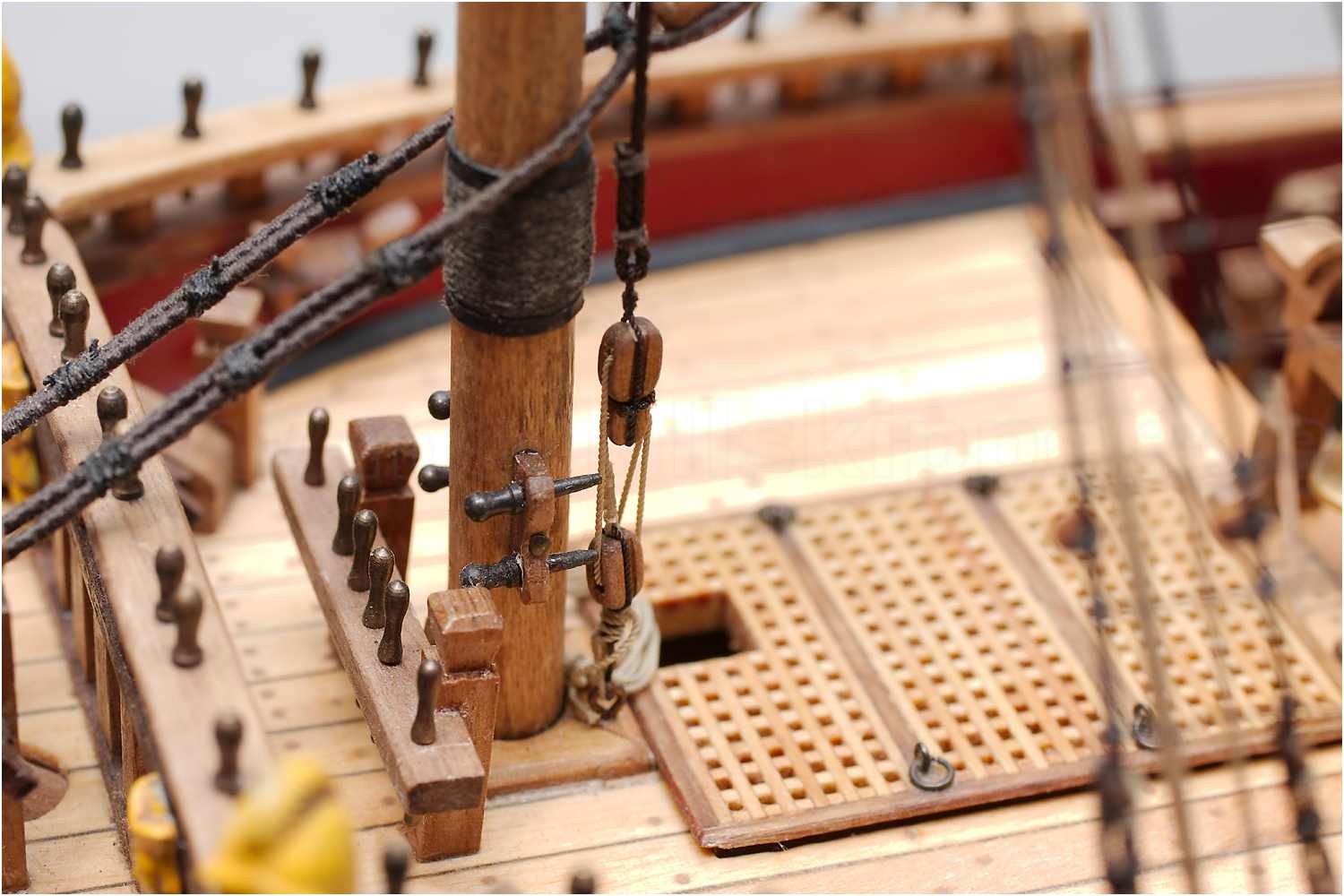 Für das laufende Gut nutze ich Garn der Fa. Gütermann vom Typ Mara, Skala oder Tera mit den unterschiedlichsten Fadenstärken von 30 bis 420, um entsprechend flexibel die notwendigen Taudurchmesser schlagen zu können. Ein Übersicht der Taue, die mit diesen Garnen geschlagen werden können, findet man hier.